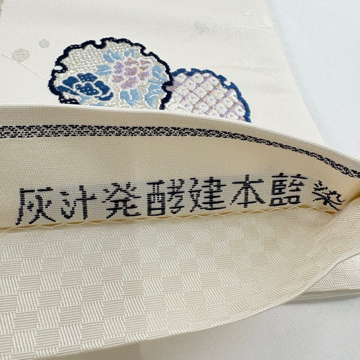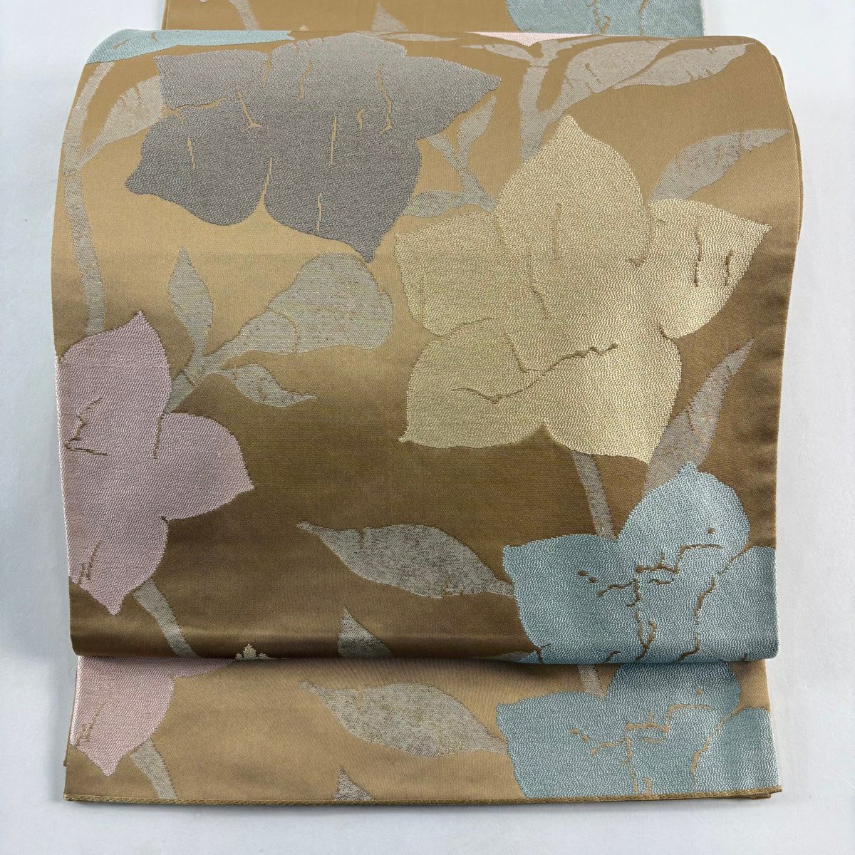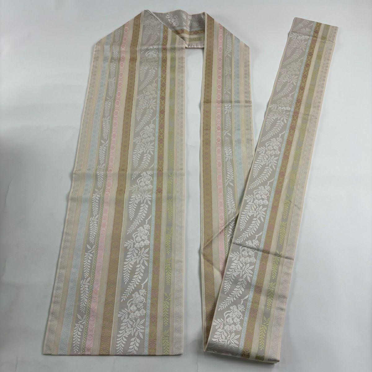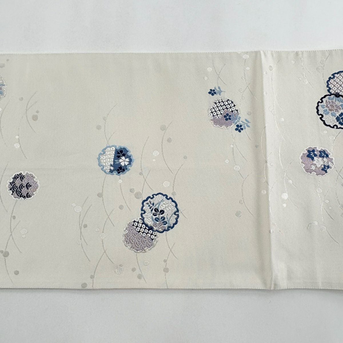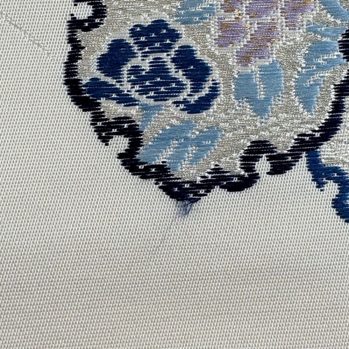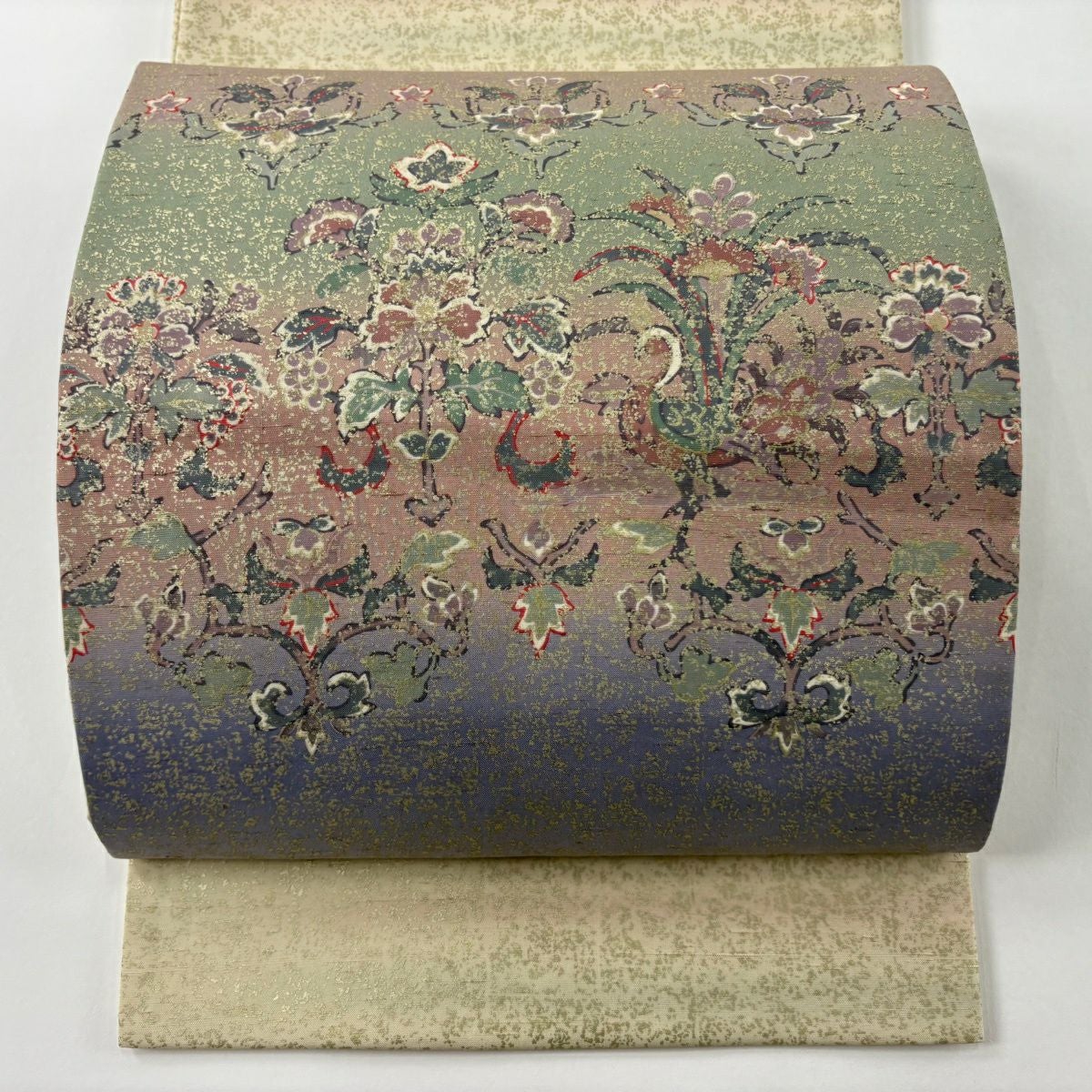 【在庫一掃】 袋帯 逸品 証紙あり 草花 花菱 唐織 クリーム 六通 正絹
