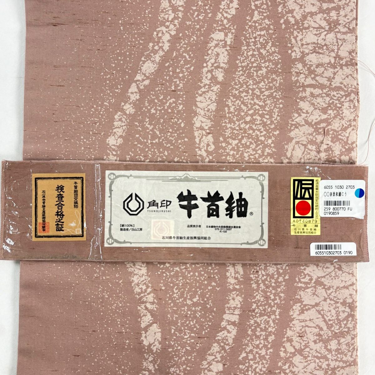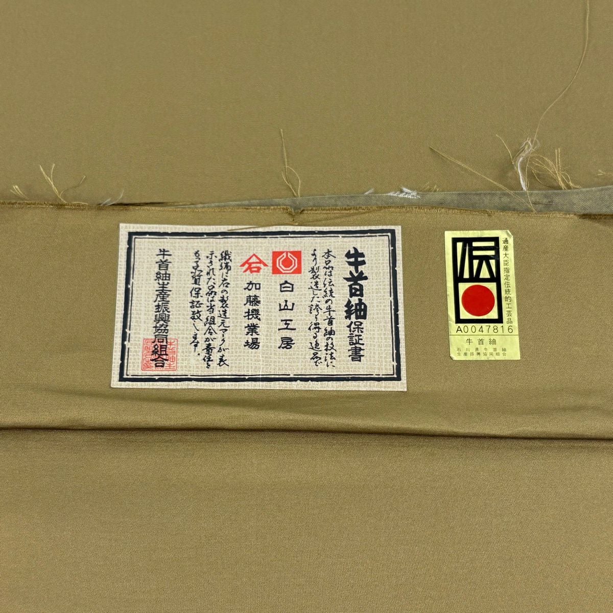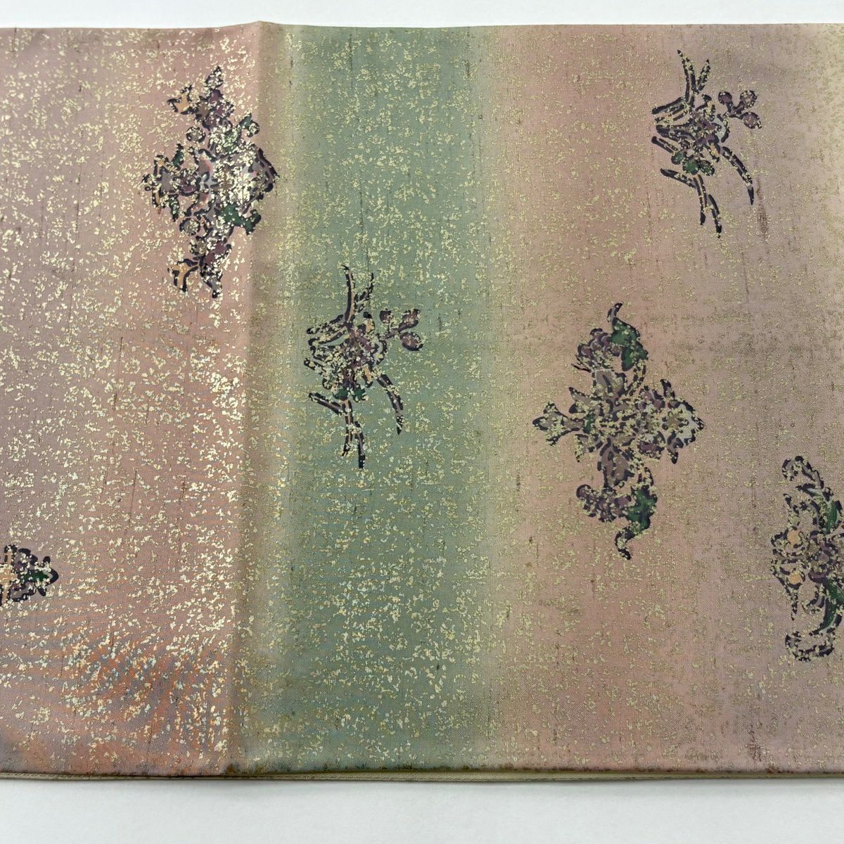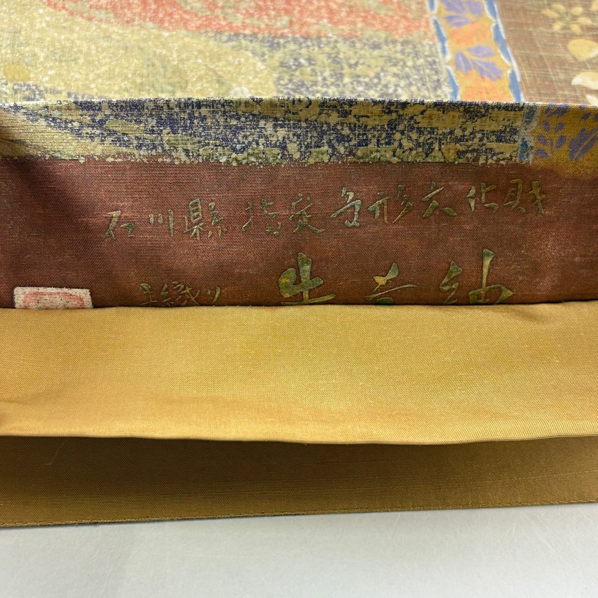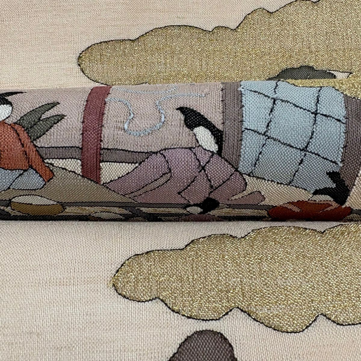 袋帯 逸品 落款あり 牛首紬 草花 霞 金彩 ベージュ お太鼓柄 正絹