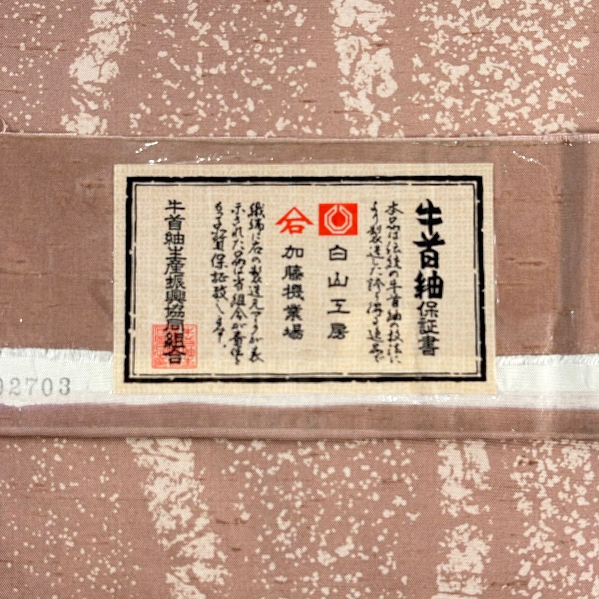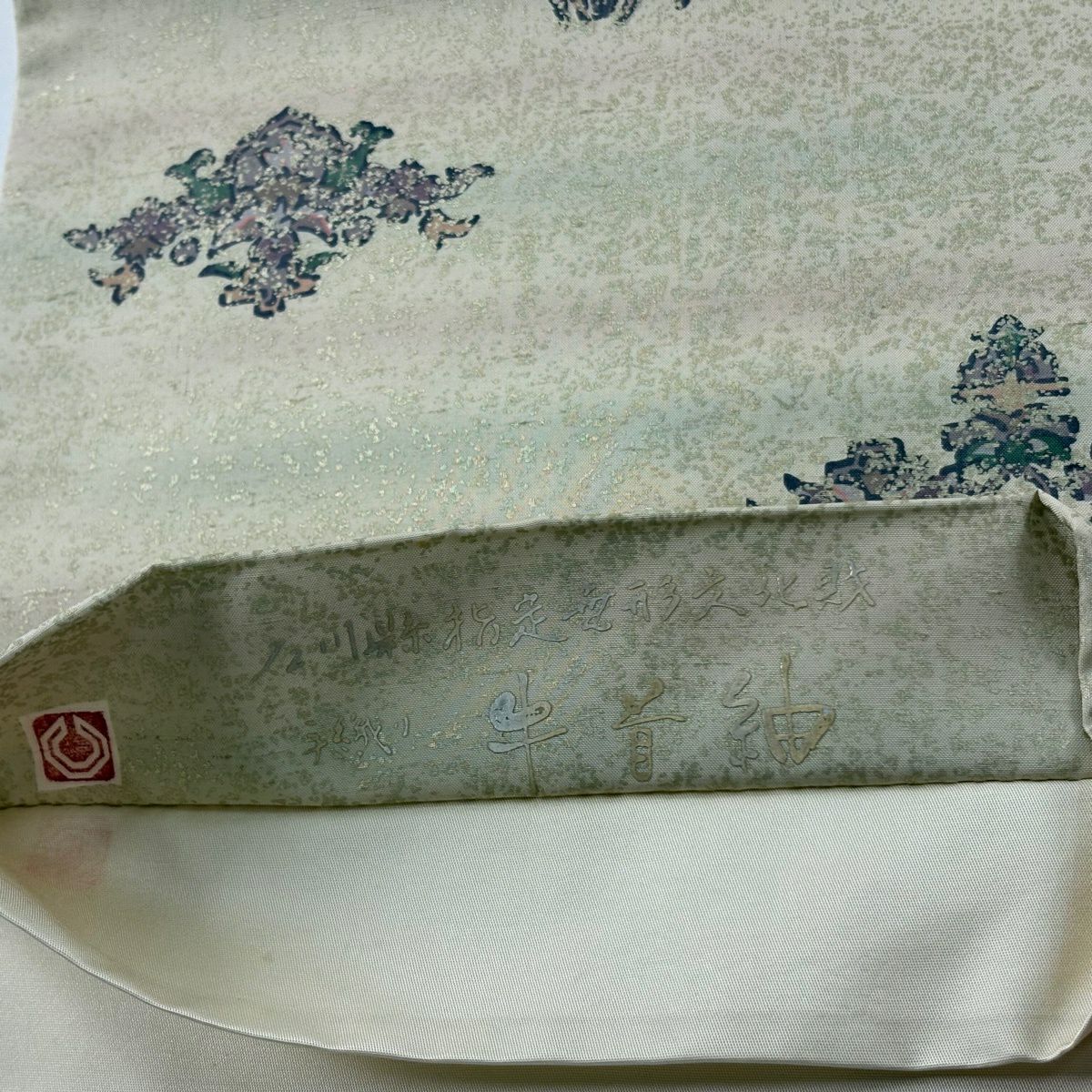 袋帯 逸品 落款あり 牛首紬地 草花 霞 金銀彩 ベージュ 全通 正絹