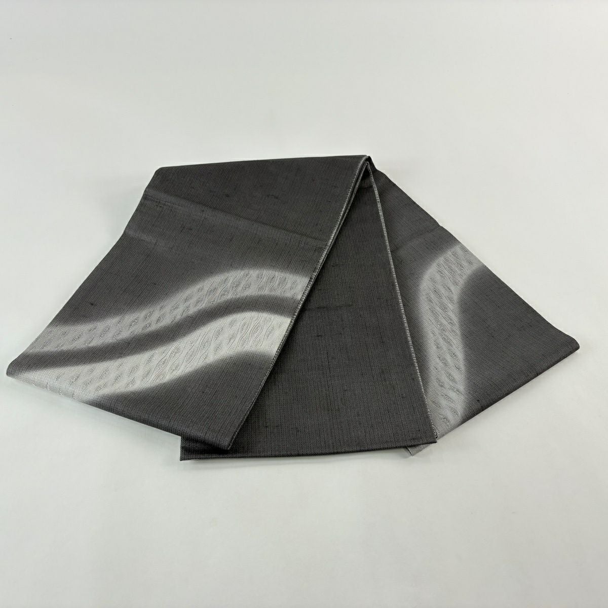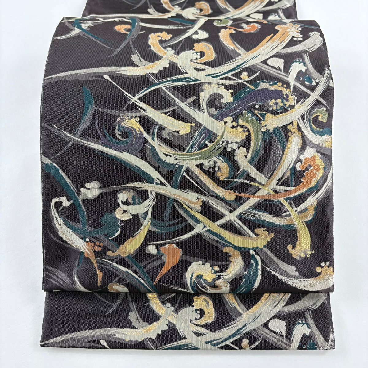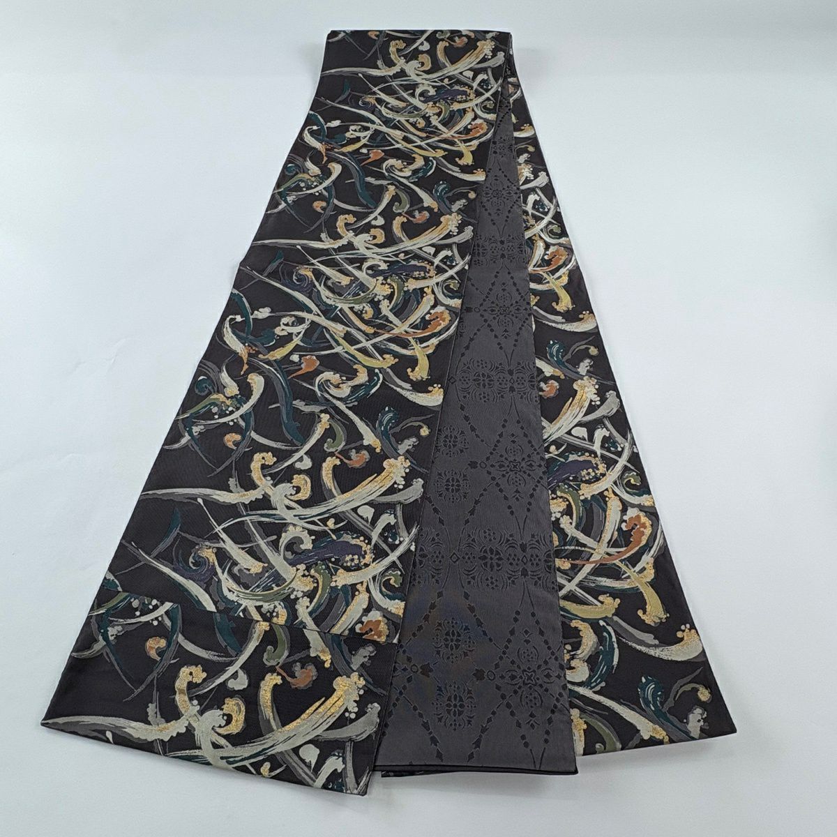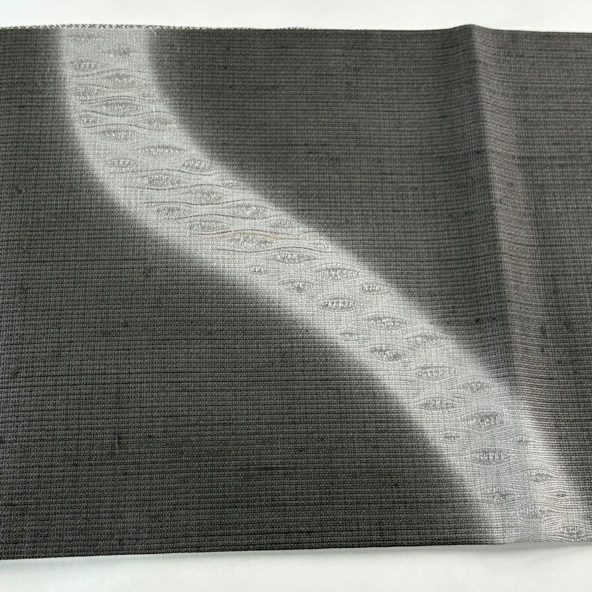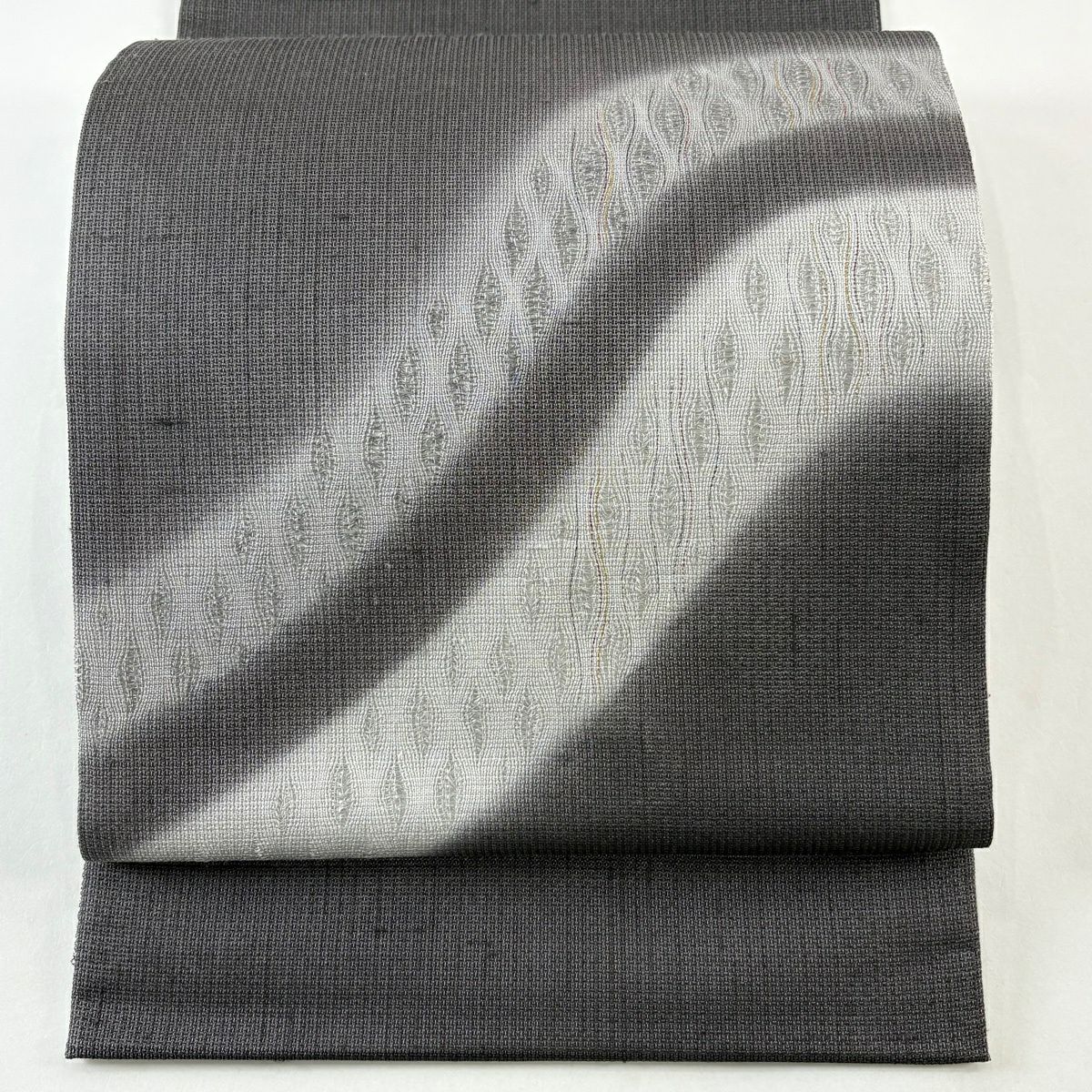 【美品】 袋帯 逸品 夏帯 やまと 立涌 幾何学模様 黒灰 お太鼓柄 正絹