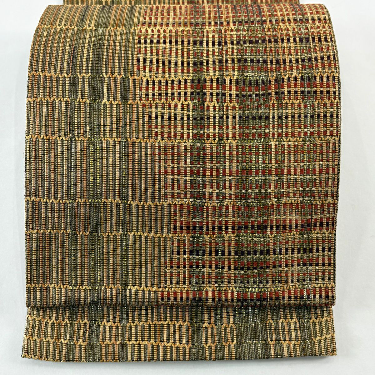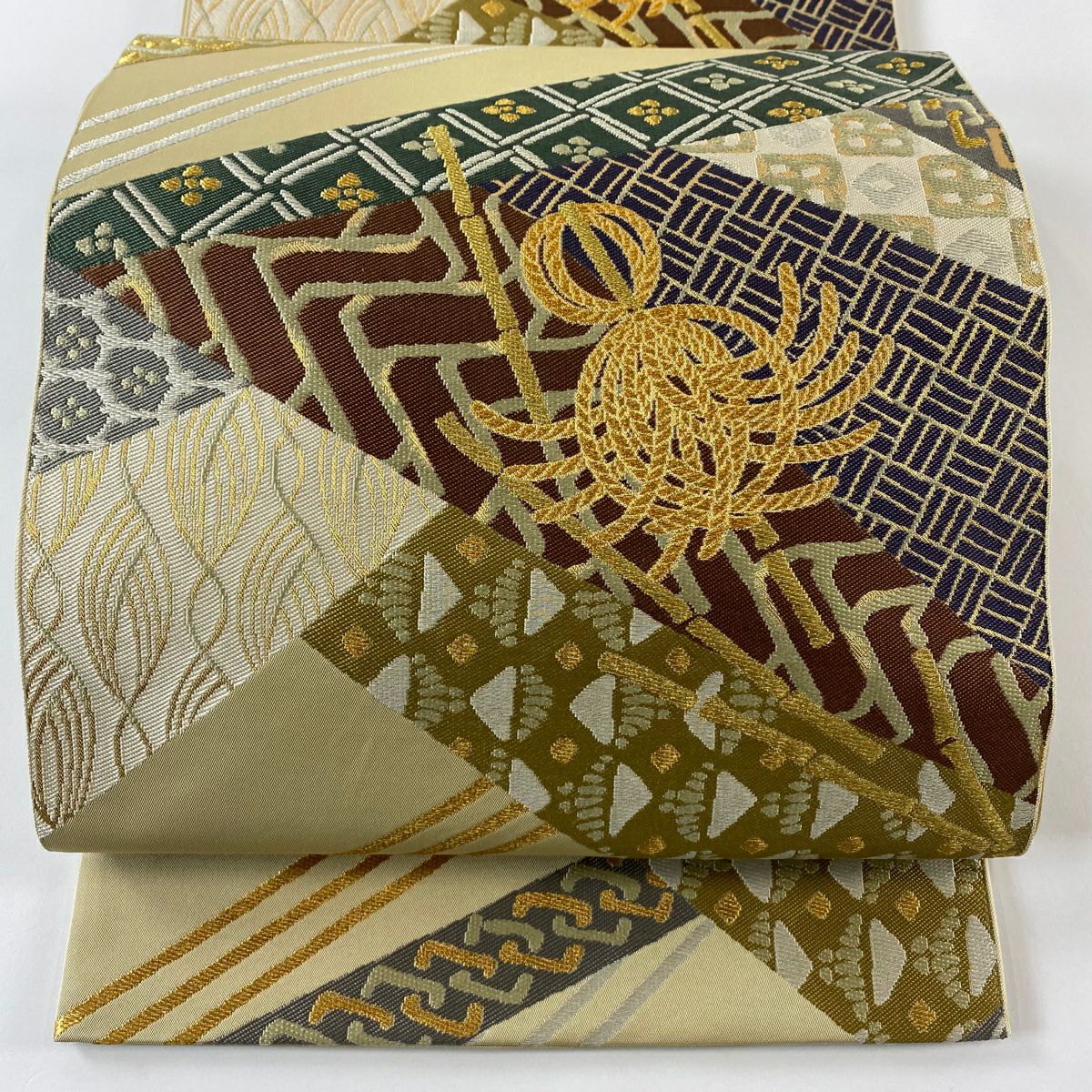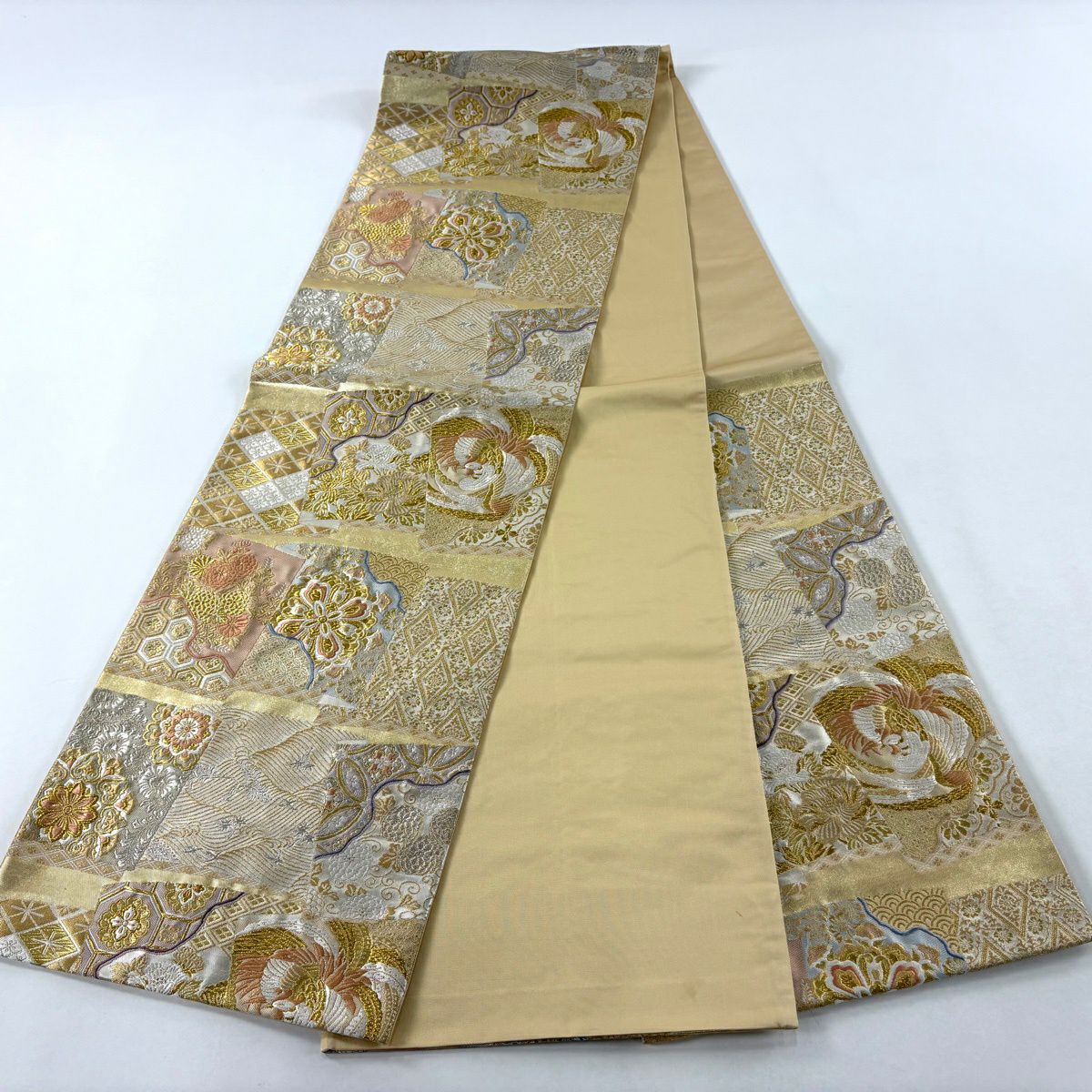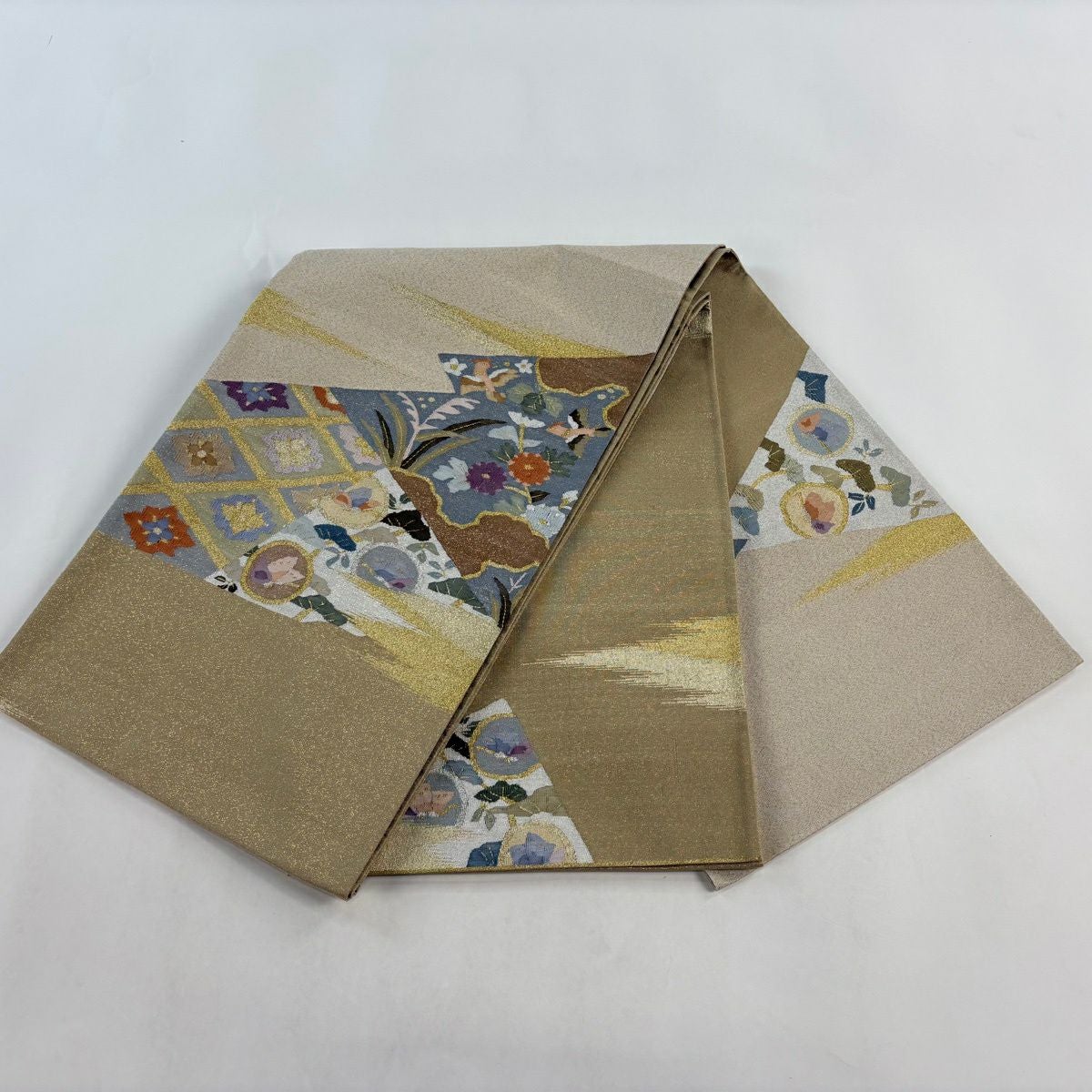 【在庫一掃】 【美品】 袋帯 逸品 幾何学 金銀糸 ベージュ 六通 正絹