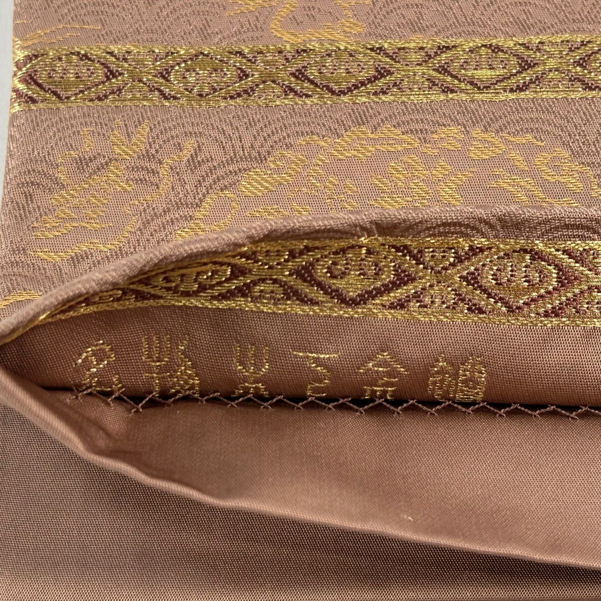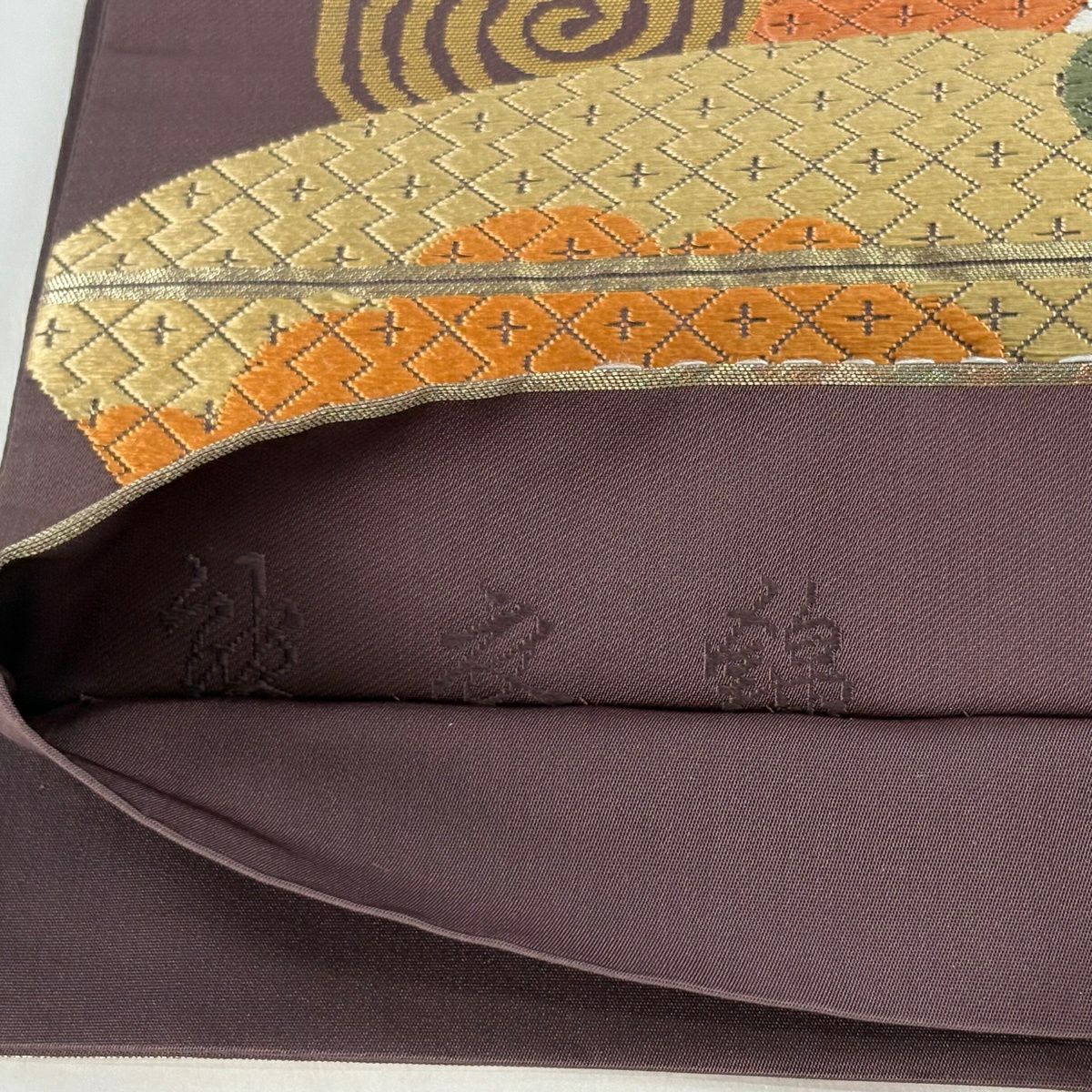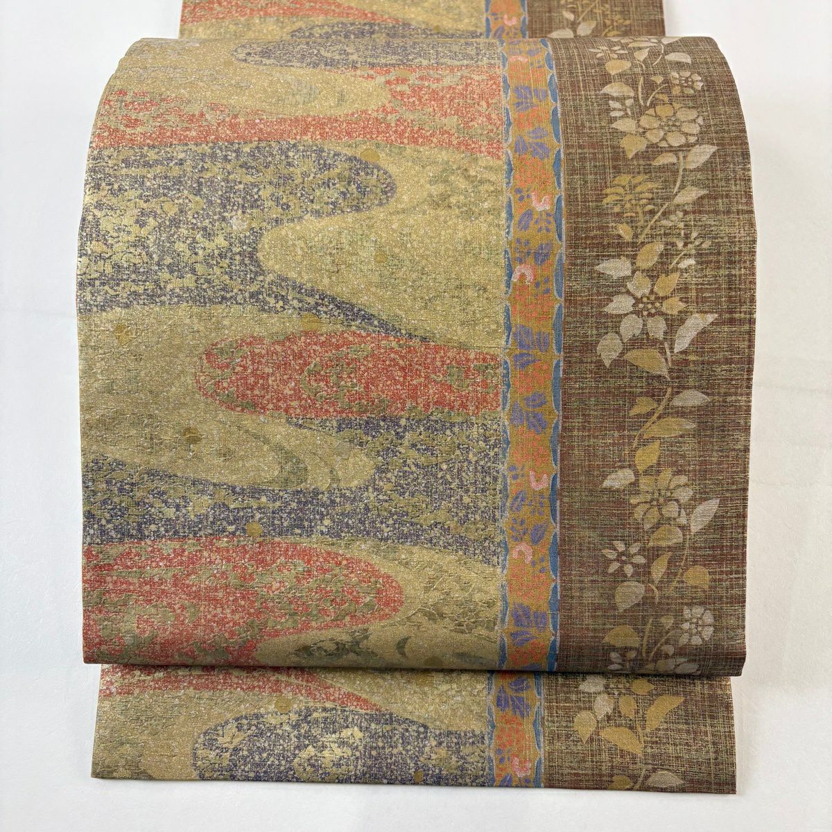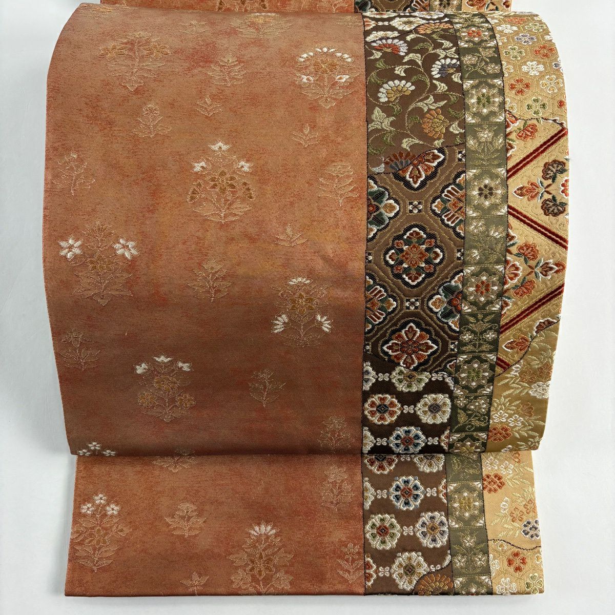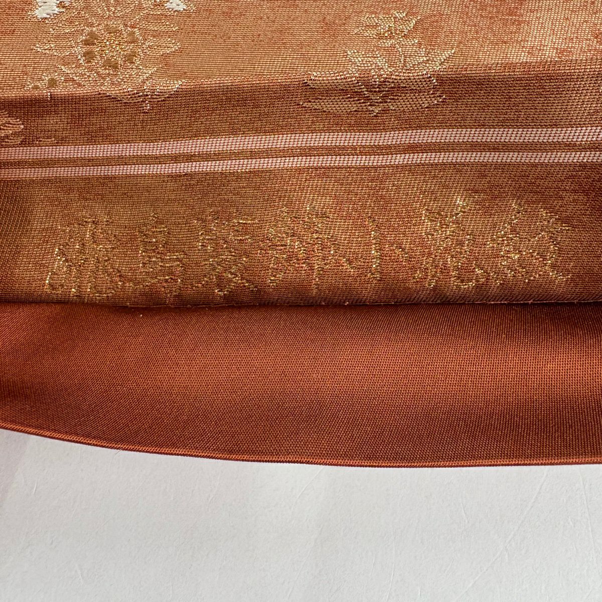 袋帯 逸品 河村織物 落款あり 飛鳥装飾小花文 金糸 箔 赤茶 六通 正絹