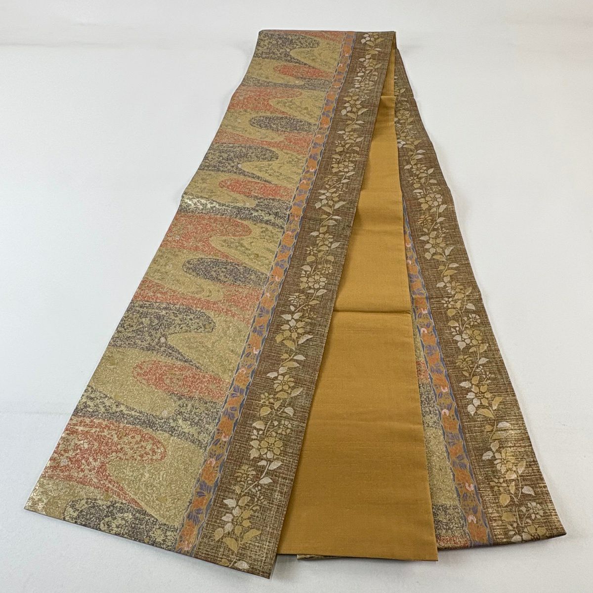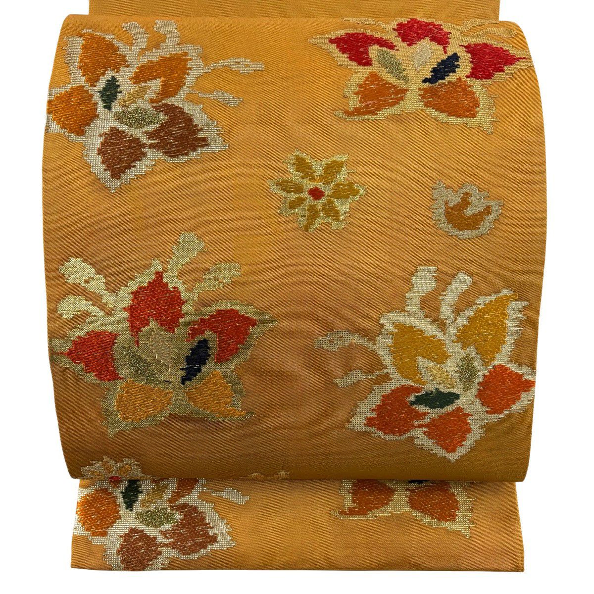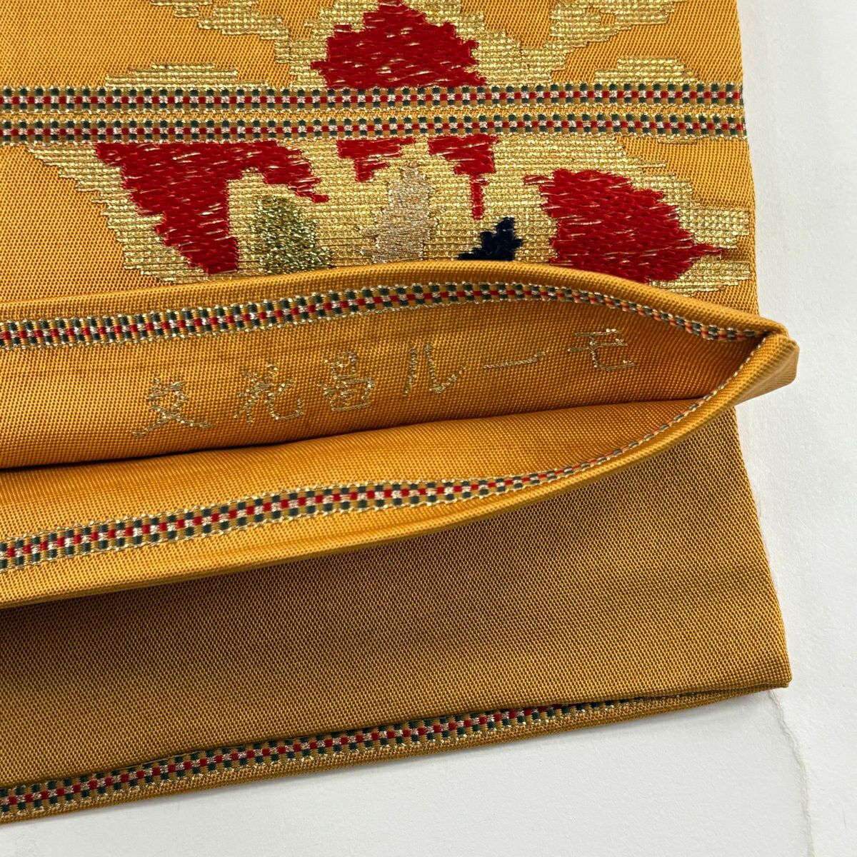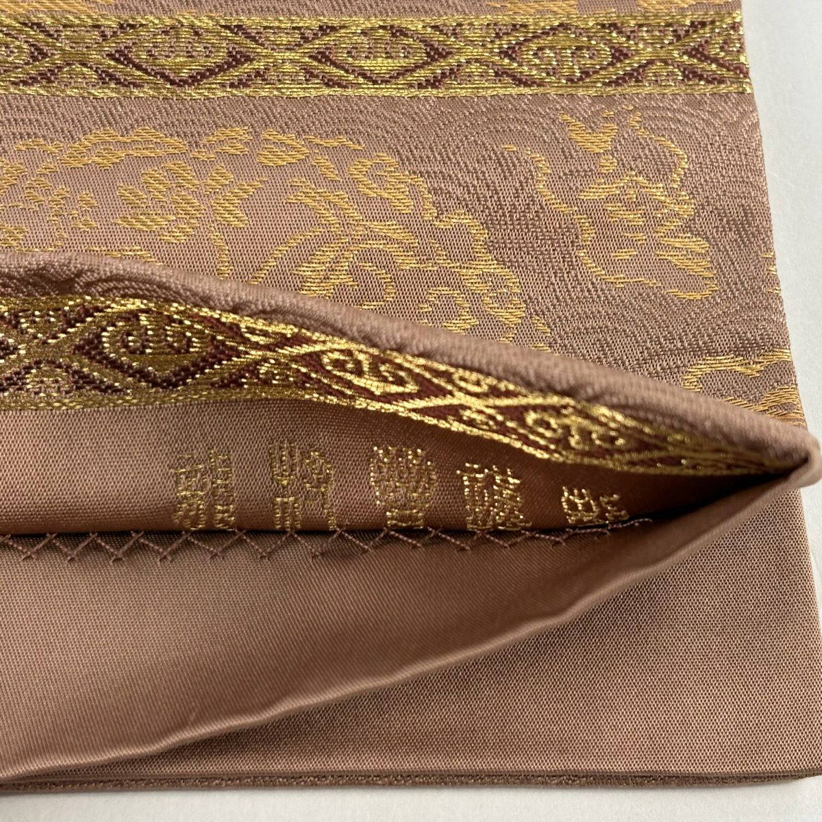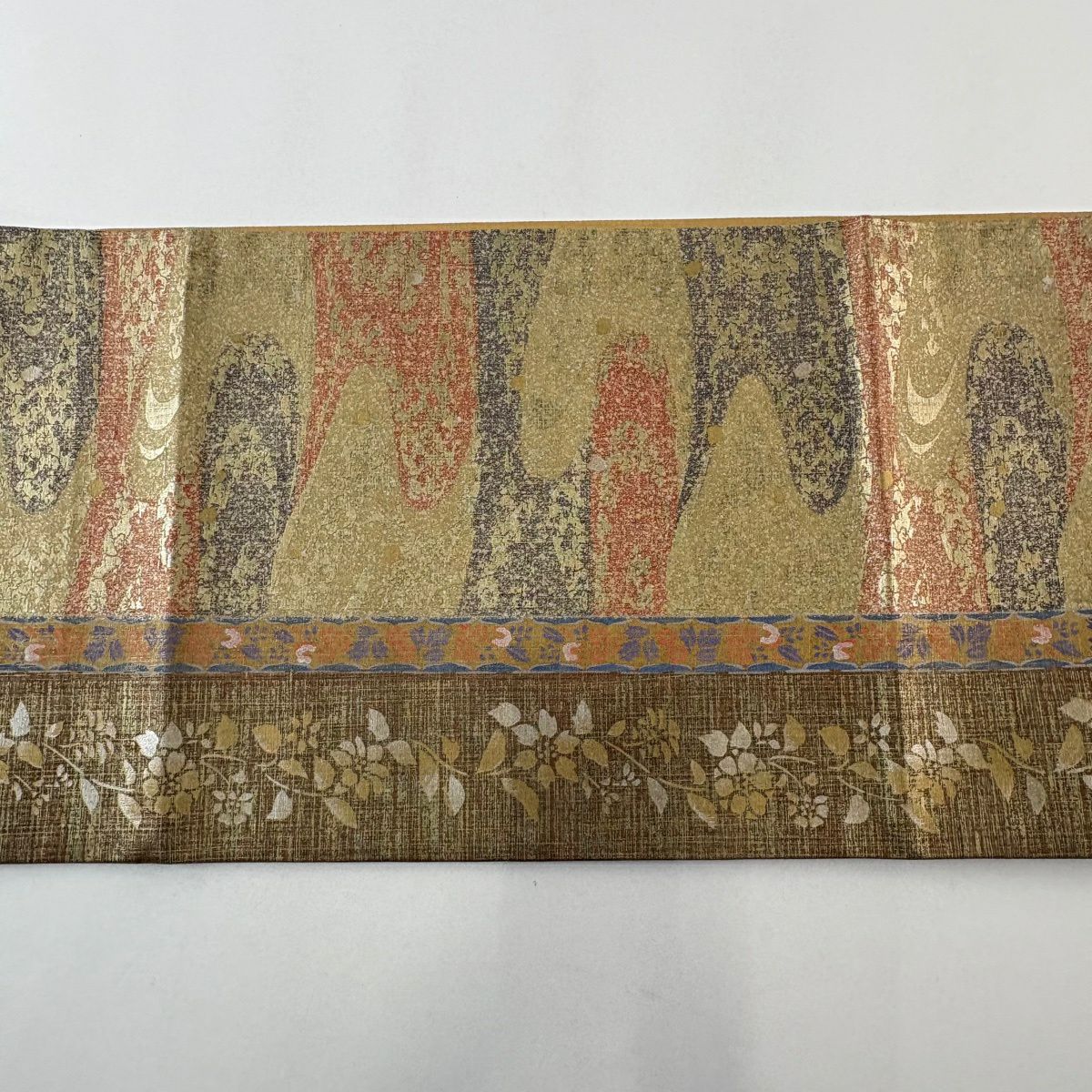 袋帯 逸品 河村織物 落款あり 飛鳥装飾小花文 金糸 箔 赤茶 六通 正絹