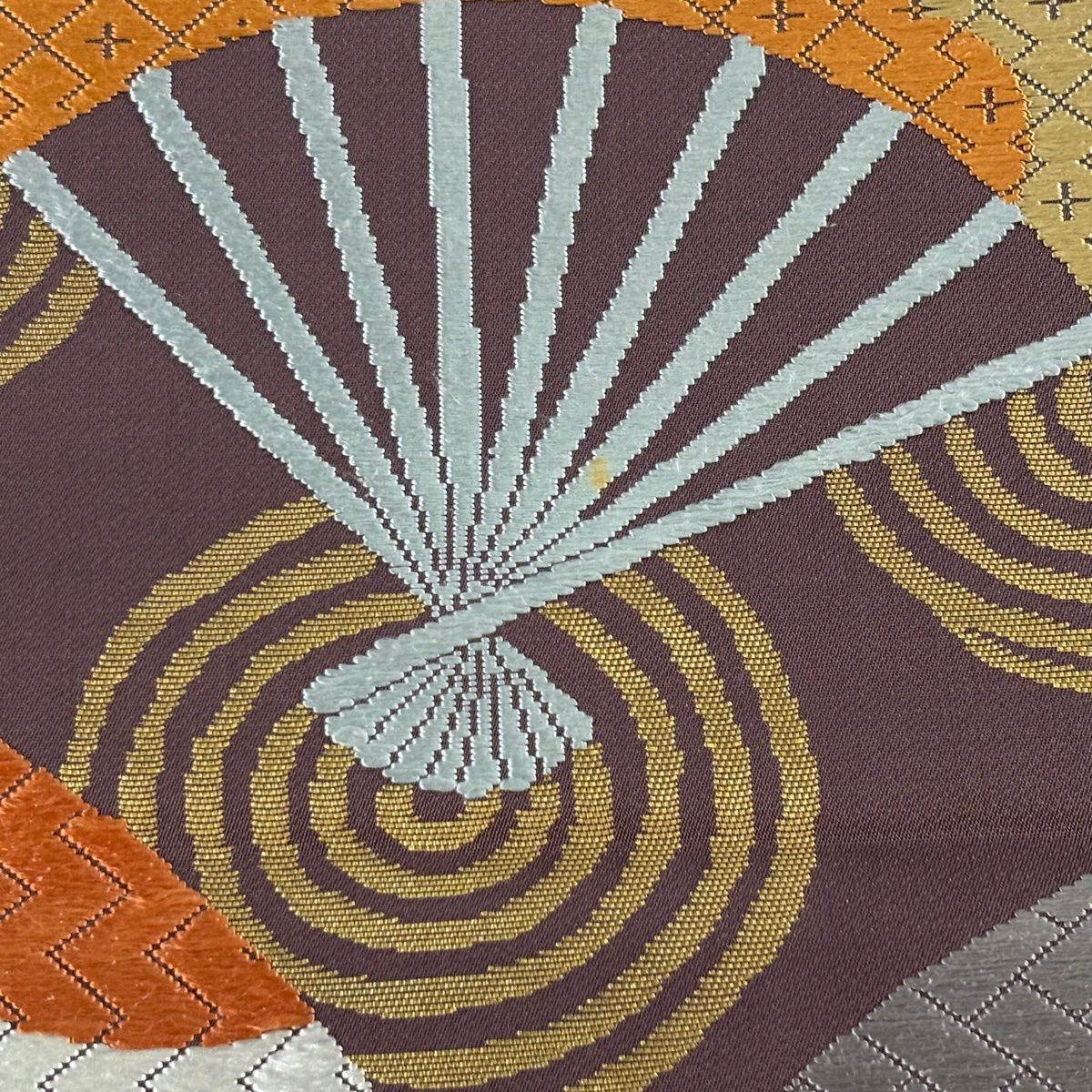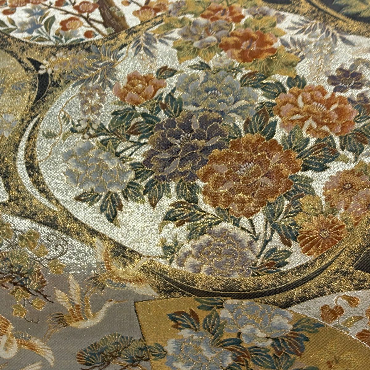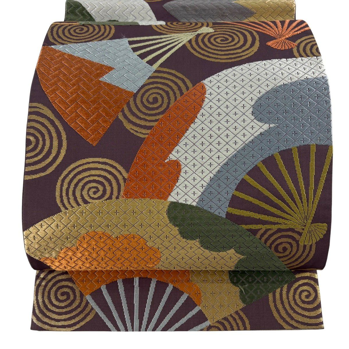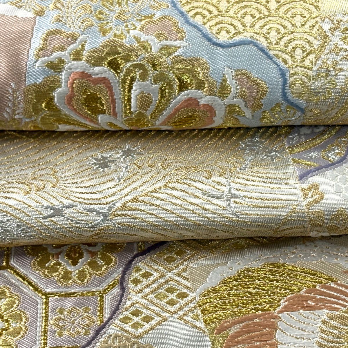 【在庫一掃】 袋帯 逸品 扇 鶴 金銀糸 箔 薄オレンジ お太鼓柄 正絹