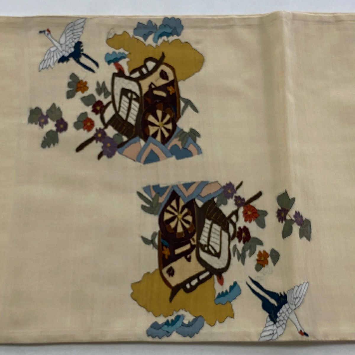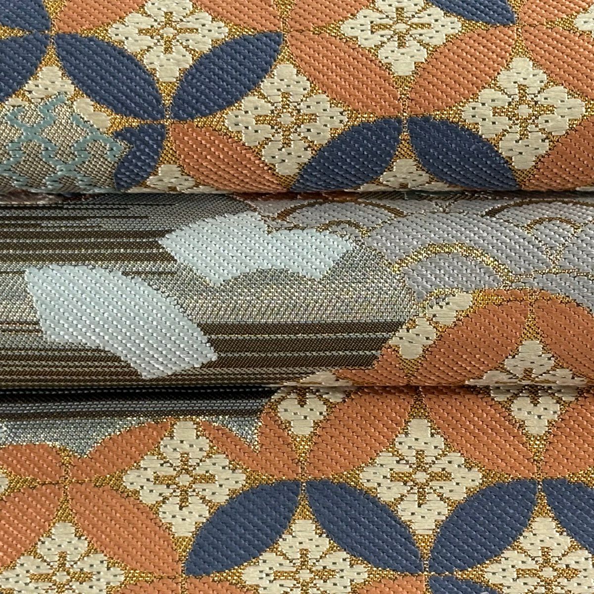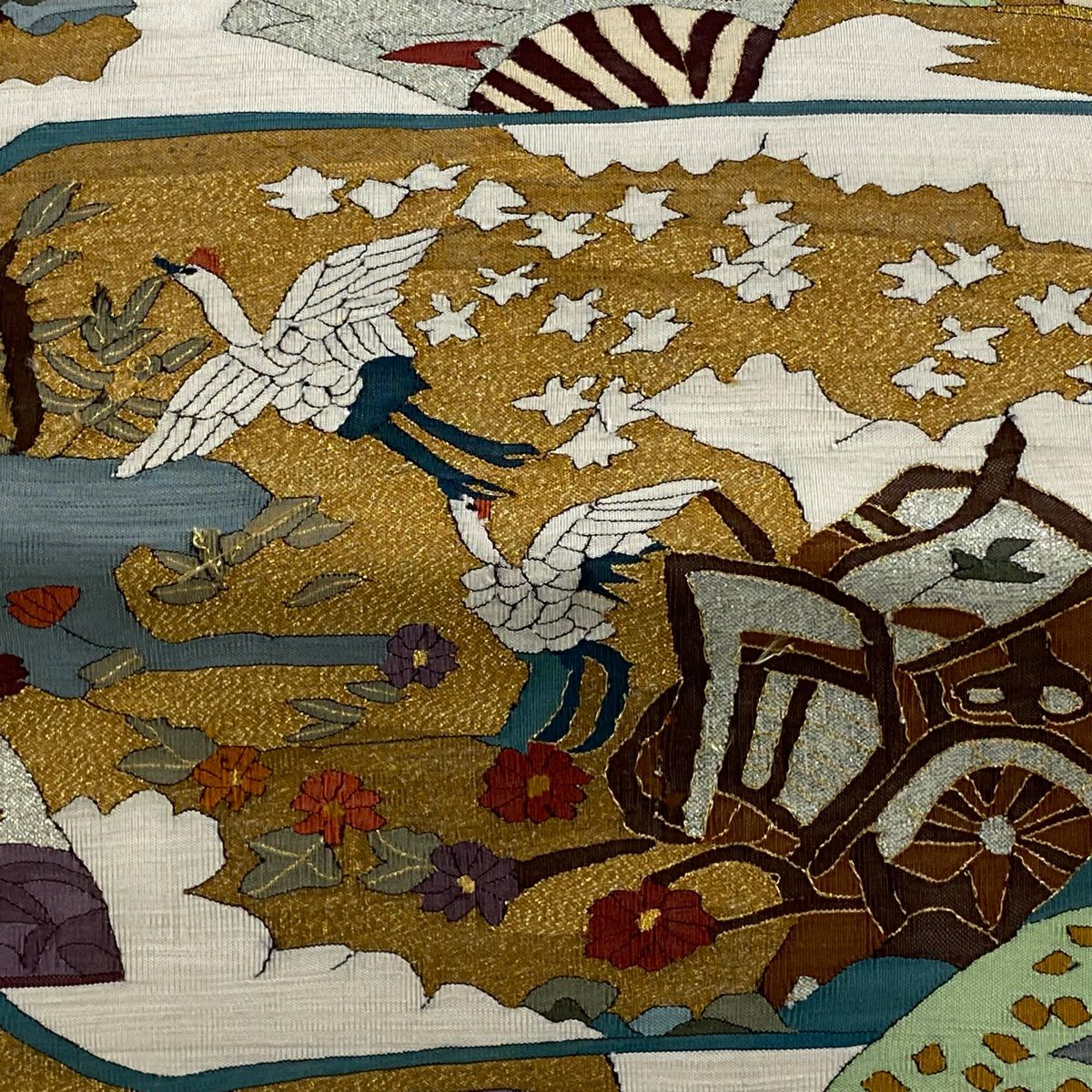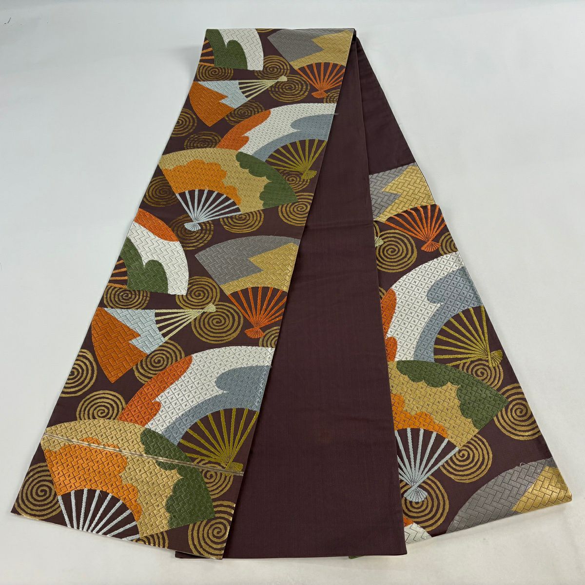 【在庫一掃】 袋帯 逸品 扇 鶴 金銀糸 箔 薄オレンジ お太鼓柄 正絹