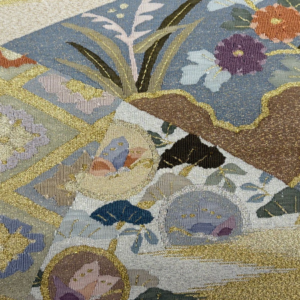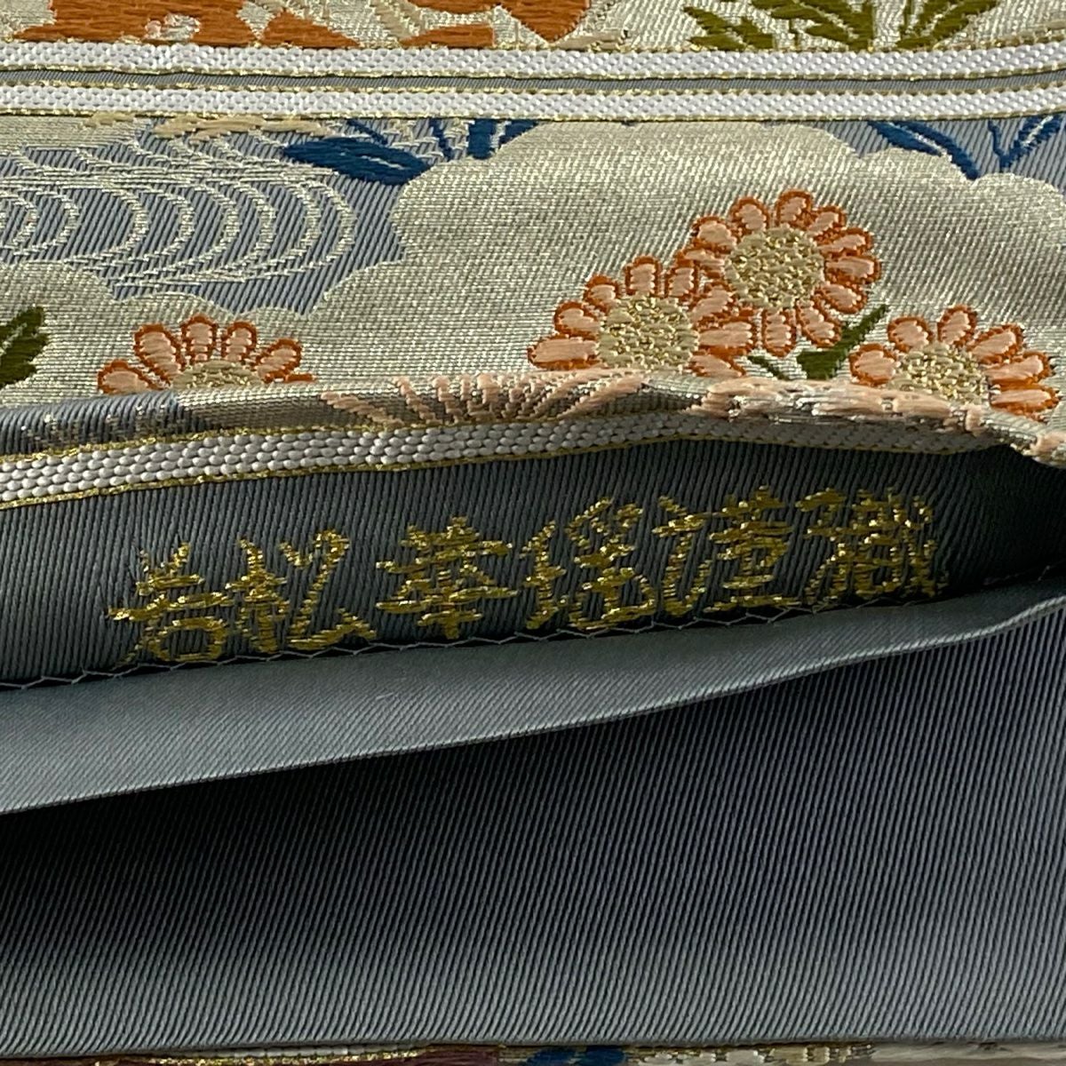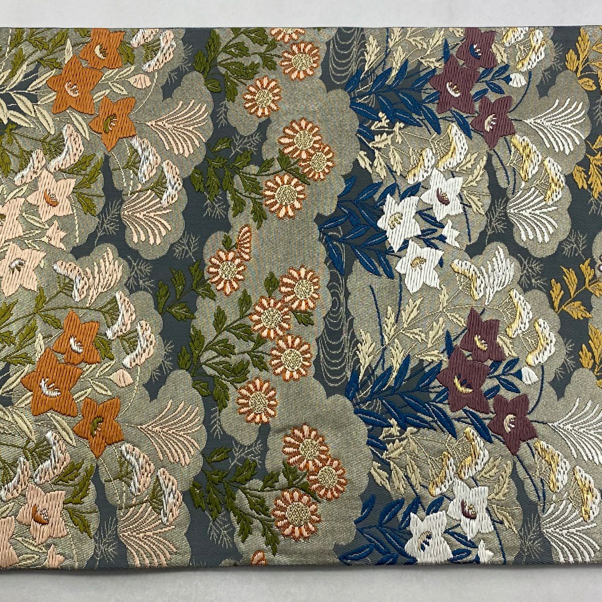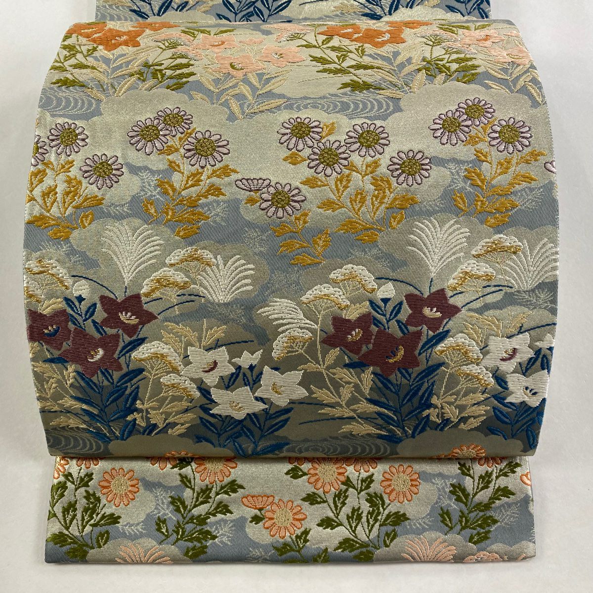 【在庫一掃】 【美品】 袋帯 逸品 秋草 雲文 刺繍 箔 青灰色 六通 正絹