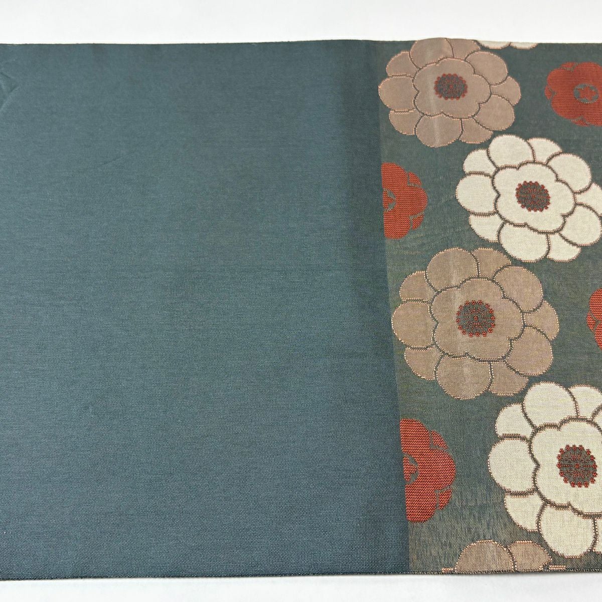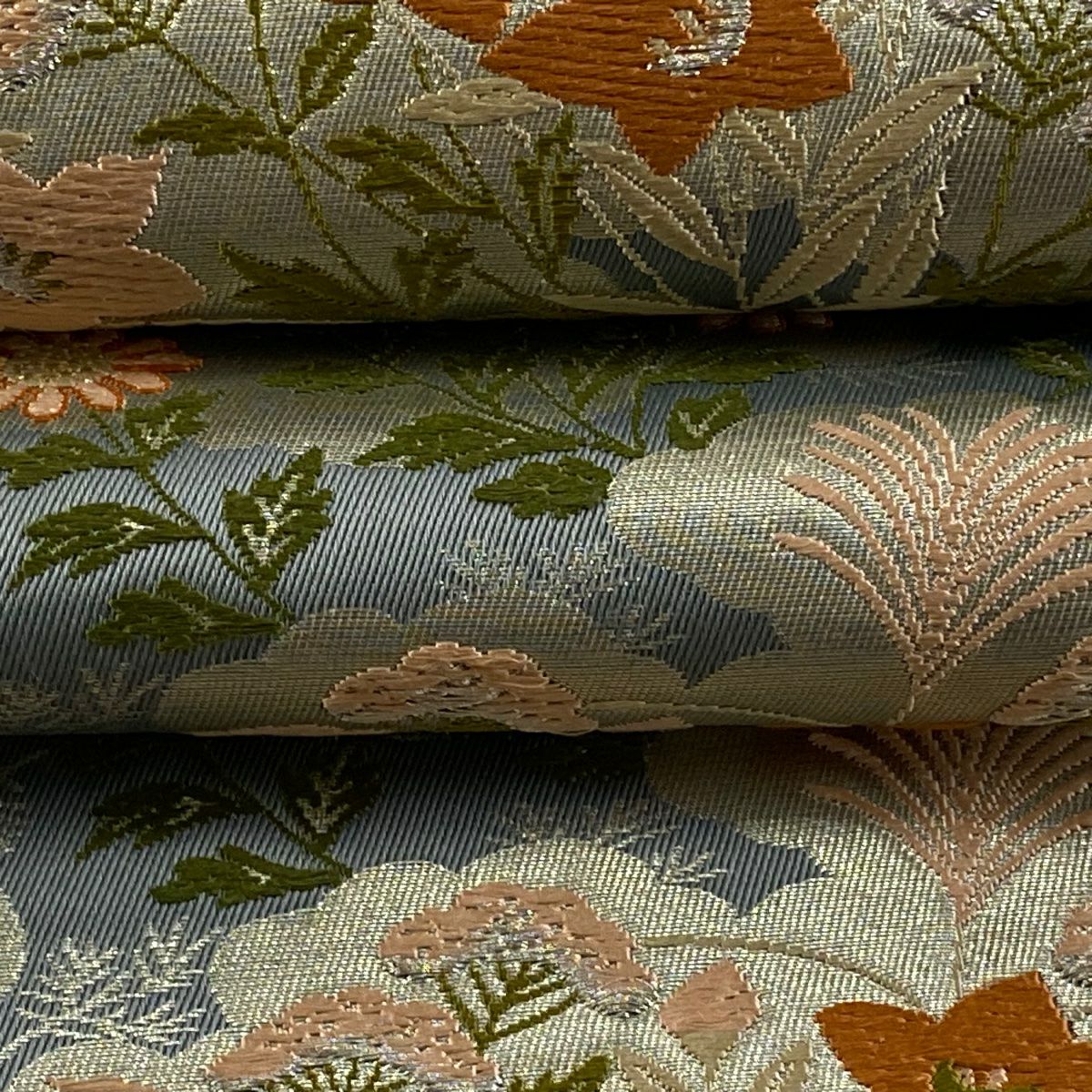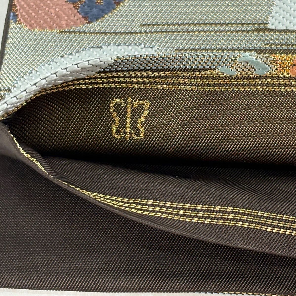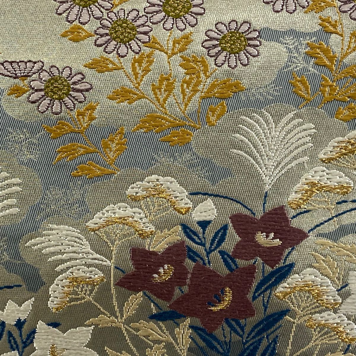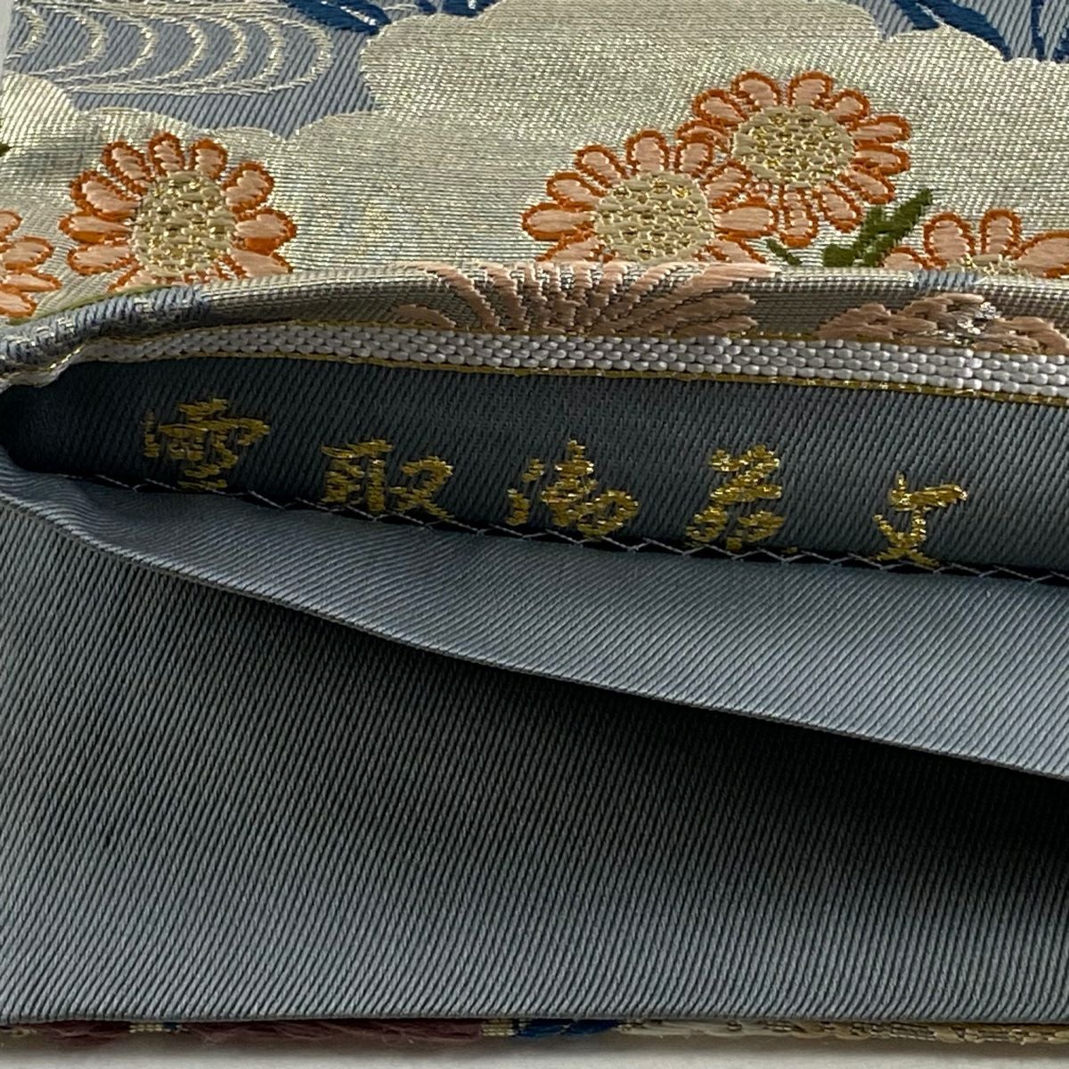 【在庫一掃】 【美品】 袋帯 逸品 秋草 雲文 刺繍 箔 青灰色 六通 正絹