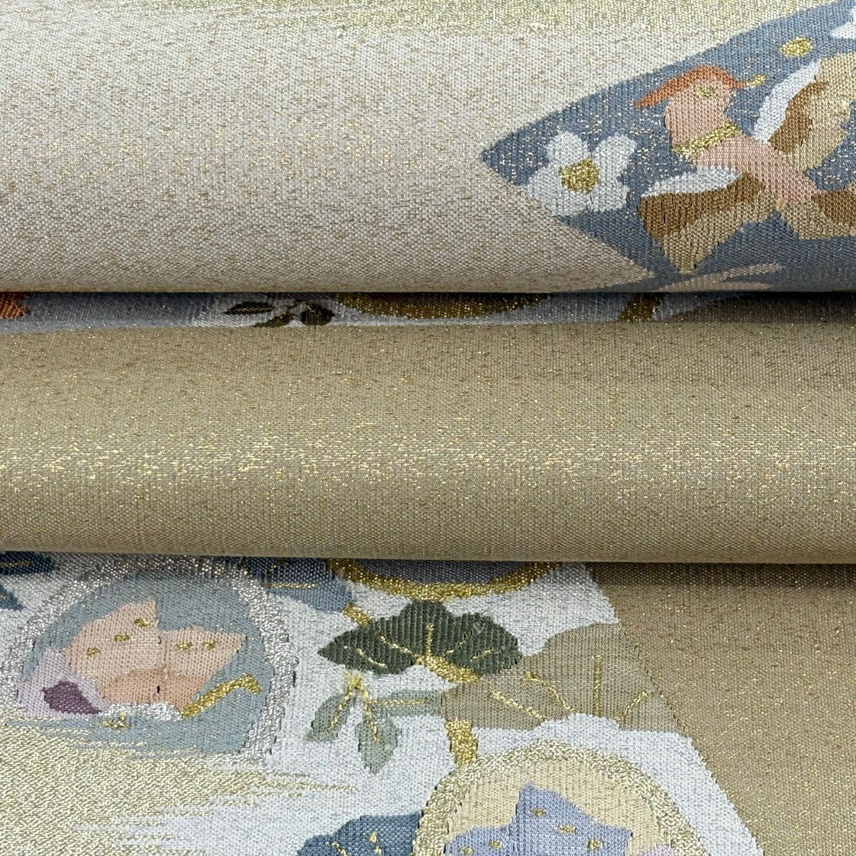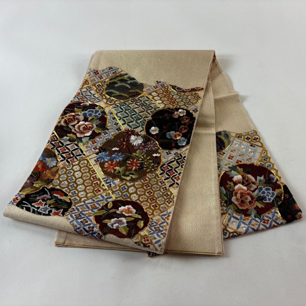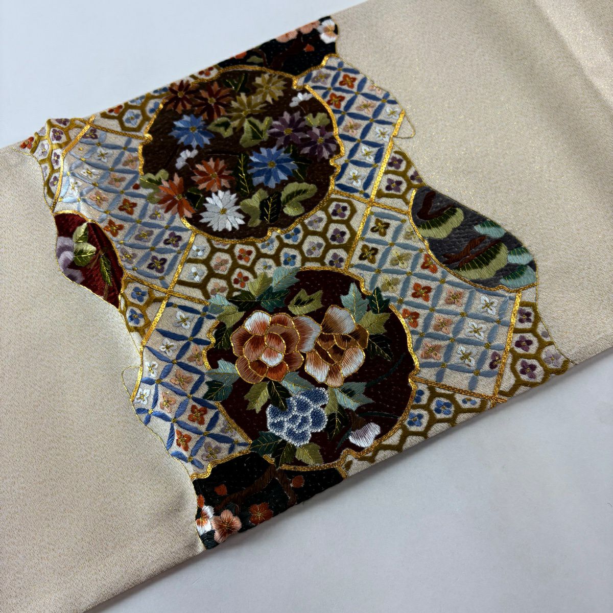 【美品】 袋帯 逸品 草花 七宝 金糸 刺繍 ベージュ お太鼓柄 正絹
