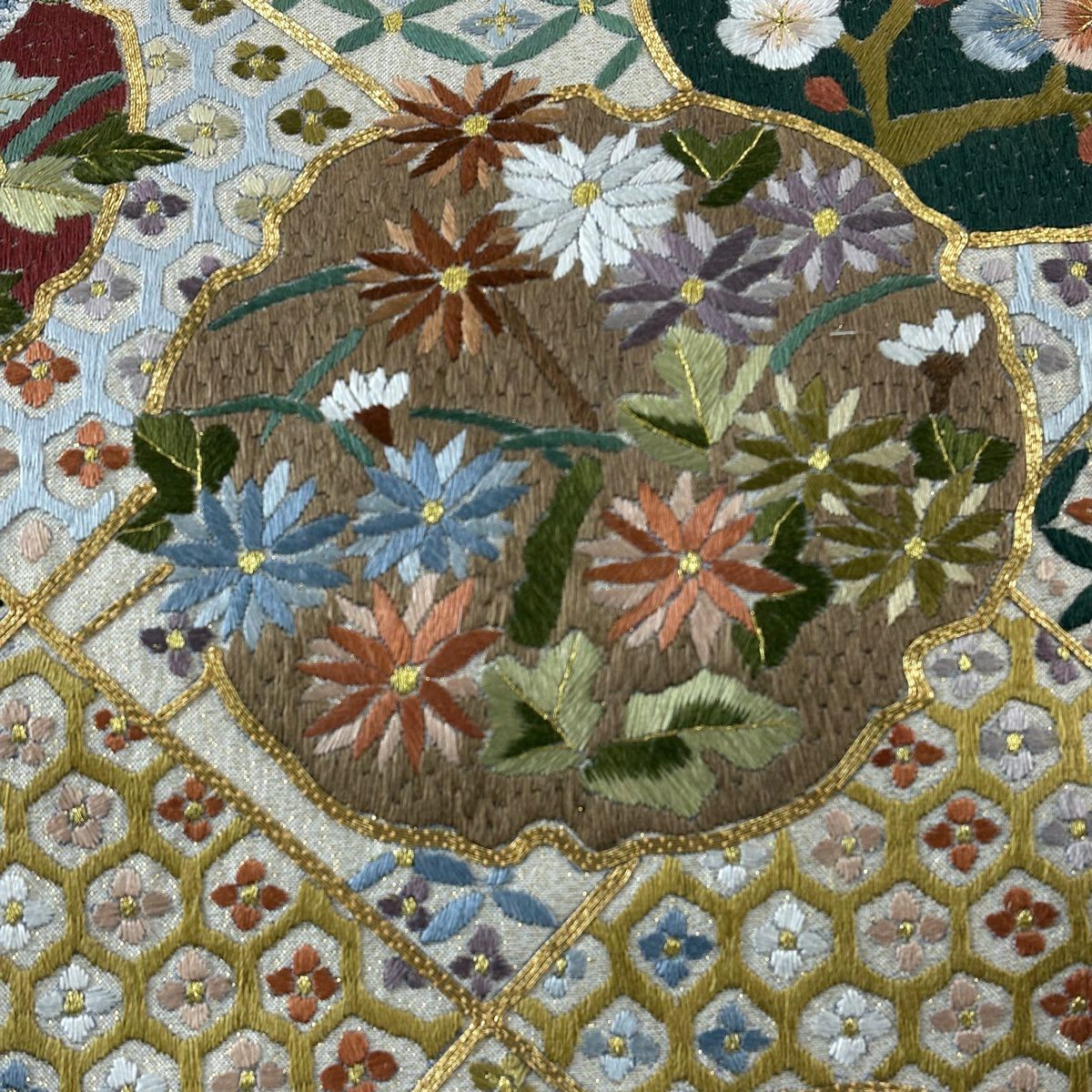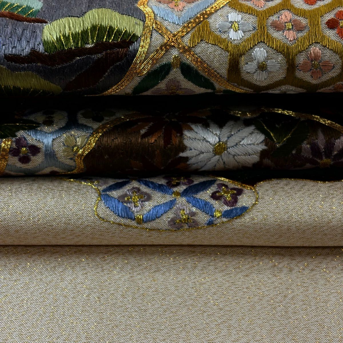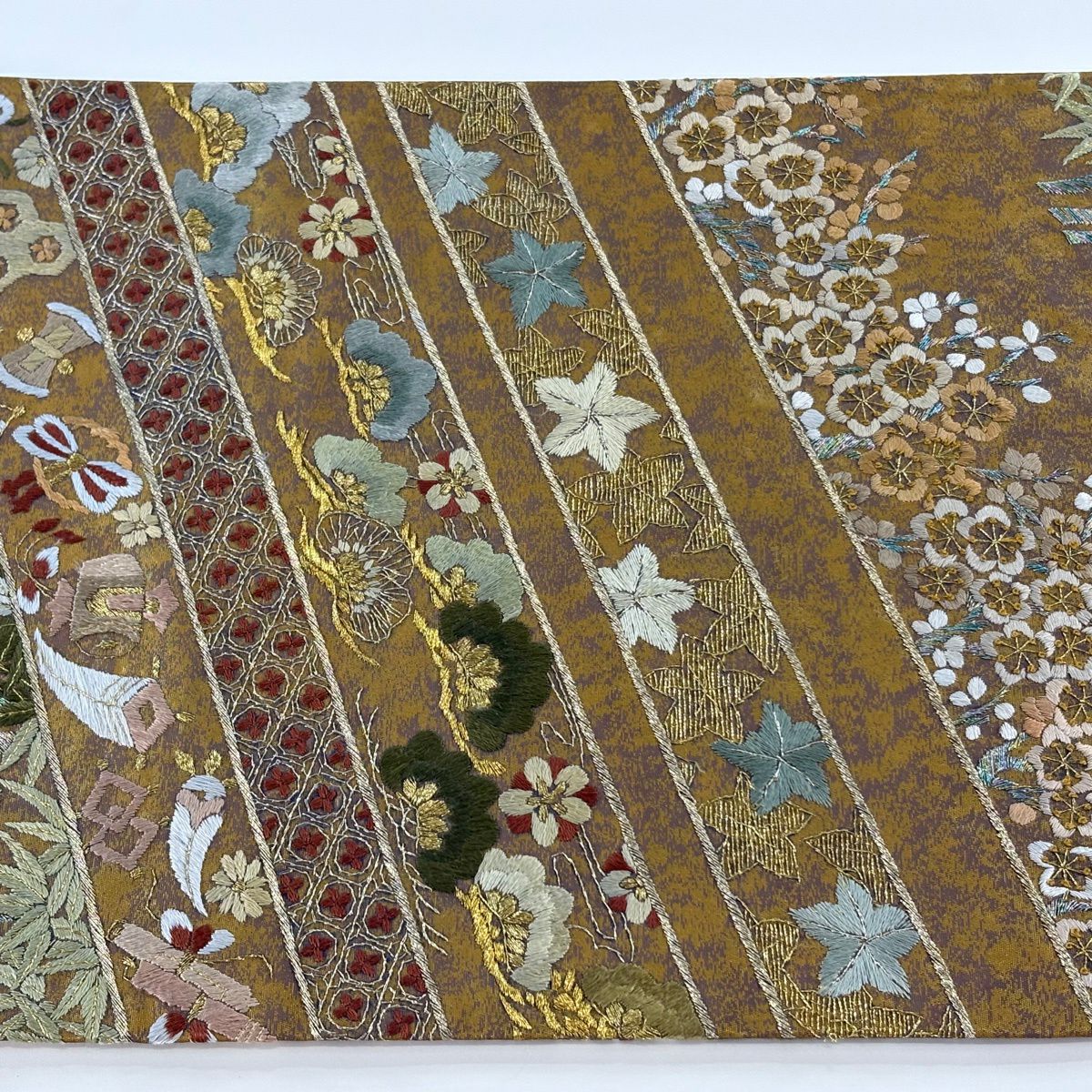 【美品】 袋帯 逸品 草花 七宝 金糸 刺繍 ベージュ お太鼓柄 正絹
