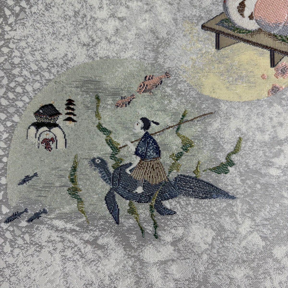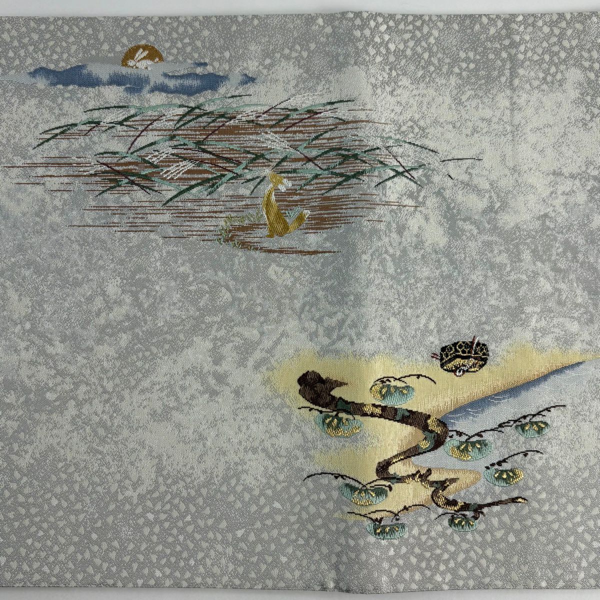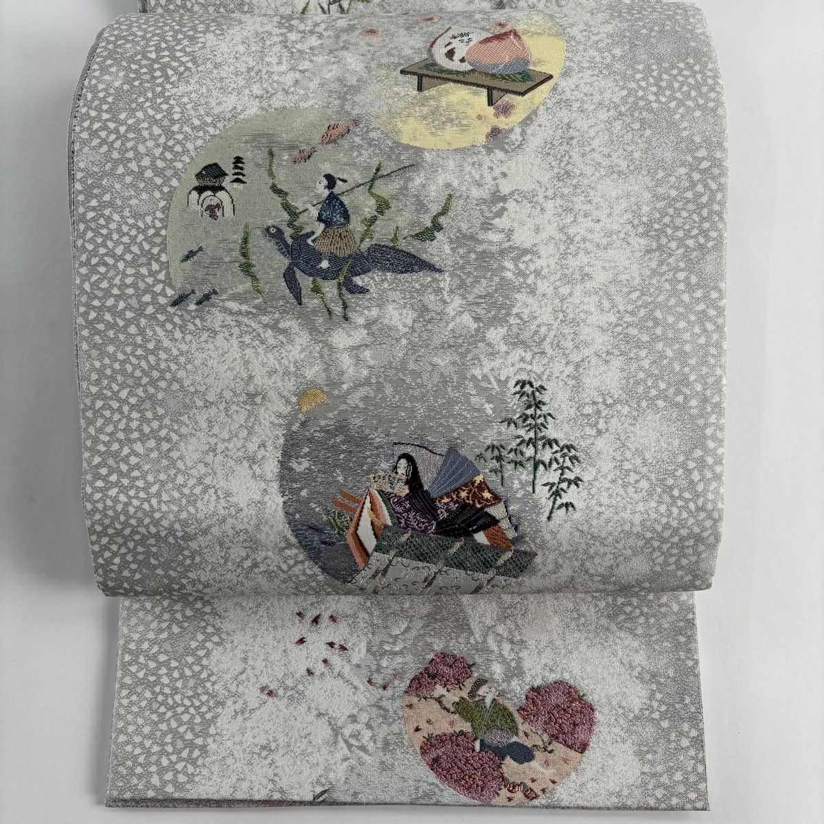 【美品】 袋帯 逸品 日本昔話 浦島太郎 金銀糸 箔 灰色 お太鼓柄 正絹