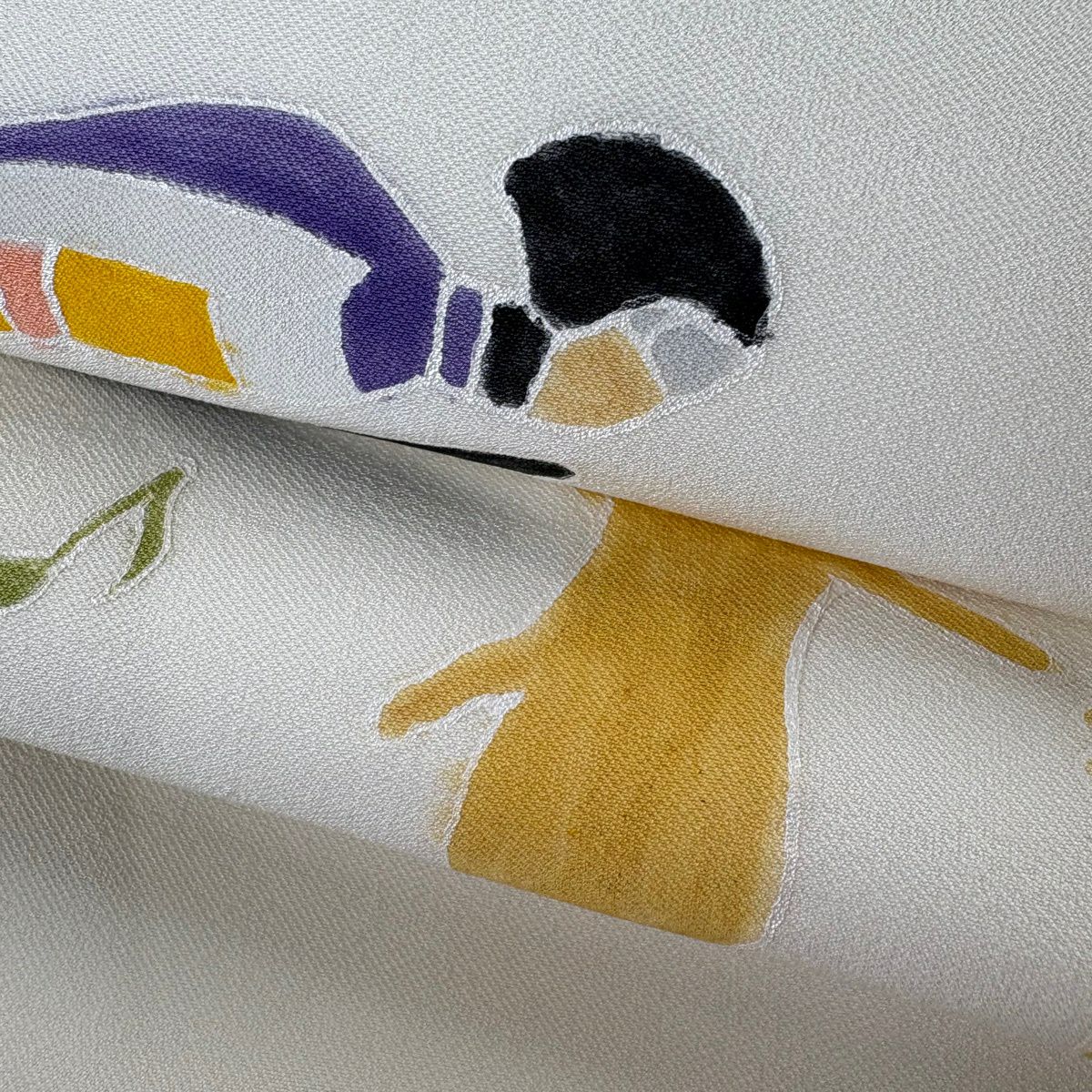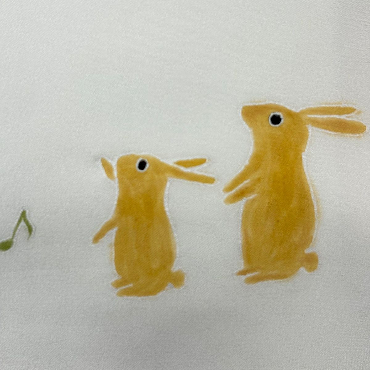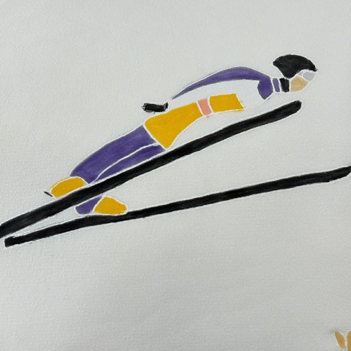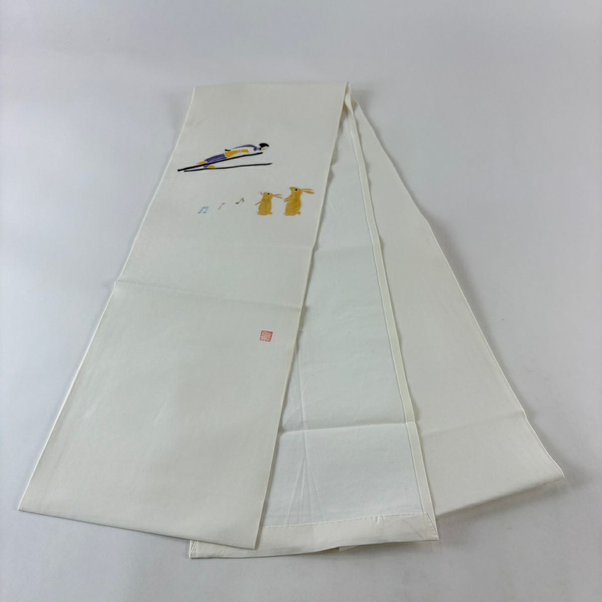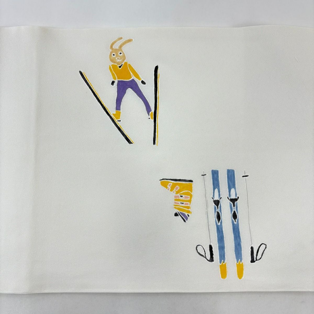 【美品】 開き名古屋帯 逸品 落款あり スキーヤー うさぎ クリーム 正絹