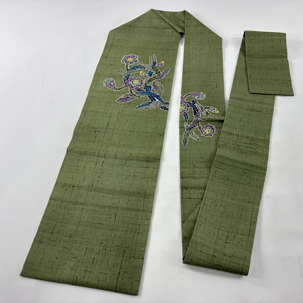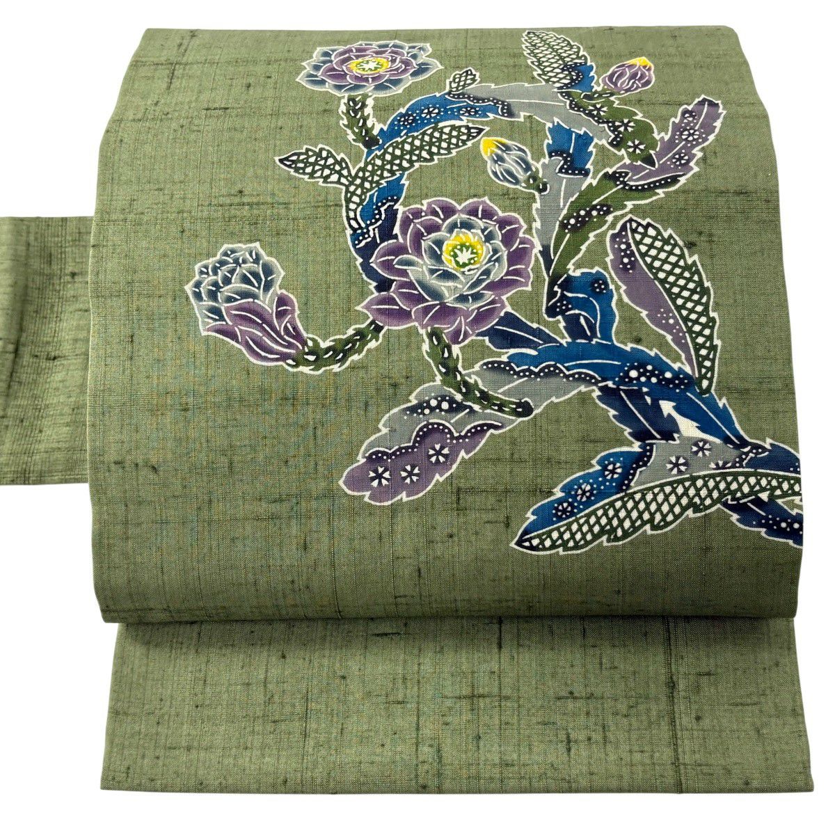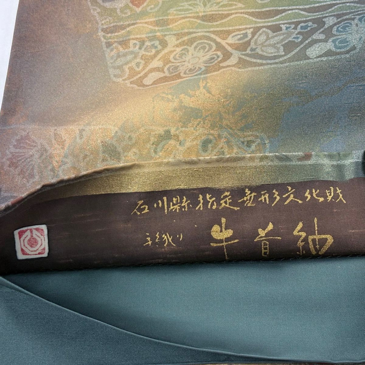 【美品】 袋帯 逸品 落款あり 牛首紬地 華文 草花 金彩 緑 全通 正絹