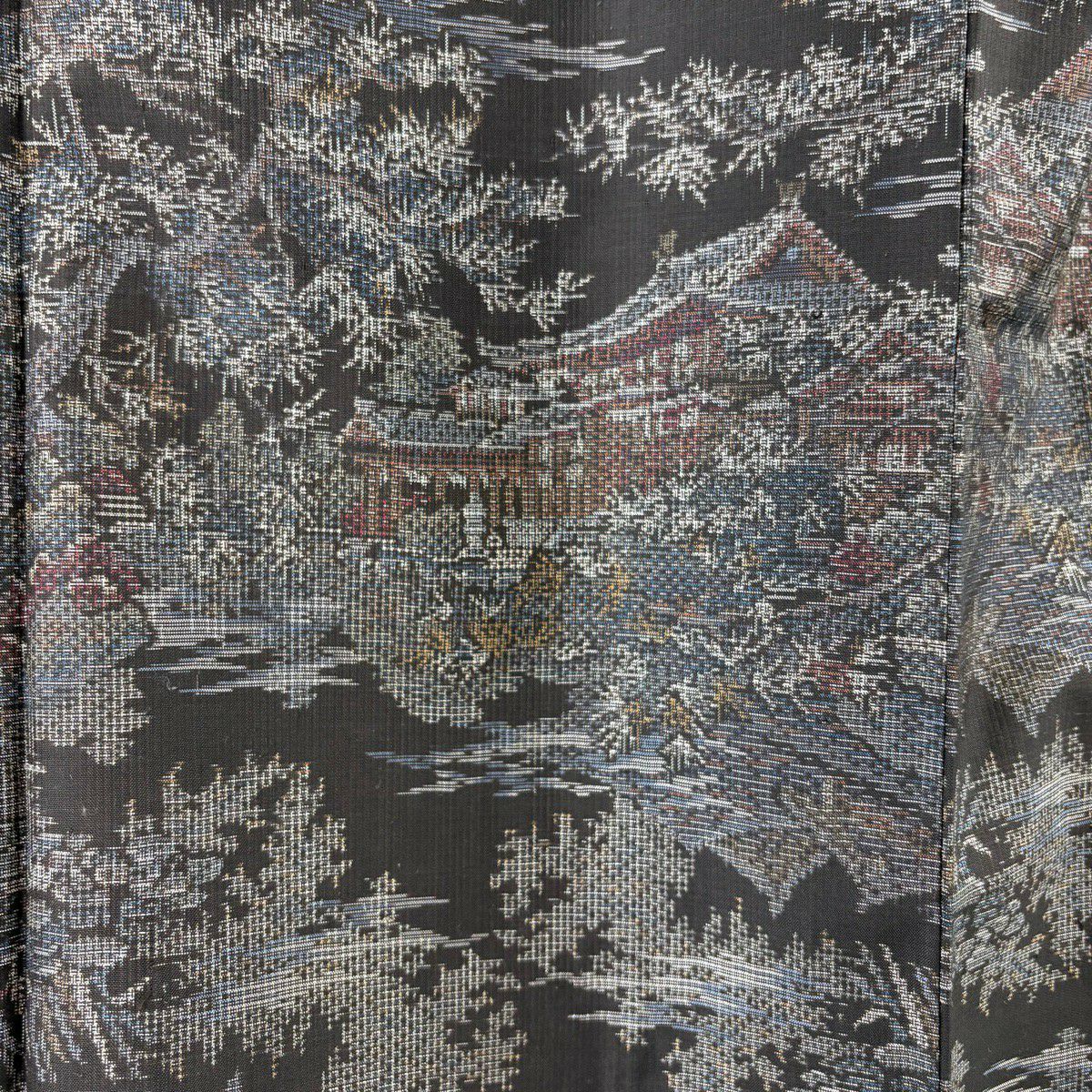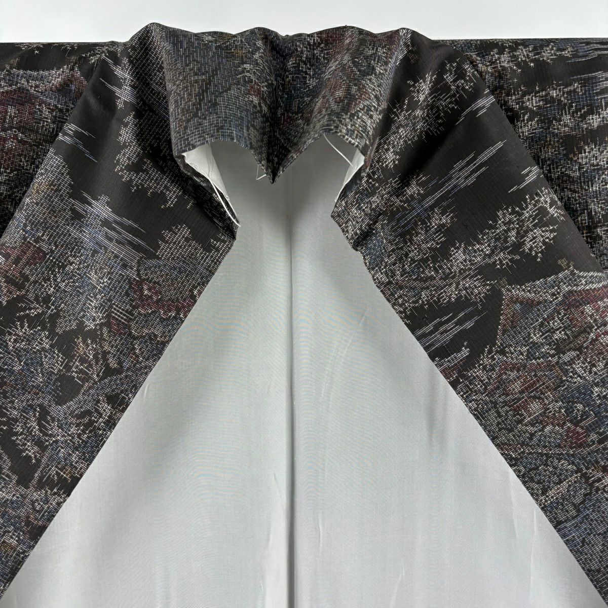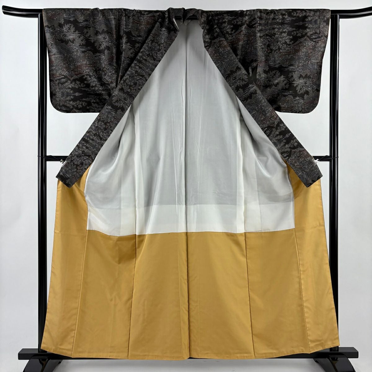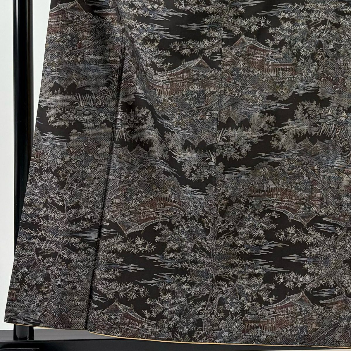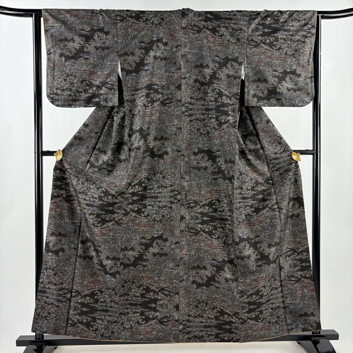 紬 身丈159.5cm 裄丈63.5cm S 袷 建物 樹木 焦茶色 正絹 逸品
