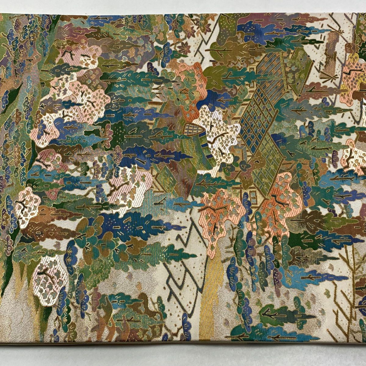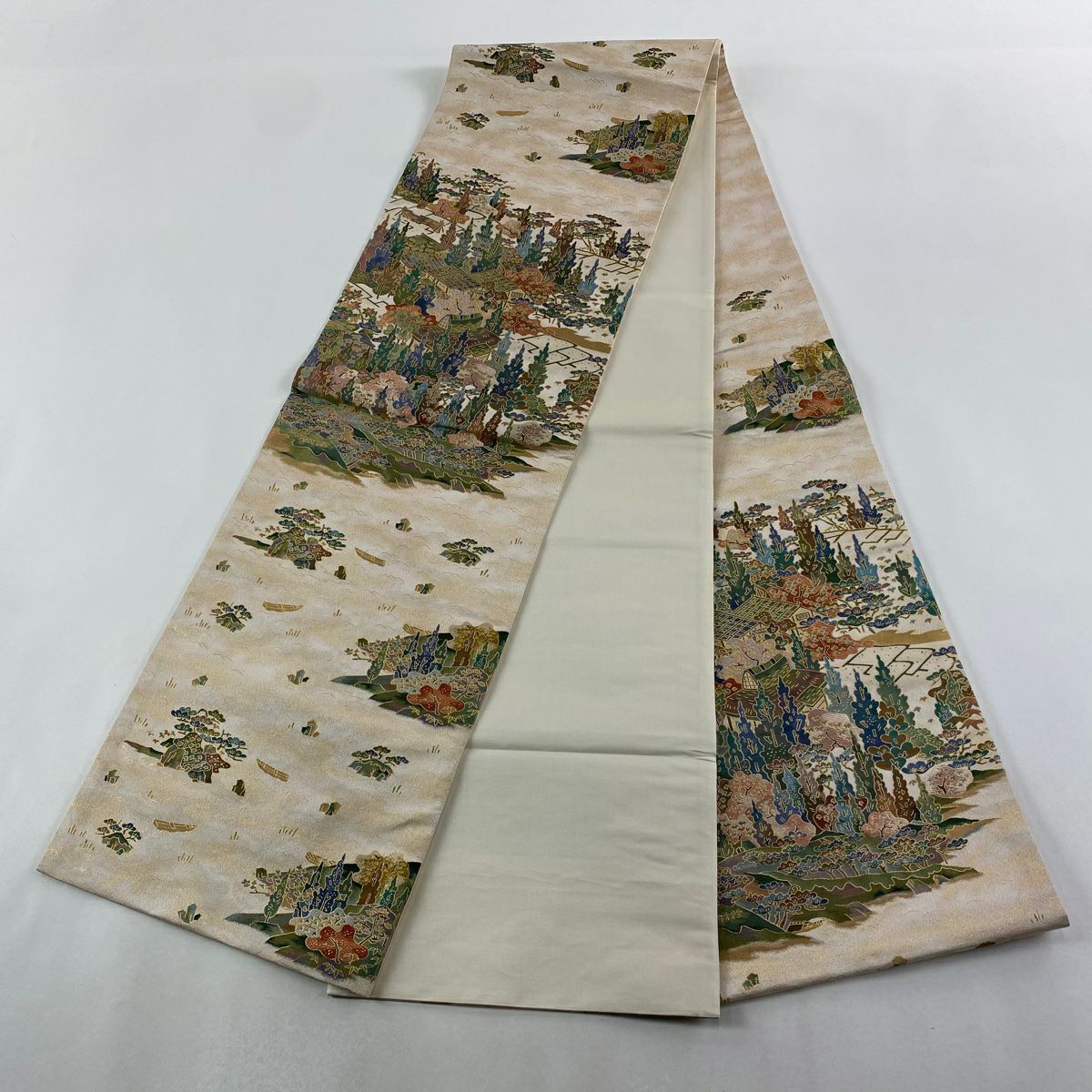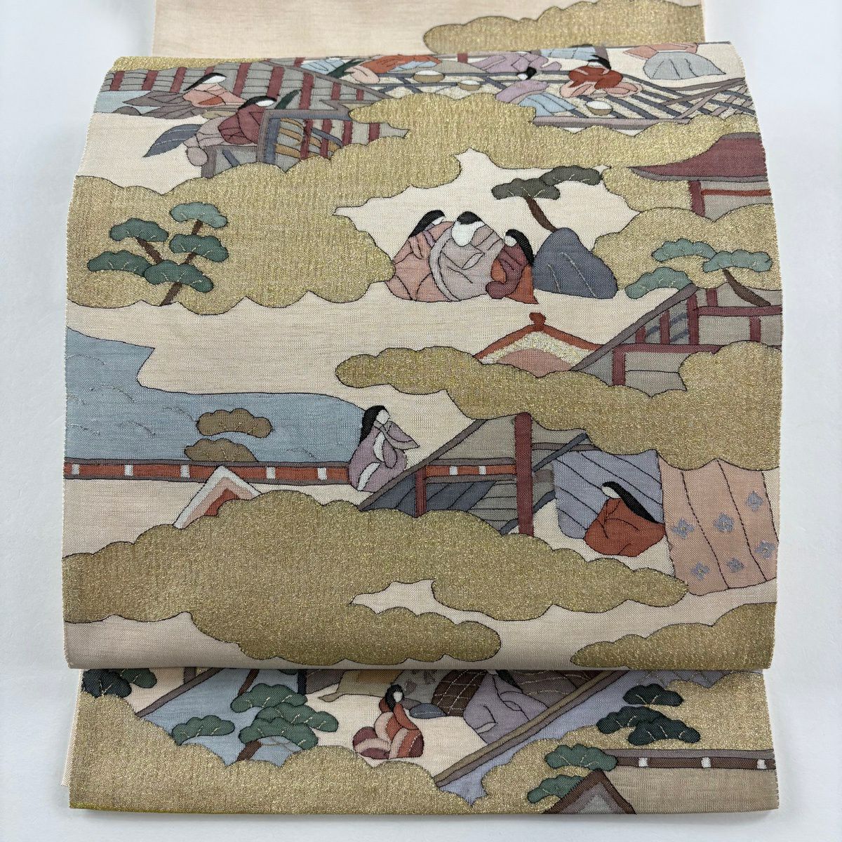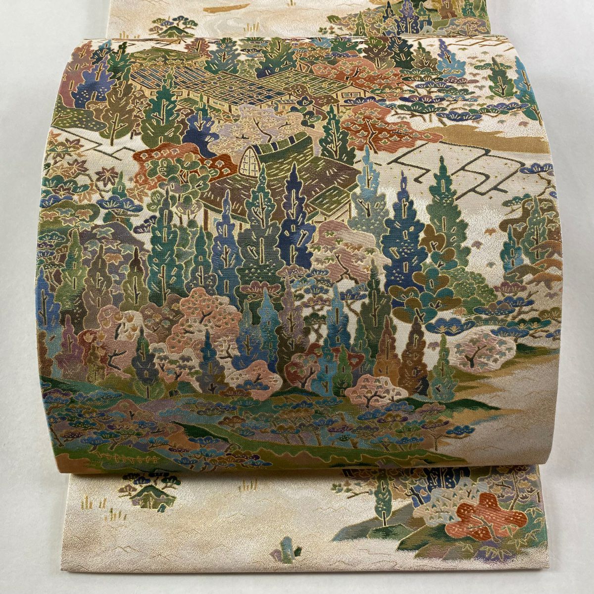 【在庫一掃】 【美品】 袋帯 逸品 建物 樹木 箔 ベージュ 六通 正絹