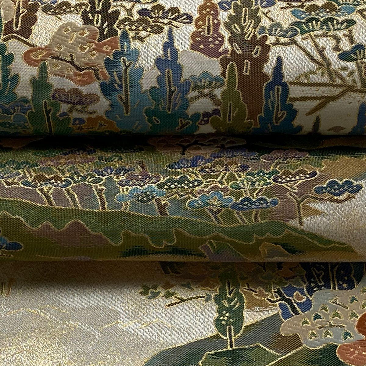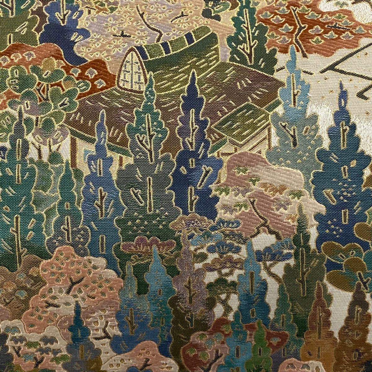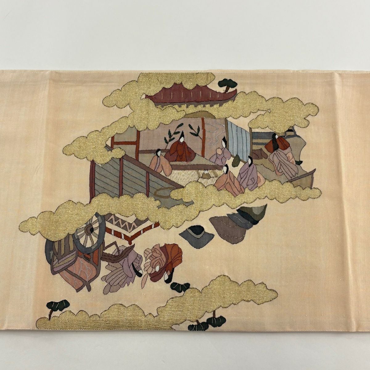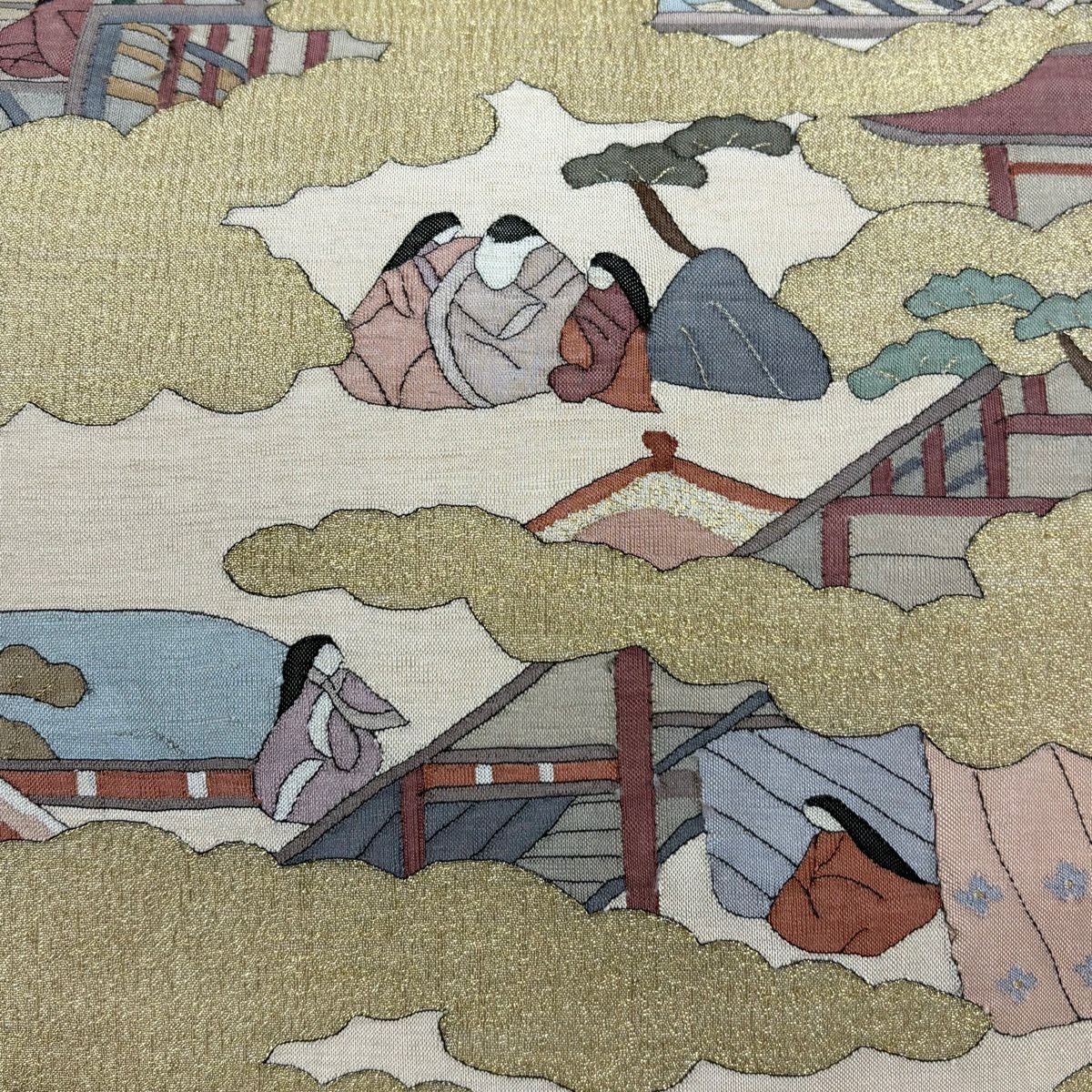 【在庫一掃】 【美品】 袋帯 逸品 建物 樹木 箔 ベージュ 六通 正絹