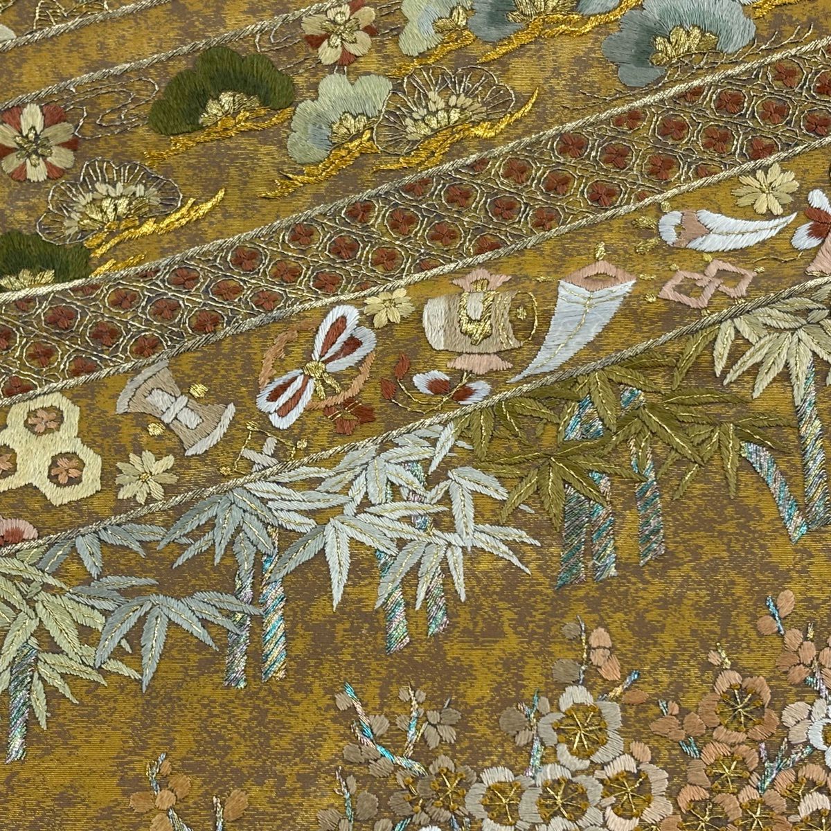 袋帯 逸品 落款あり 篠谷宗兵衛 華文 花鳥 金銀糸 刺繍 金色 六通 正絹