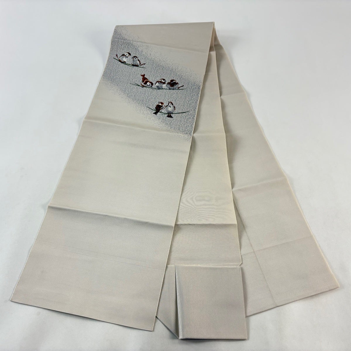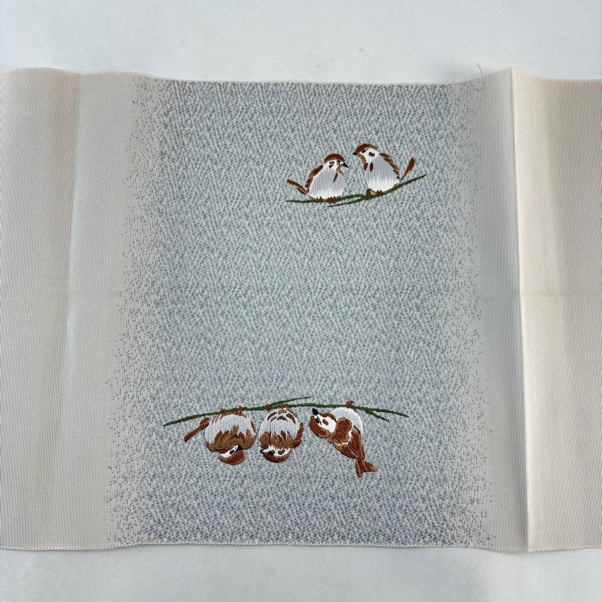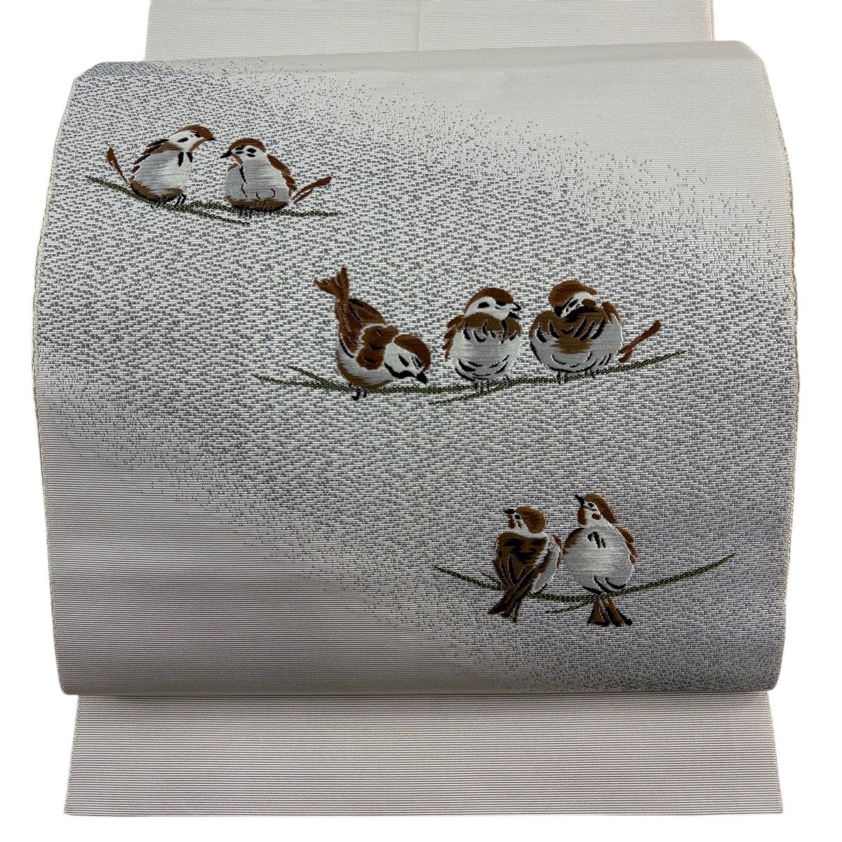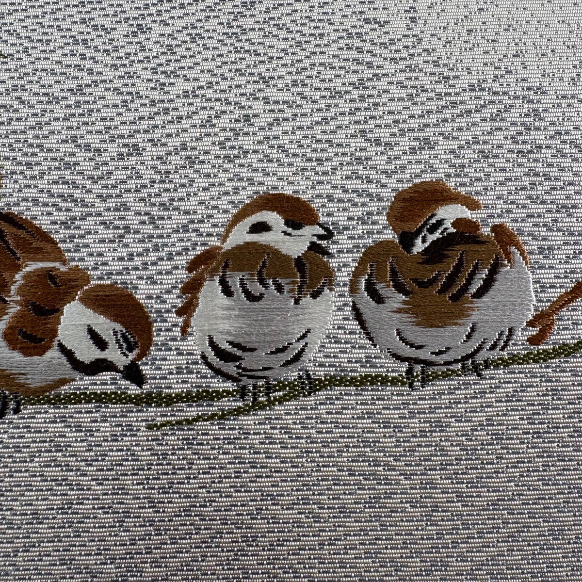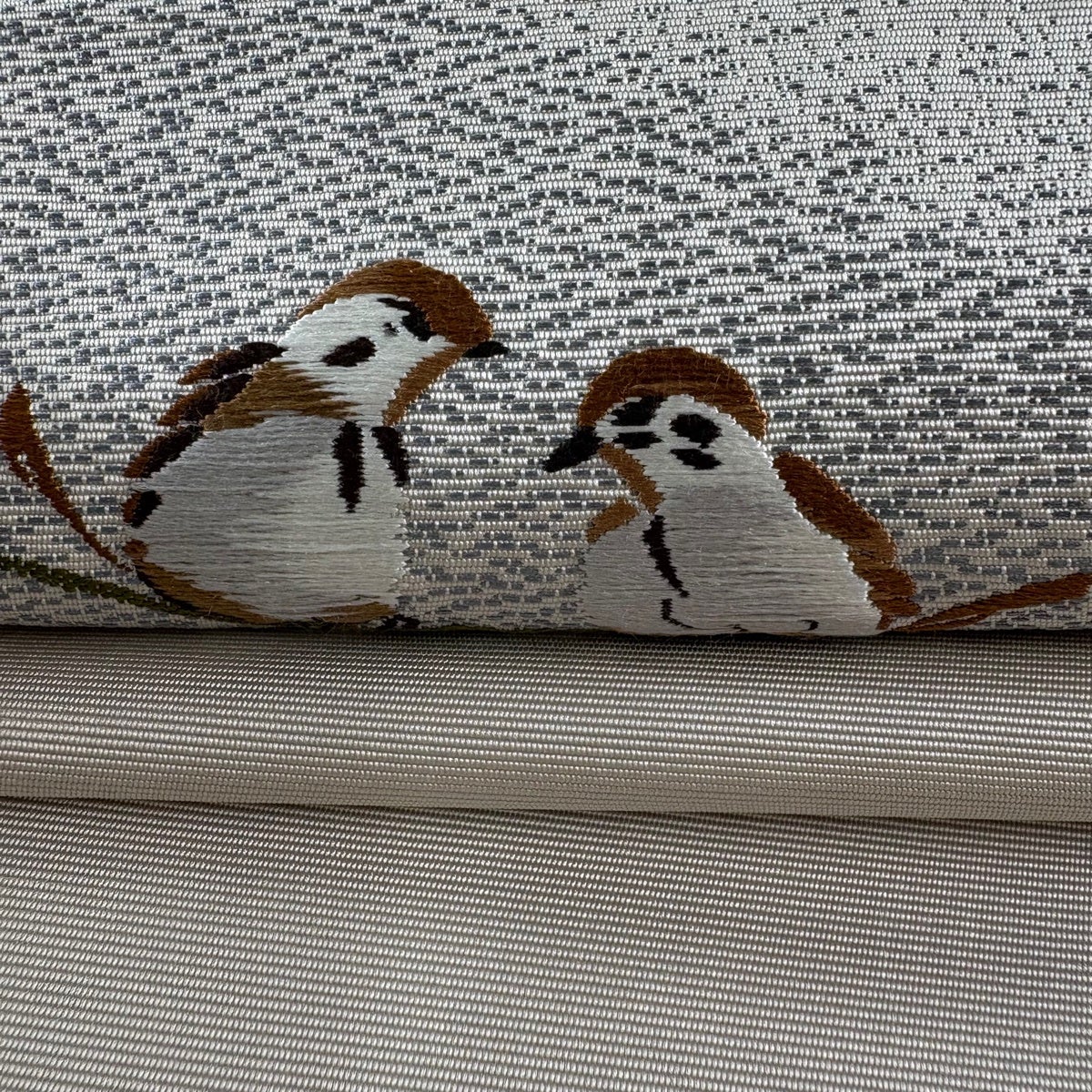 名古屋帯 逸品 祥園 落款あり 八寸名古屋帯 松葉仕立て 雲林綴 雀 灰茶 正絹