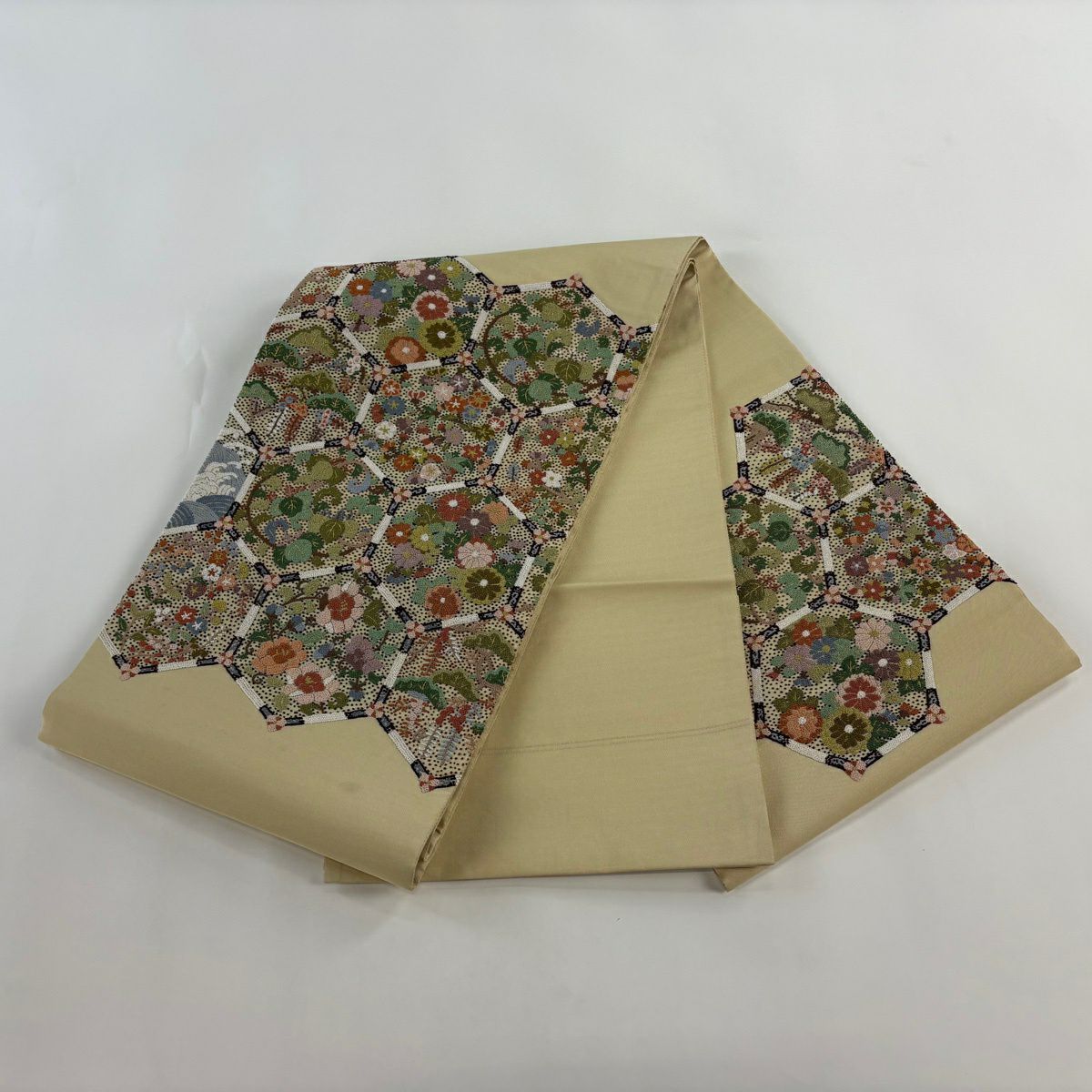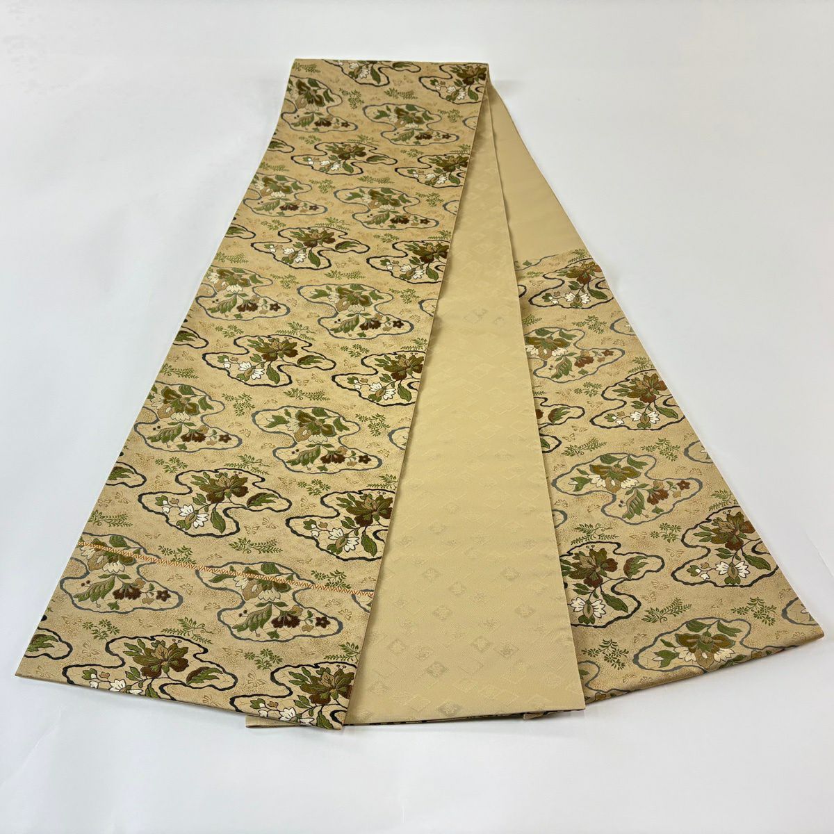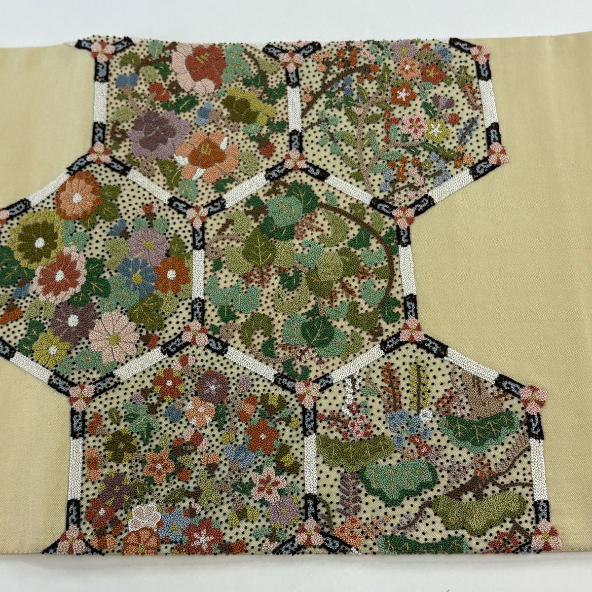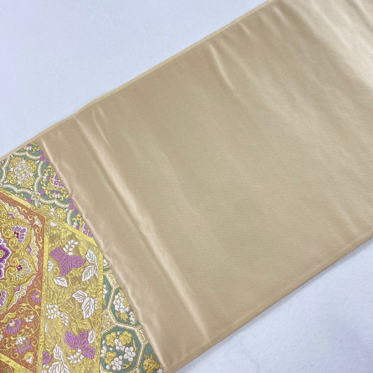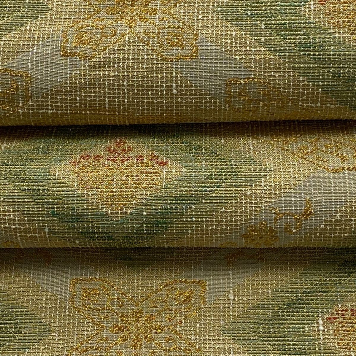 【美品】 袋帯 逸品 亀甲 草花 相良刺繍 金糸 ベージュ お太鼓柄 正絹