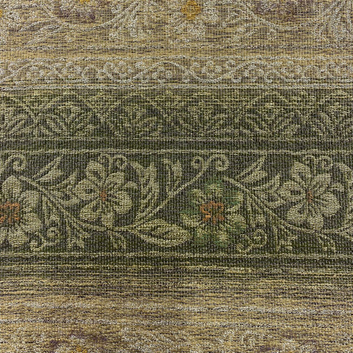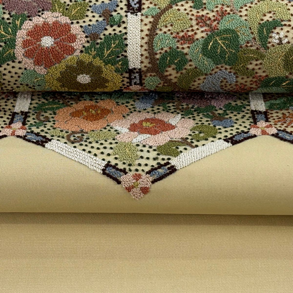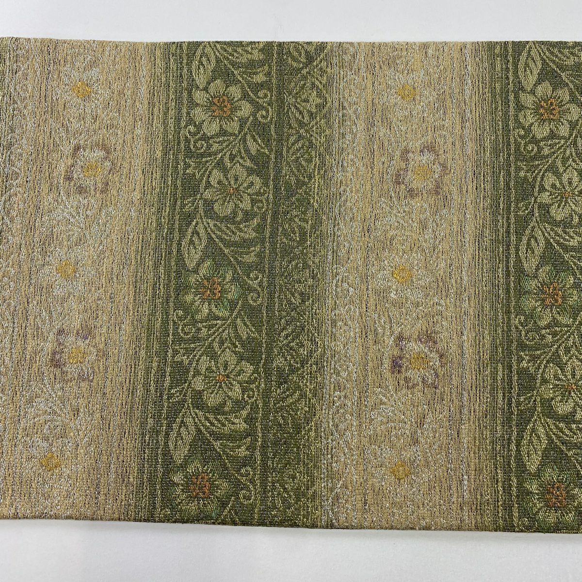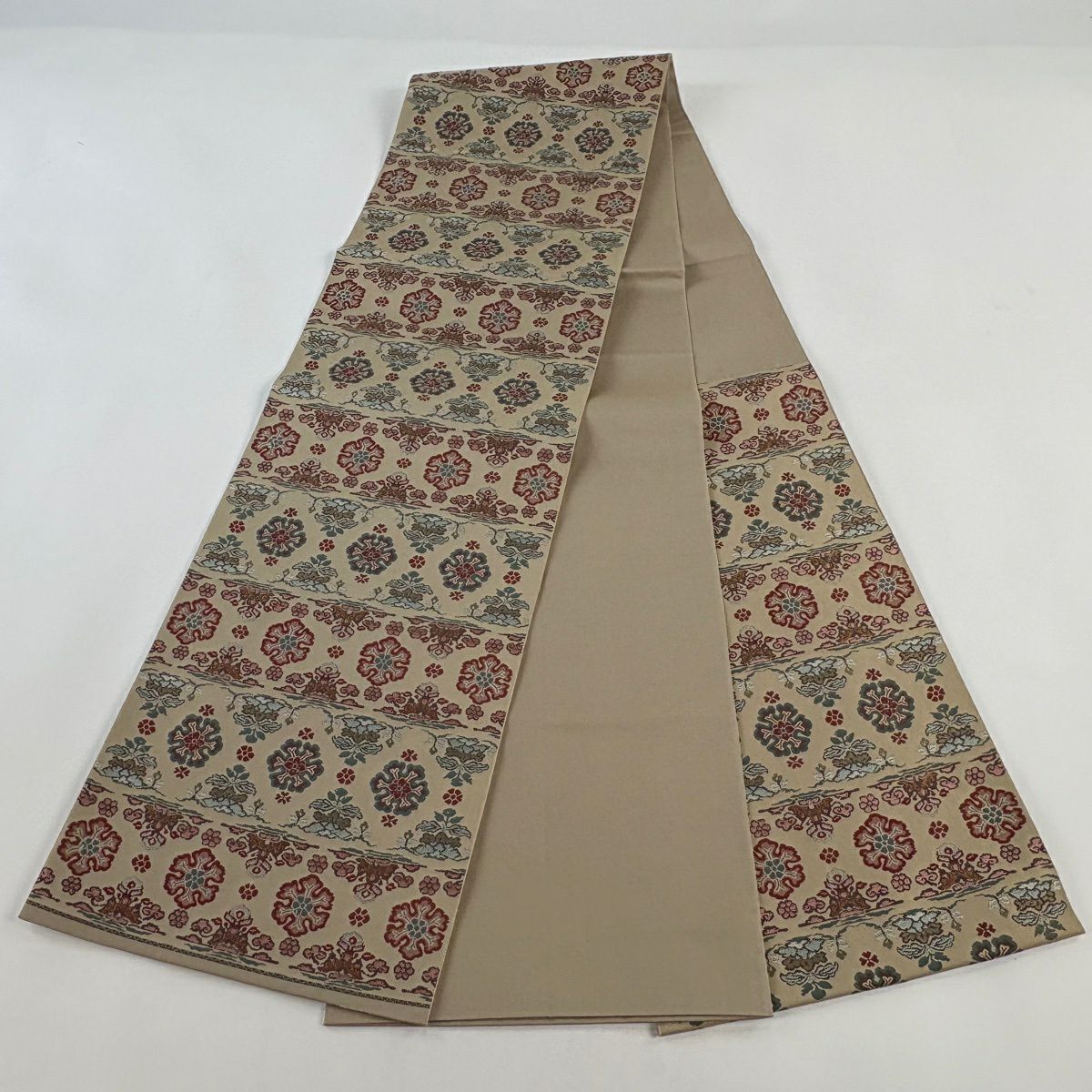 【美品】 袋帯 逸品 亀甲 草花 相良刺繍 金糸 ベージュ お太鼓柄 正絹