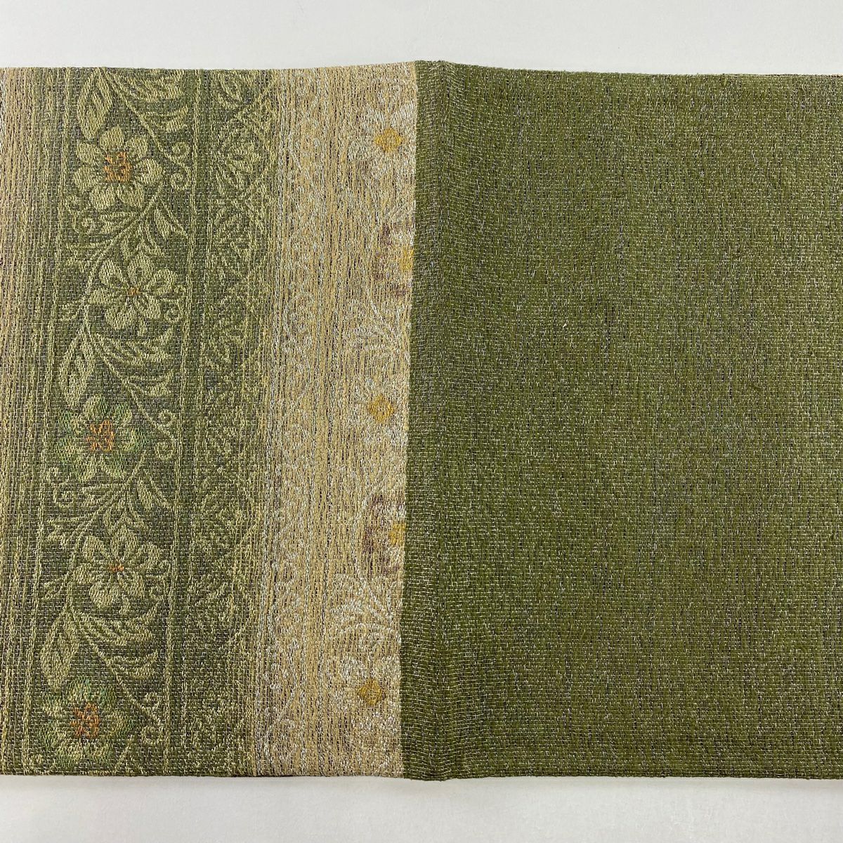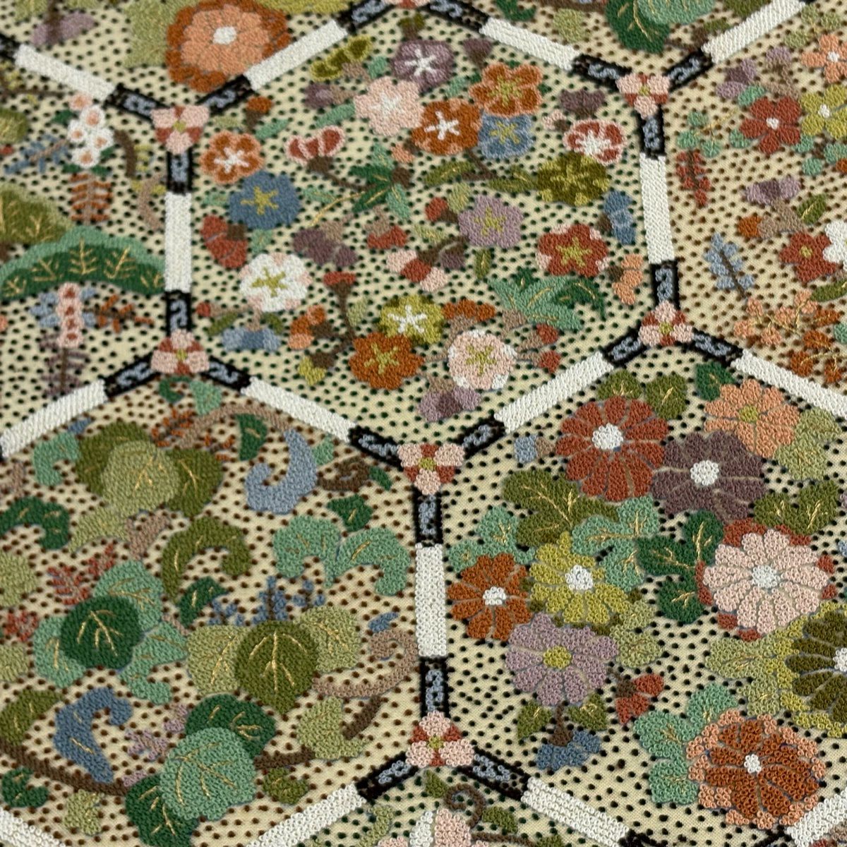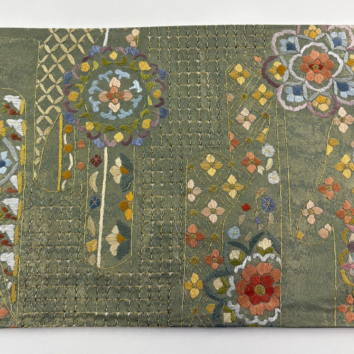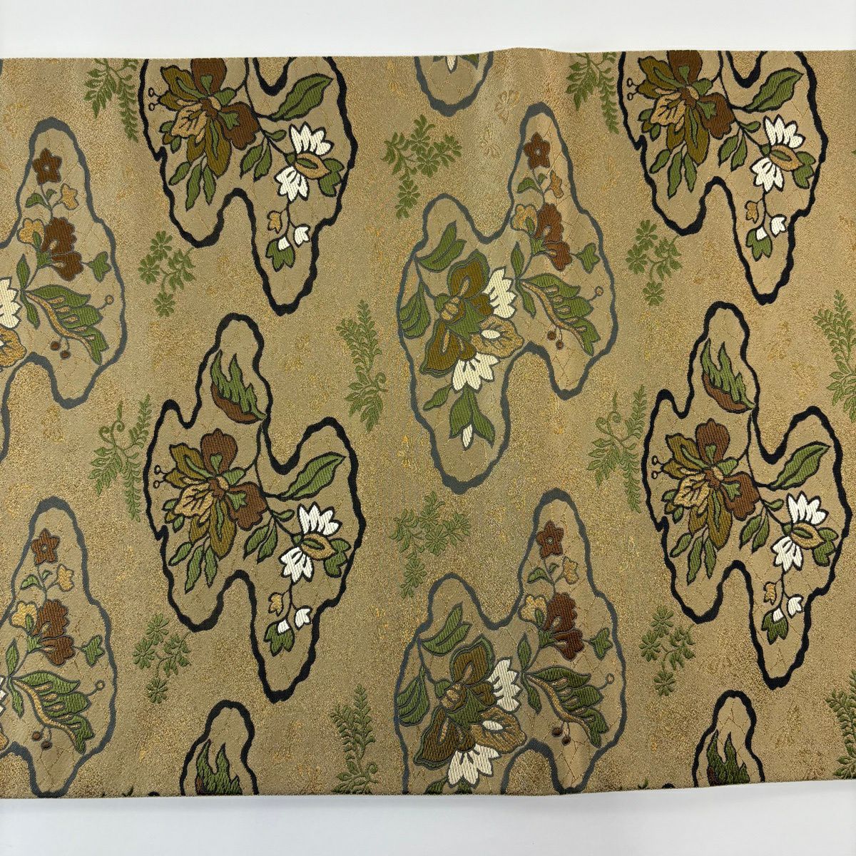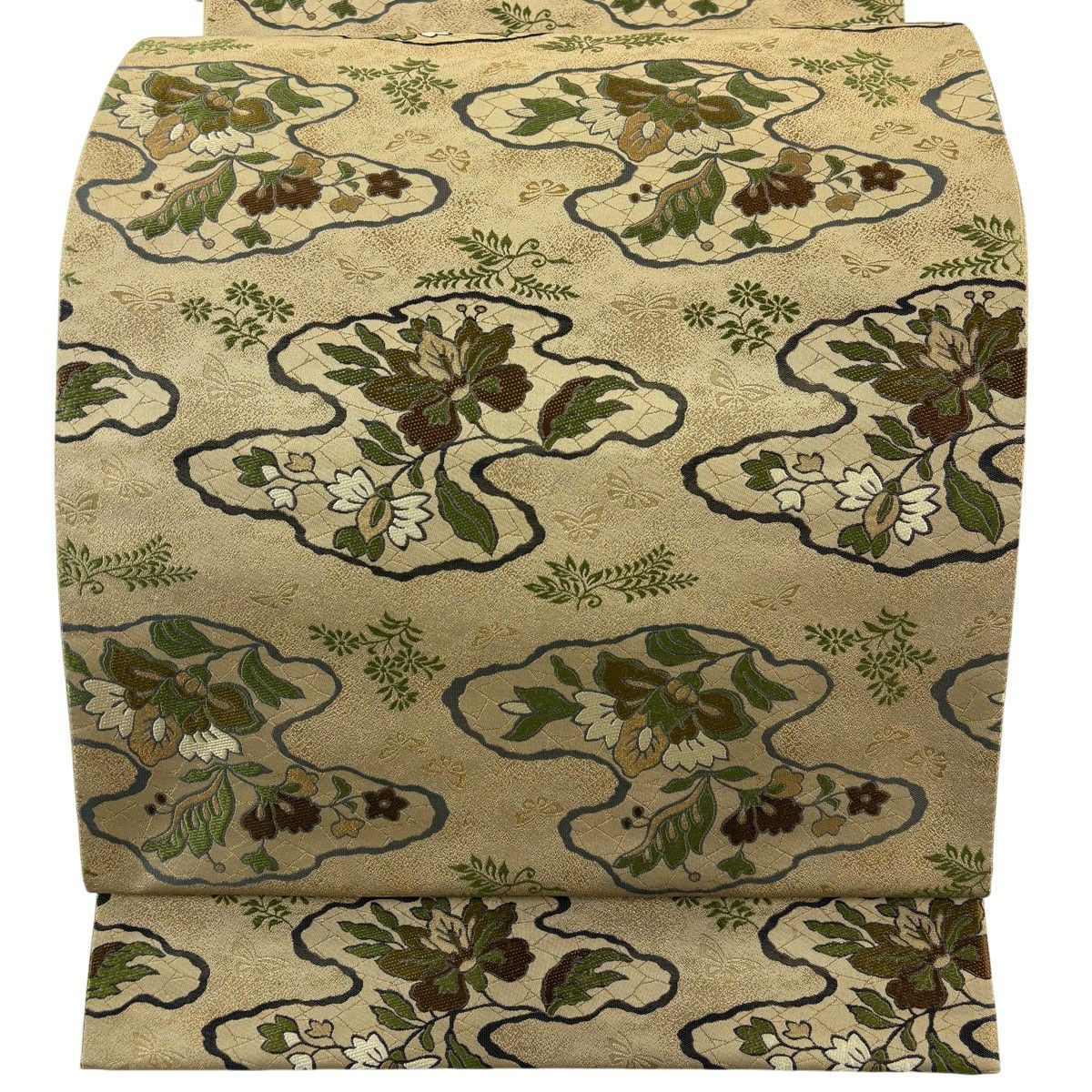 【美品】 袋帯 逸品 亀甲 草花 相良刺繍 金糸 ベージュ お太鼓柄 正絹