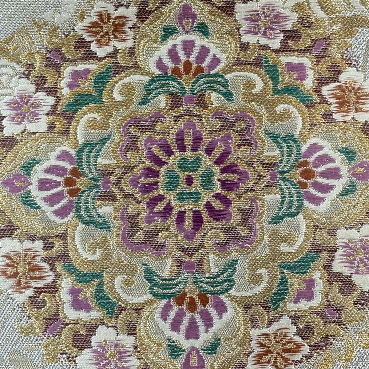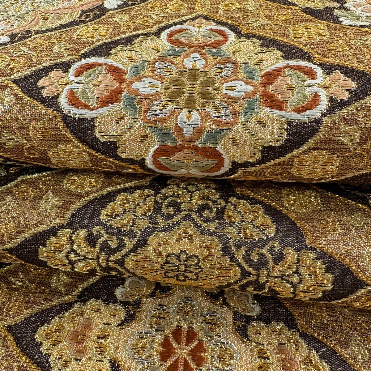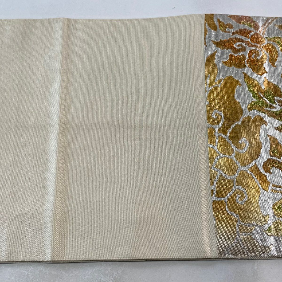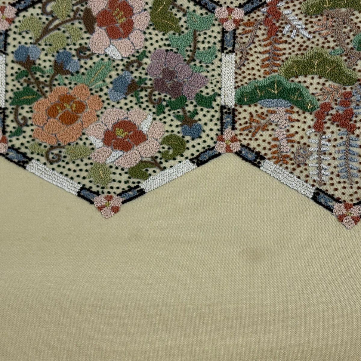 【美品】 袋帯 逸品 亀甲 草花 相良刺繍 金糸 ベージュ お太鼓柄 正絹