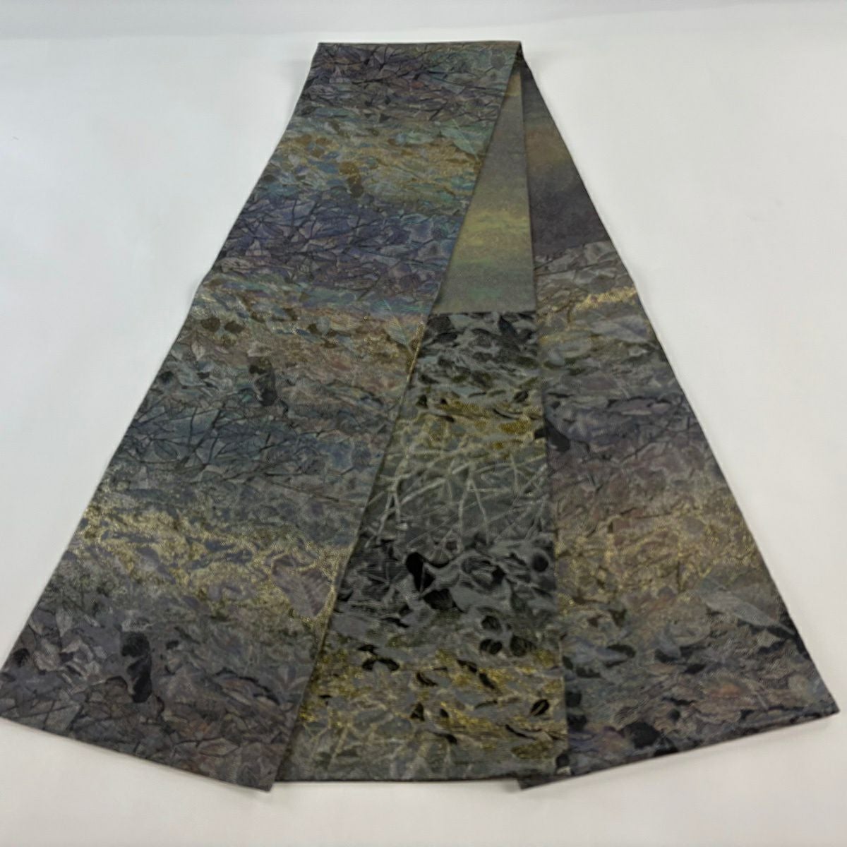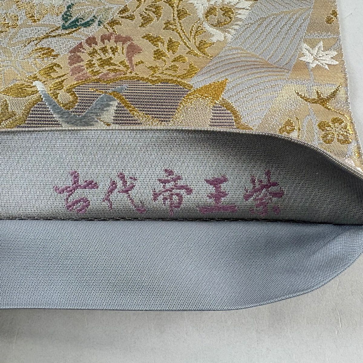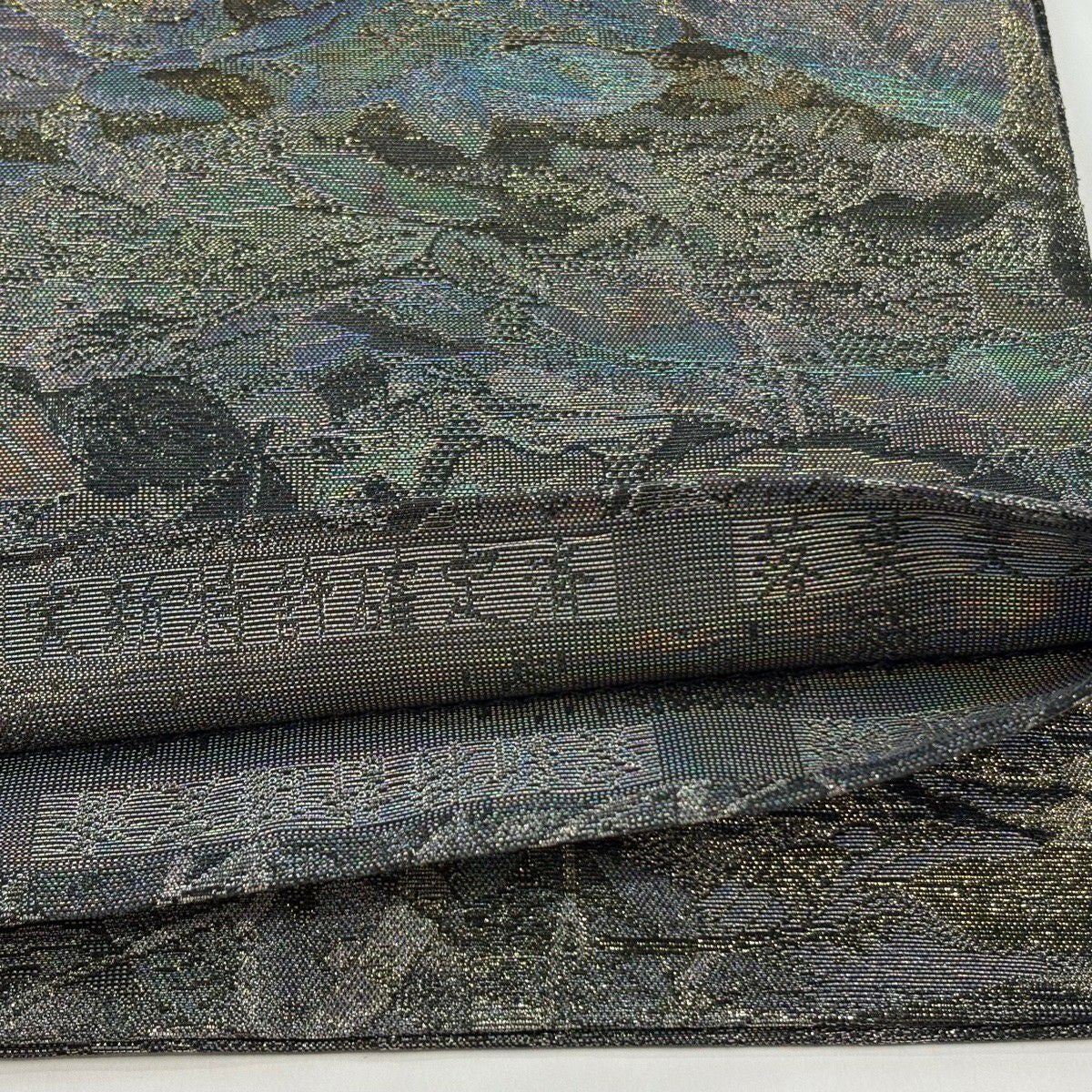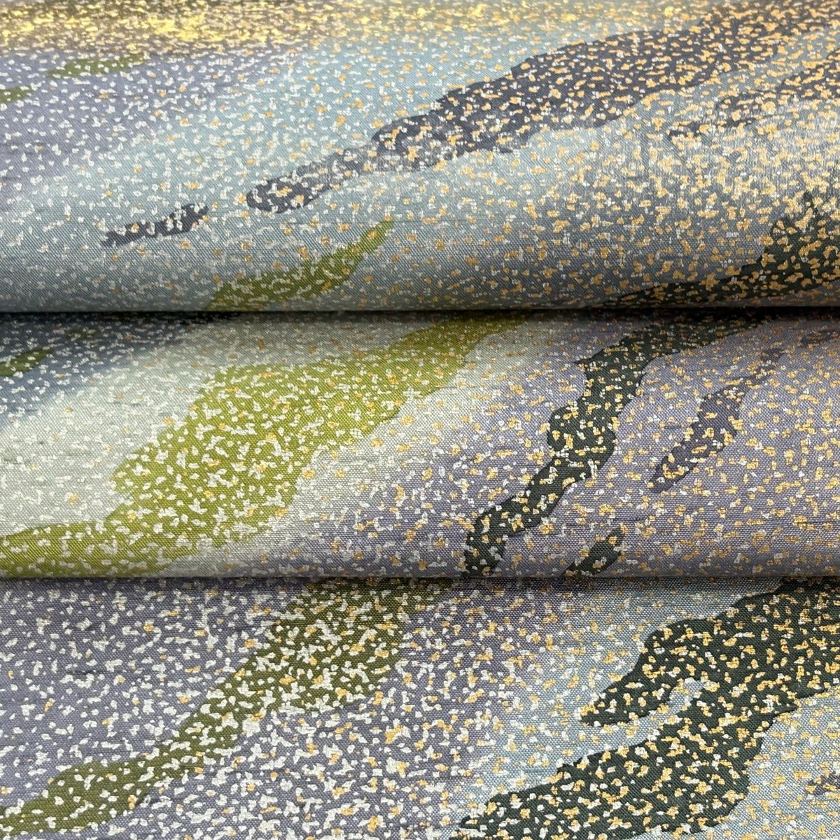 【美品】 袋帯 逸品 佐波理 落款あり 佐波理綴 落葉未定 銀糸 箔 灰色 六通 正絹