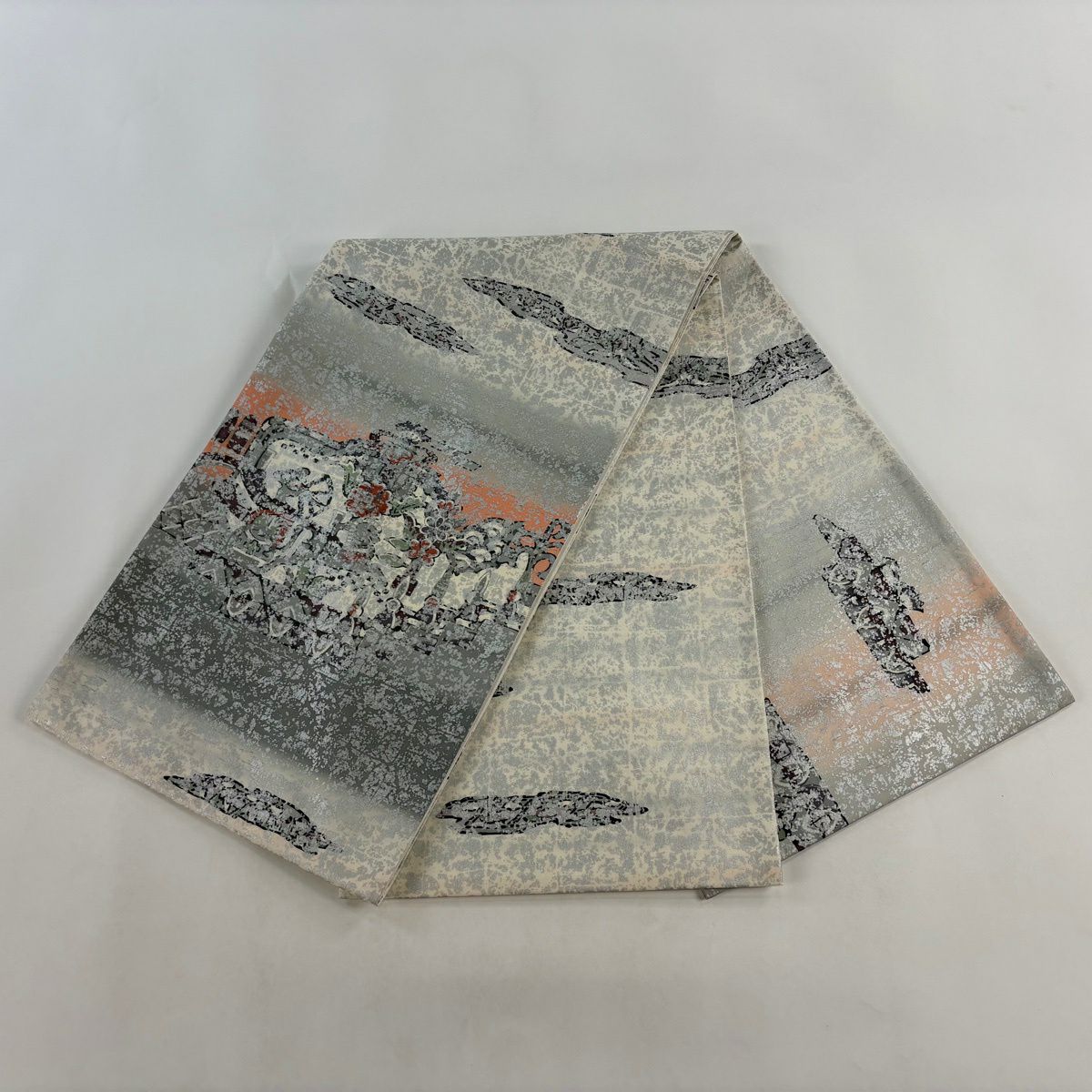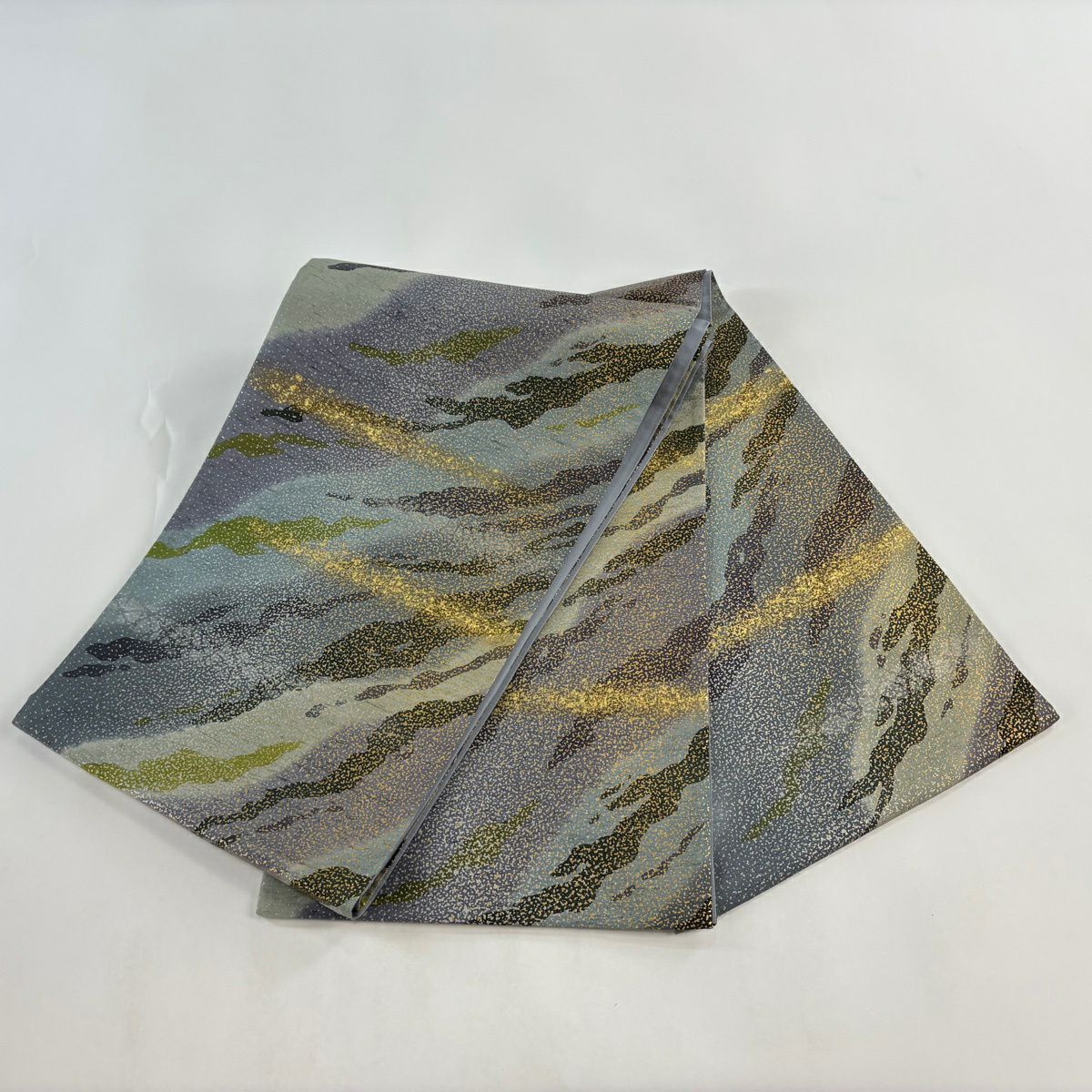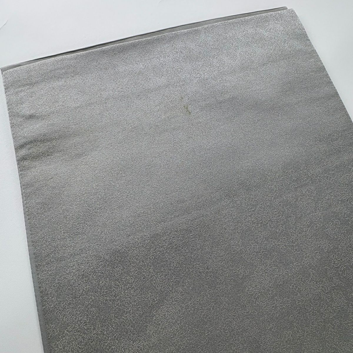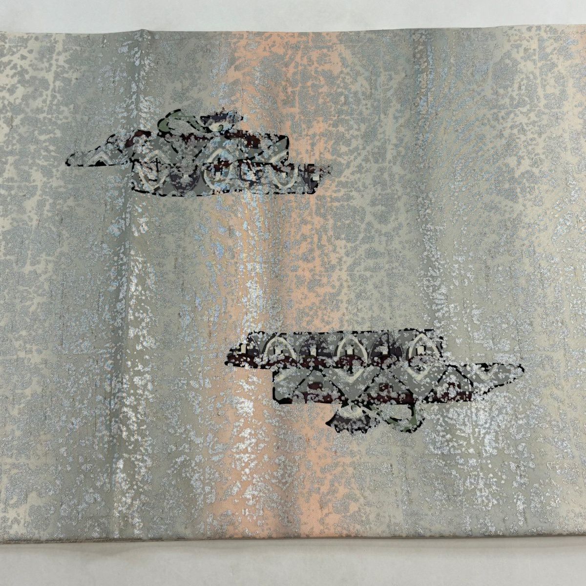 【美品】 袋帯 逸品 佐波理 落款あり 佐波理綴 落葉未定 銀糸 箔 灰色 六通 正絹