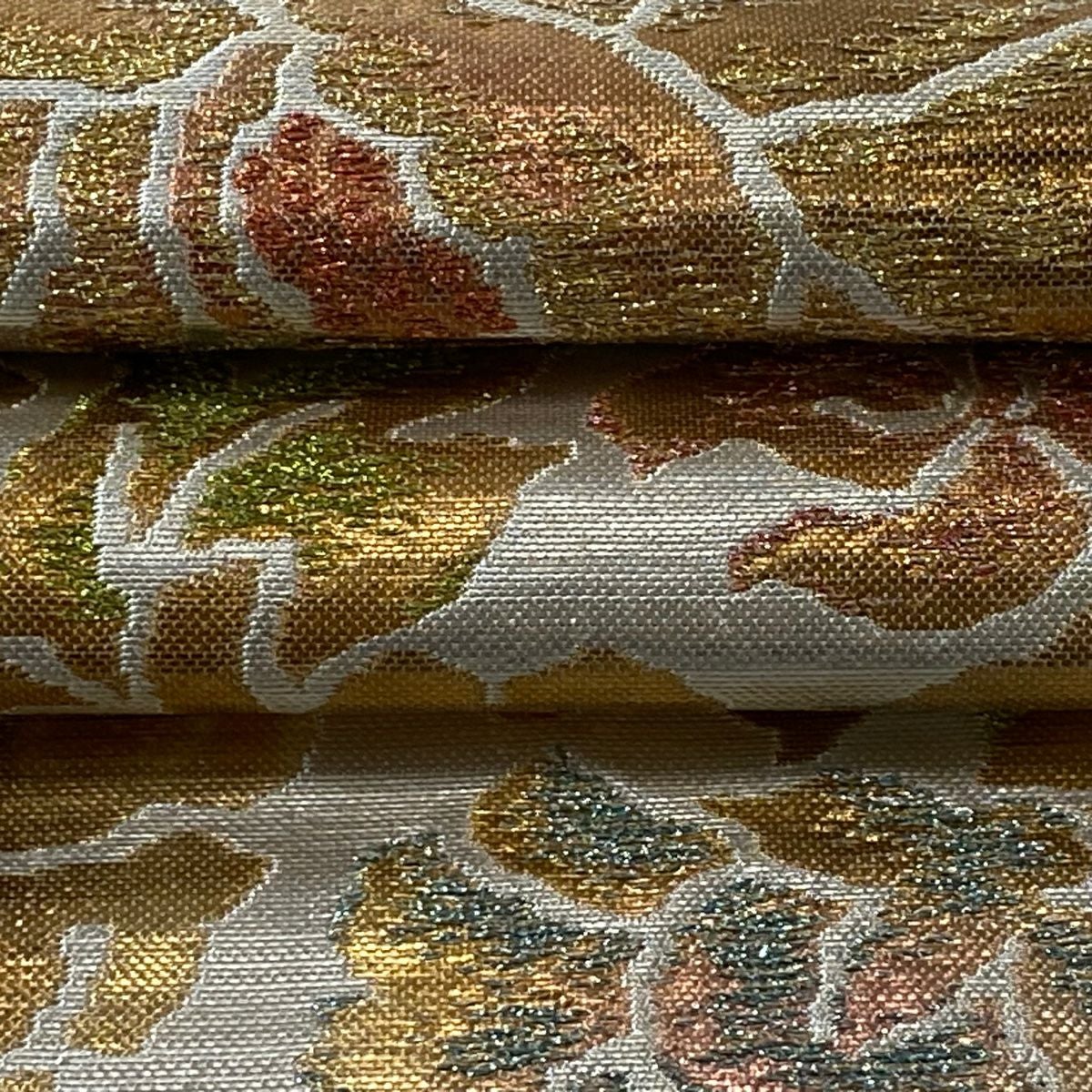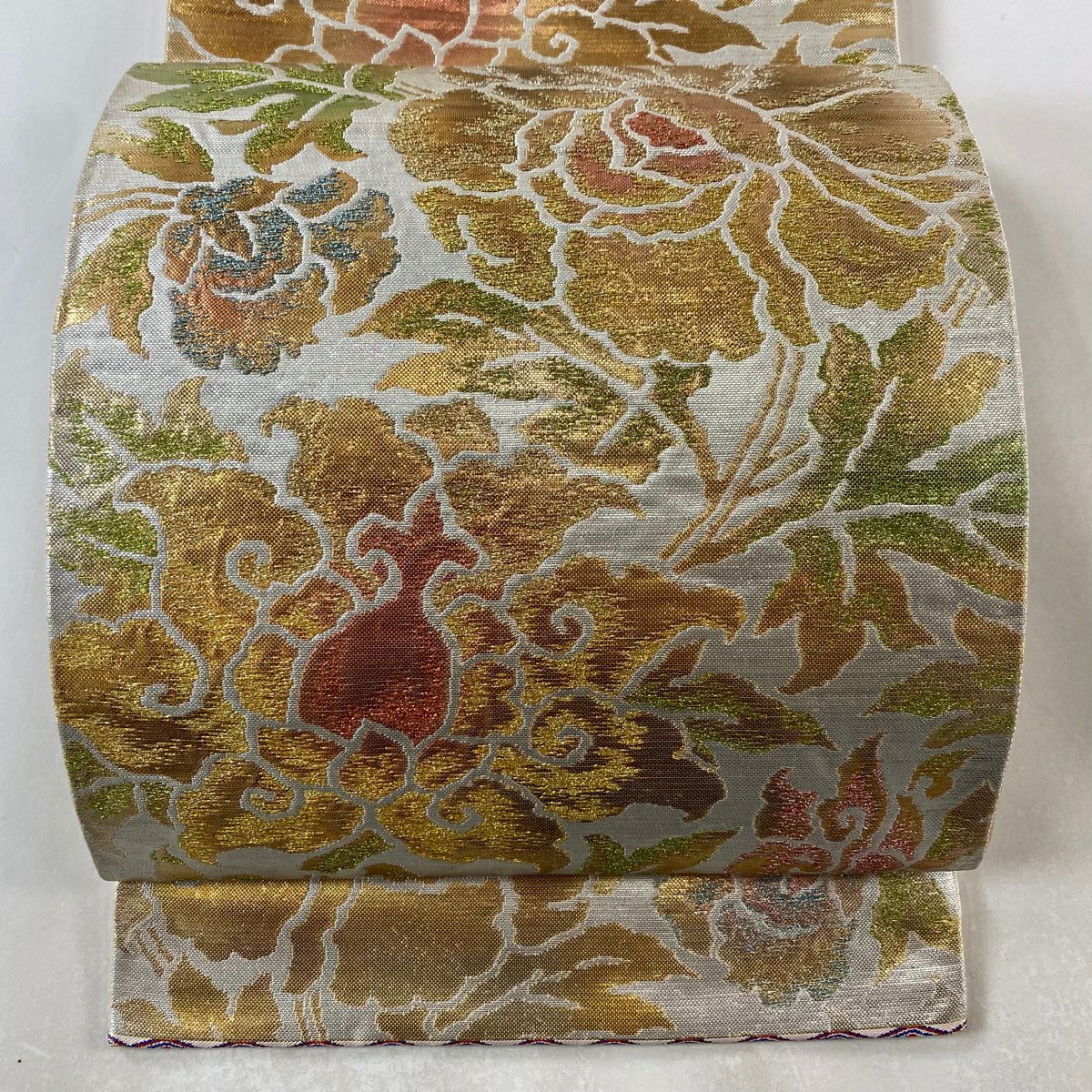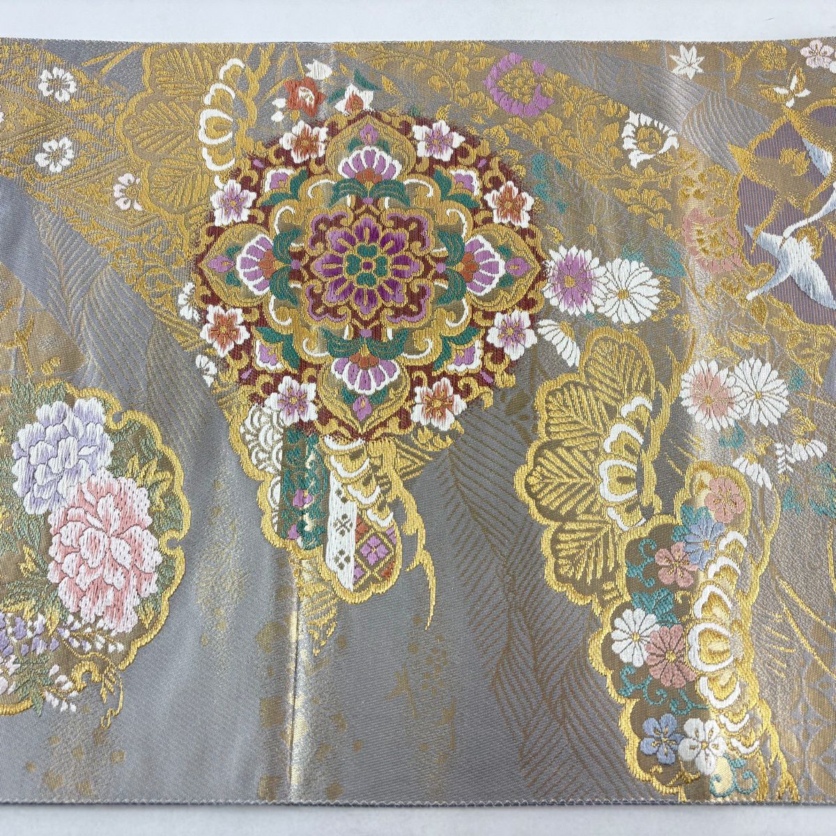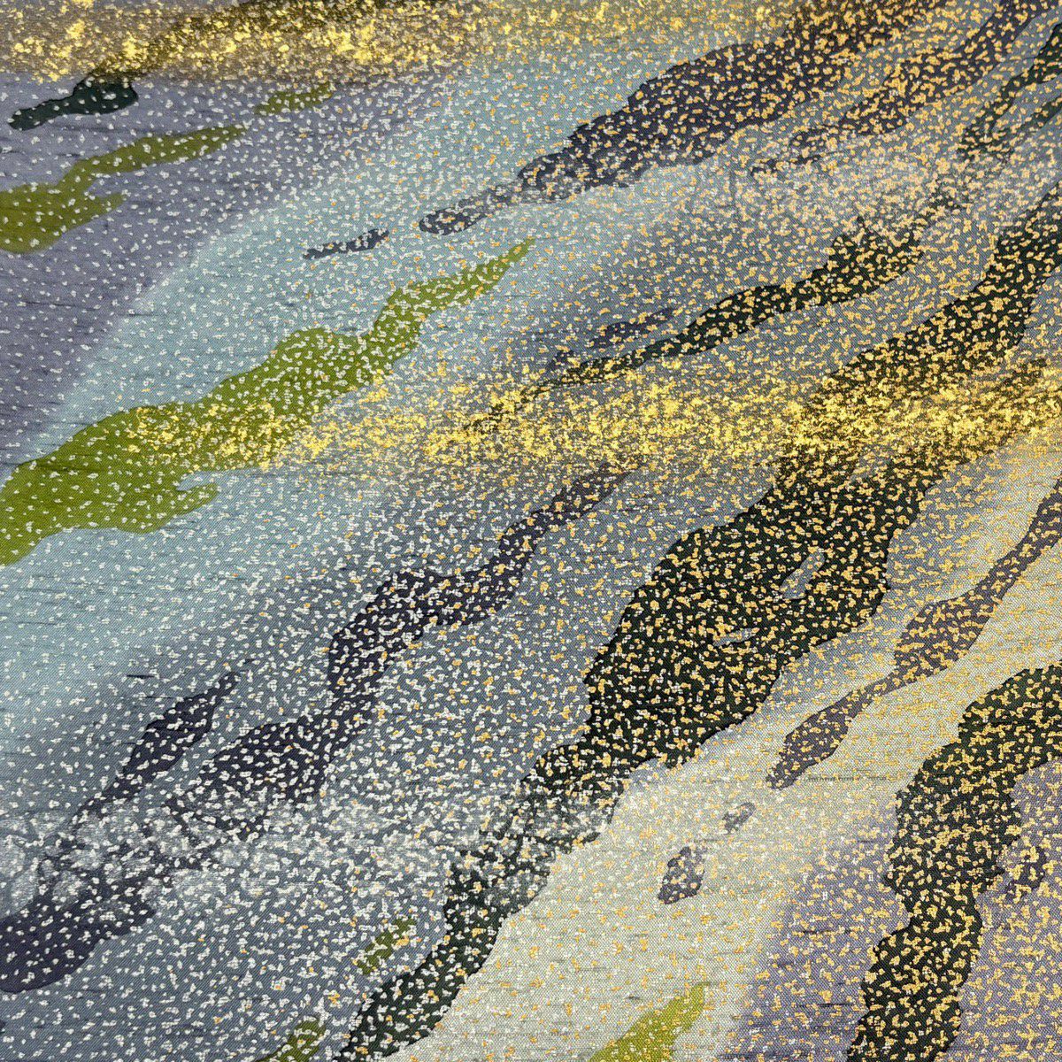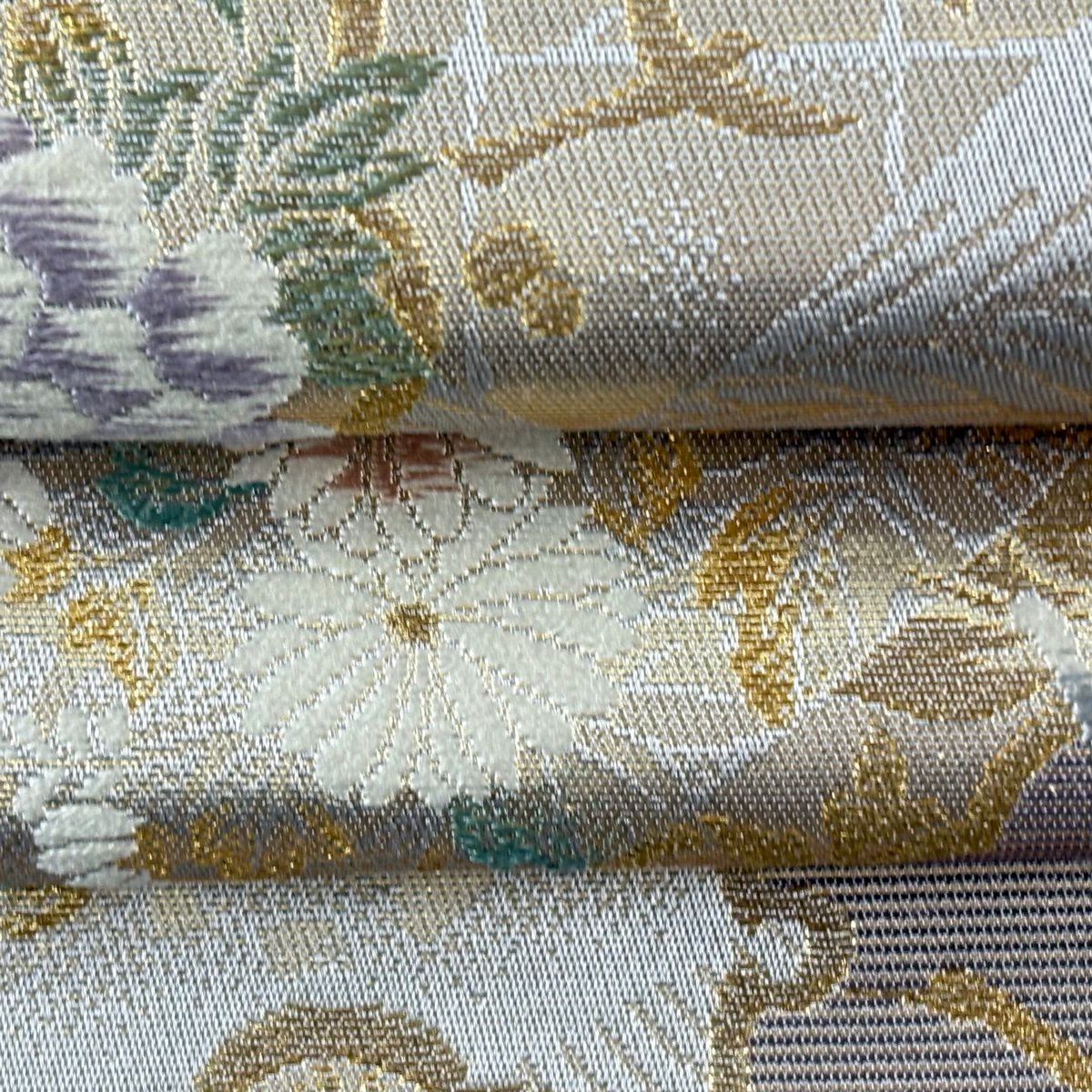 【美品】 袋帯 逸品 佐波理 落款あり 佐波理綴 落葉未定 銀糸 箔 灰色 六通 正絹