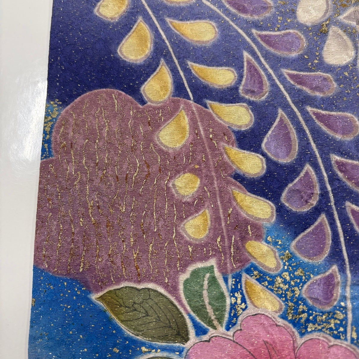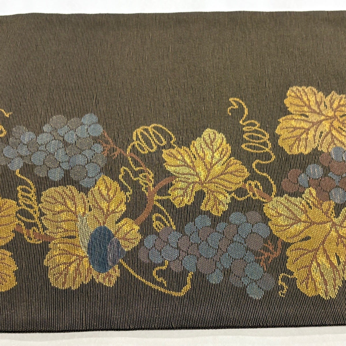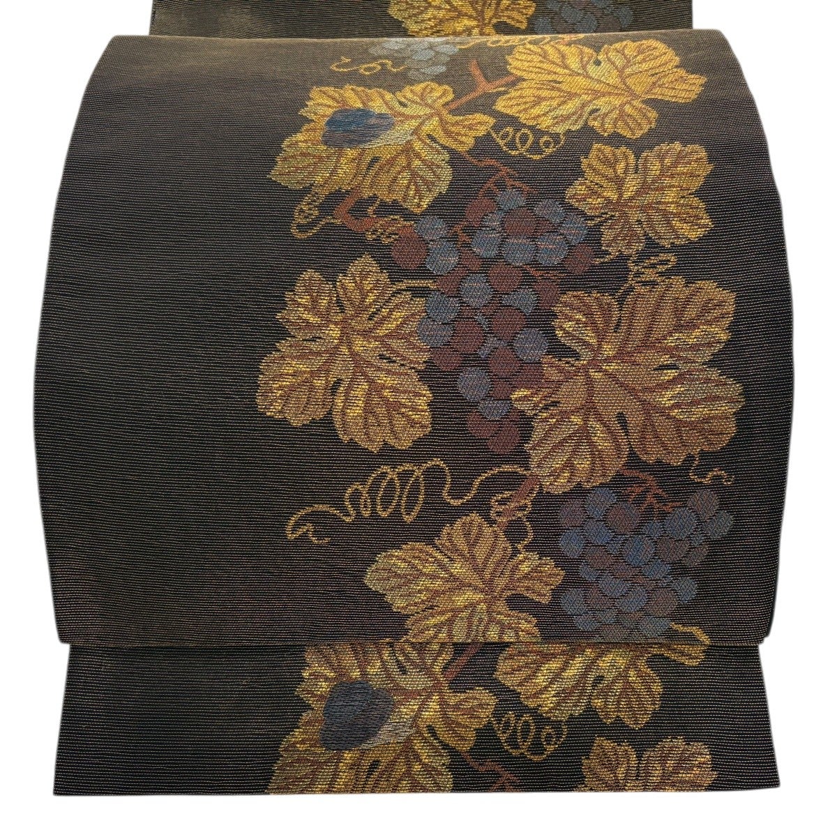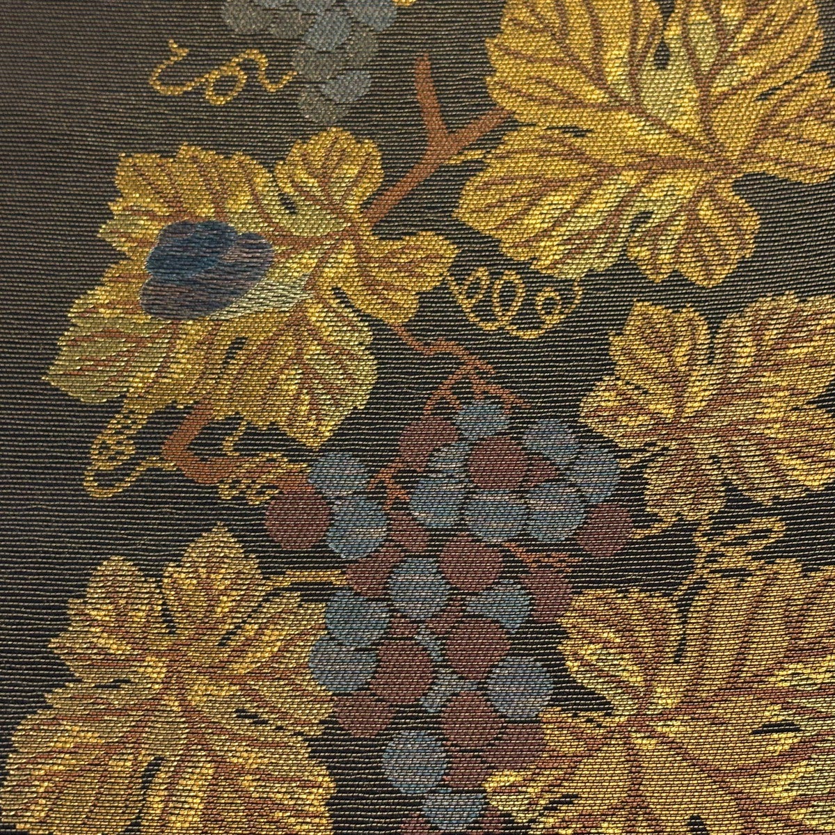 袋帯 逸品 じゅらく 帝王紫 扇面 草花 金銀糸 刺繍 灰色 お太鼓柄 正絹