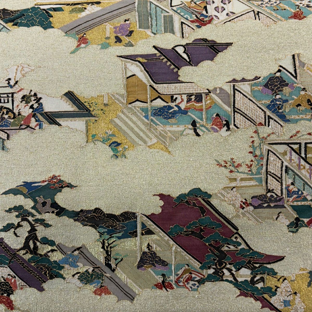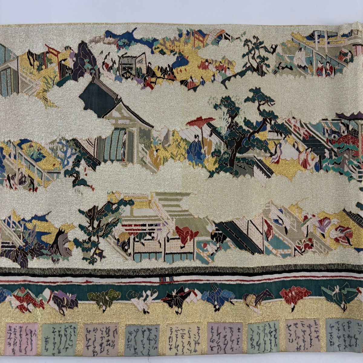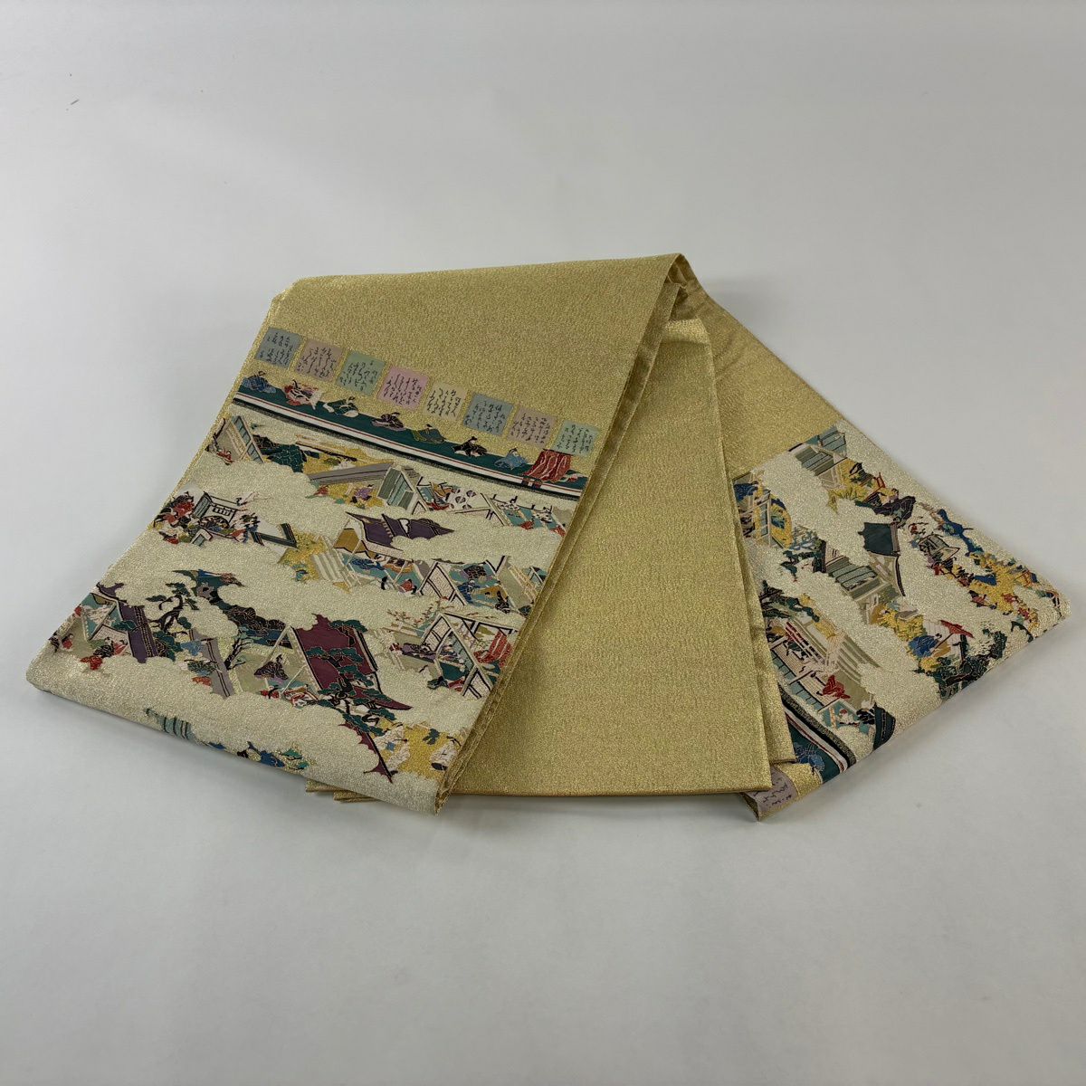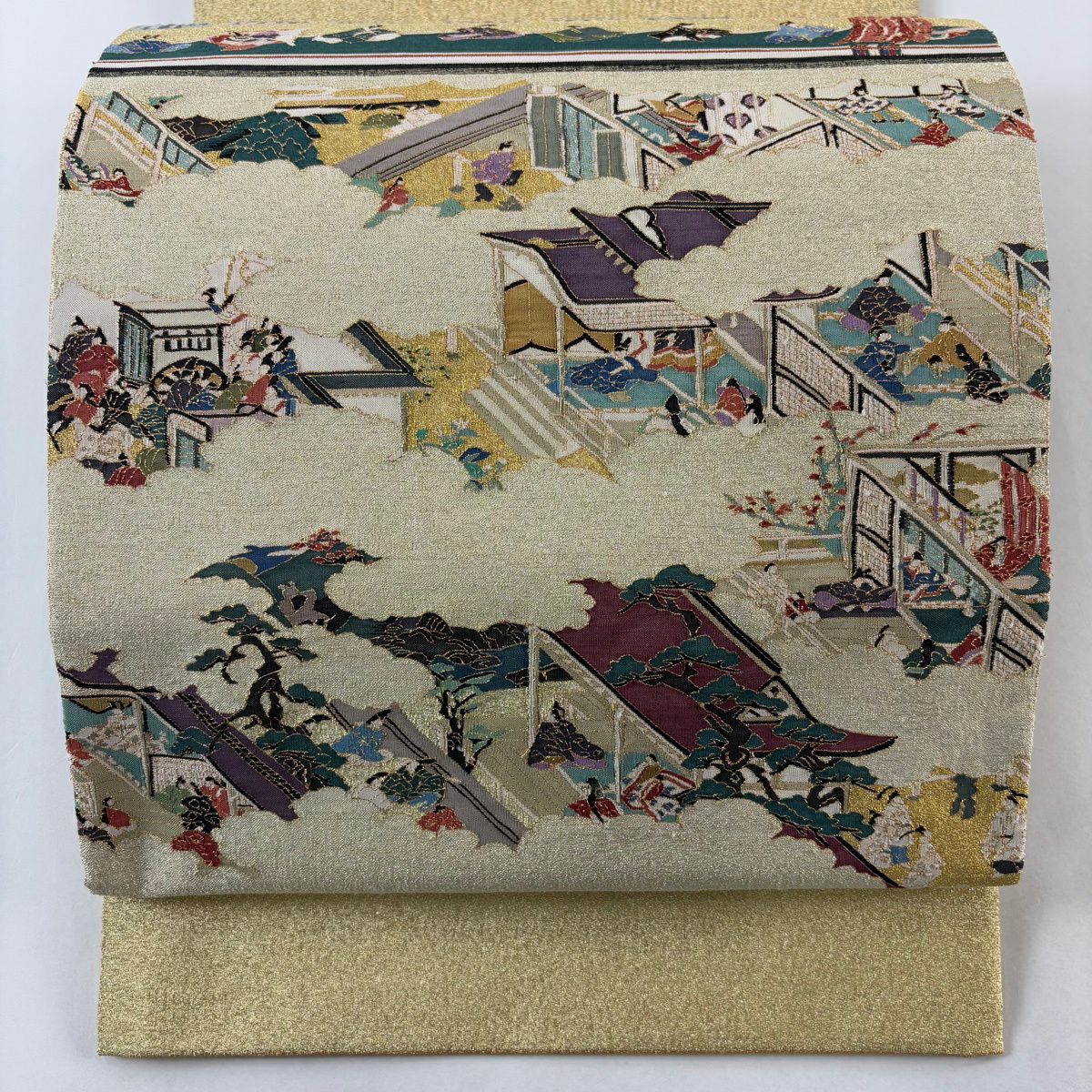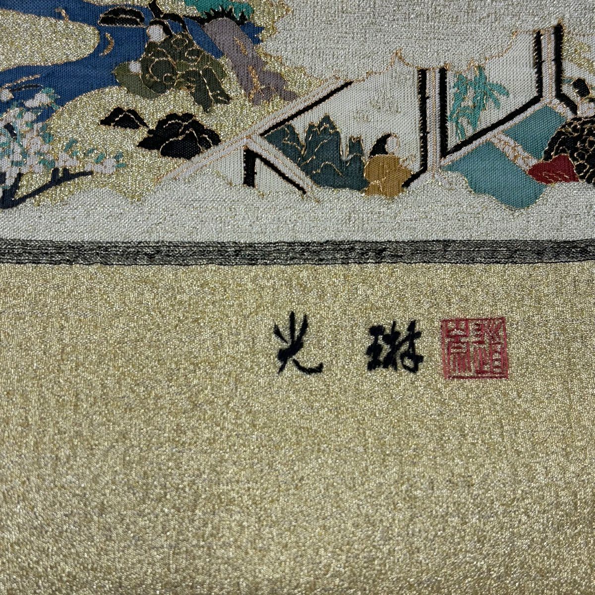 【美品】 袋帯 逸品 松尾光琳 落款あり 人物 雲文 金糸 金色 お太鼓柄 正絹