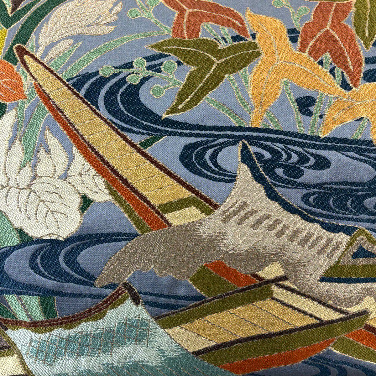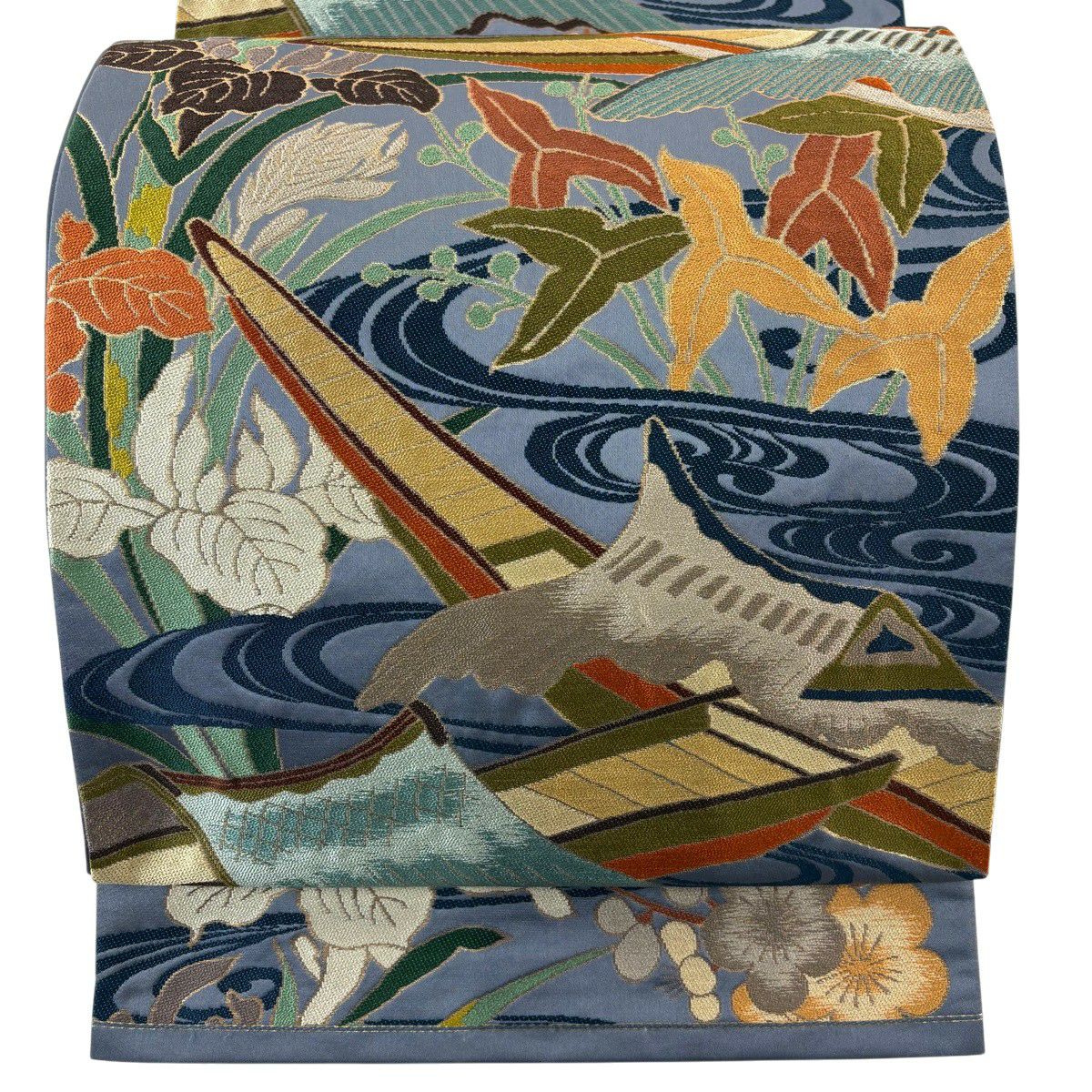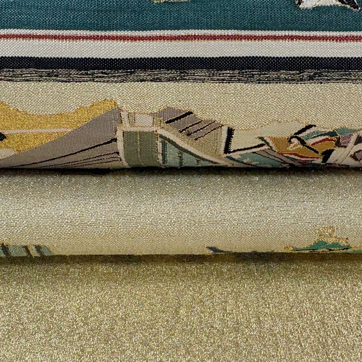 袋帯 逸品 白綾苑大庭 落款あり 関西仕立て 舟 流水 箔 青灰色 六通 正絹