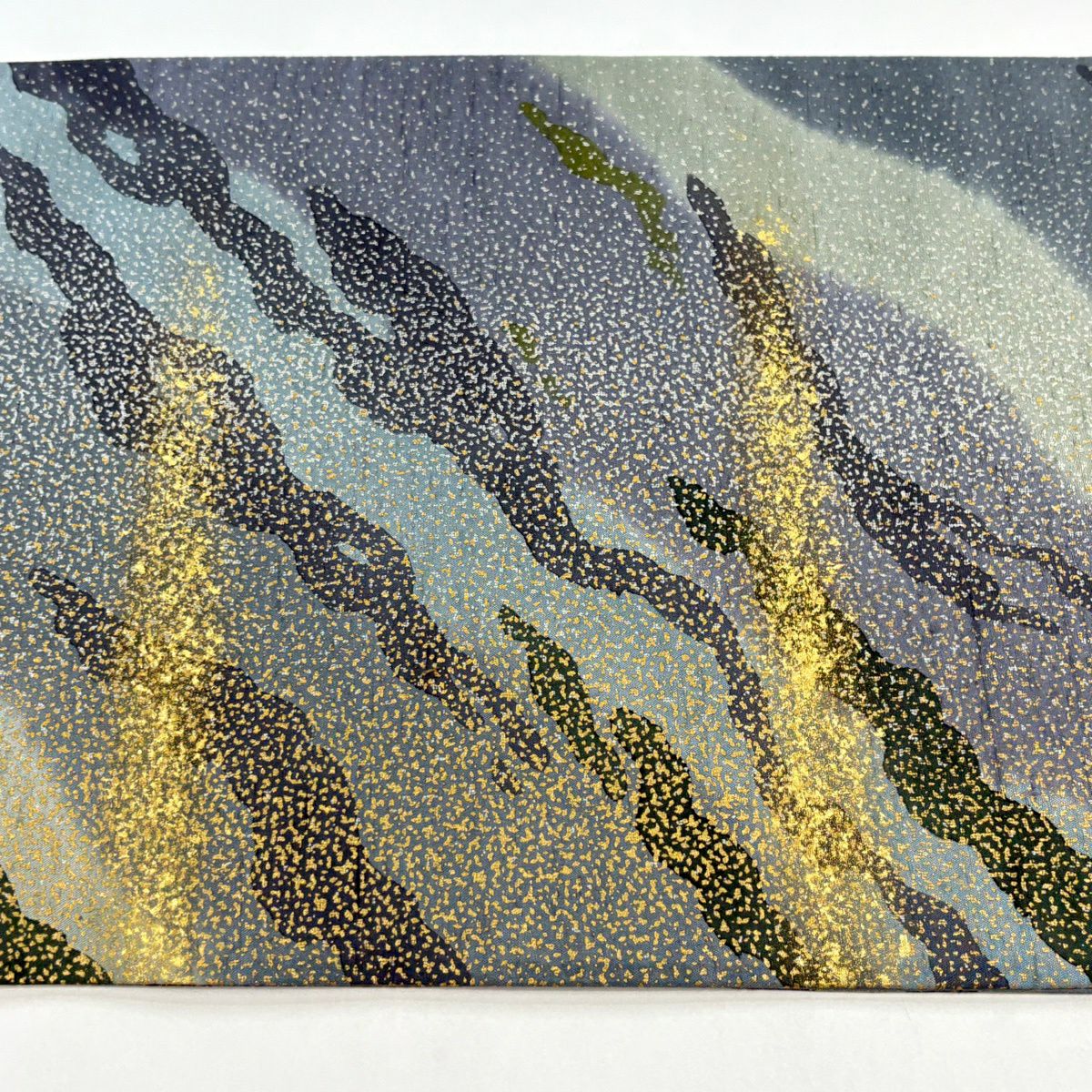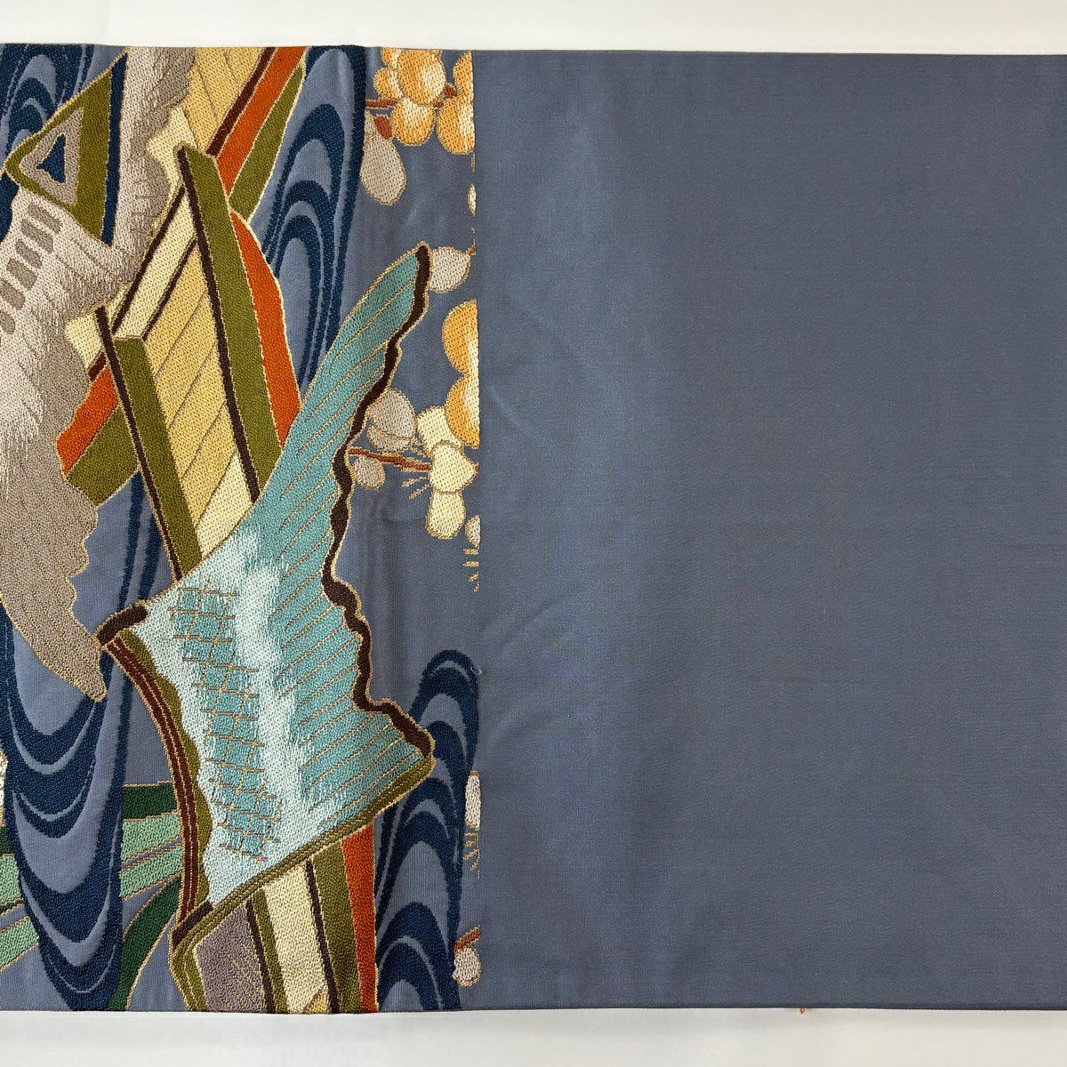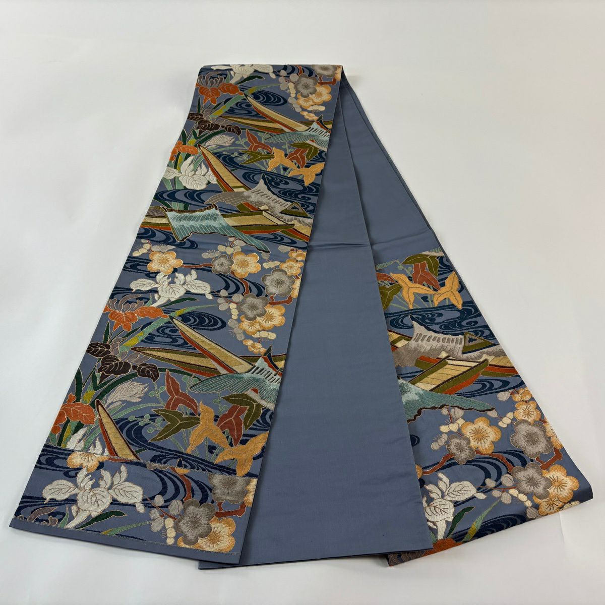 袋帯 逸品 白綾苑大庭 落款あり 関西仕立て 舟 流水 箔 青灰色 六通 正絹