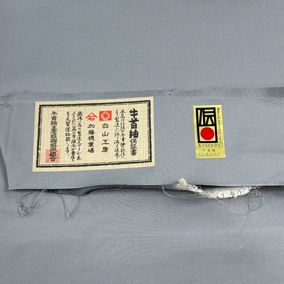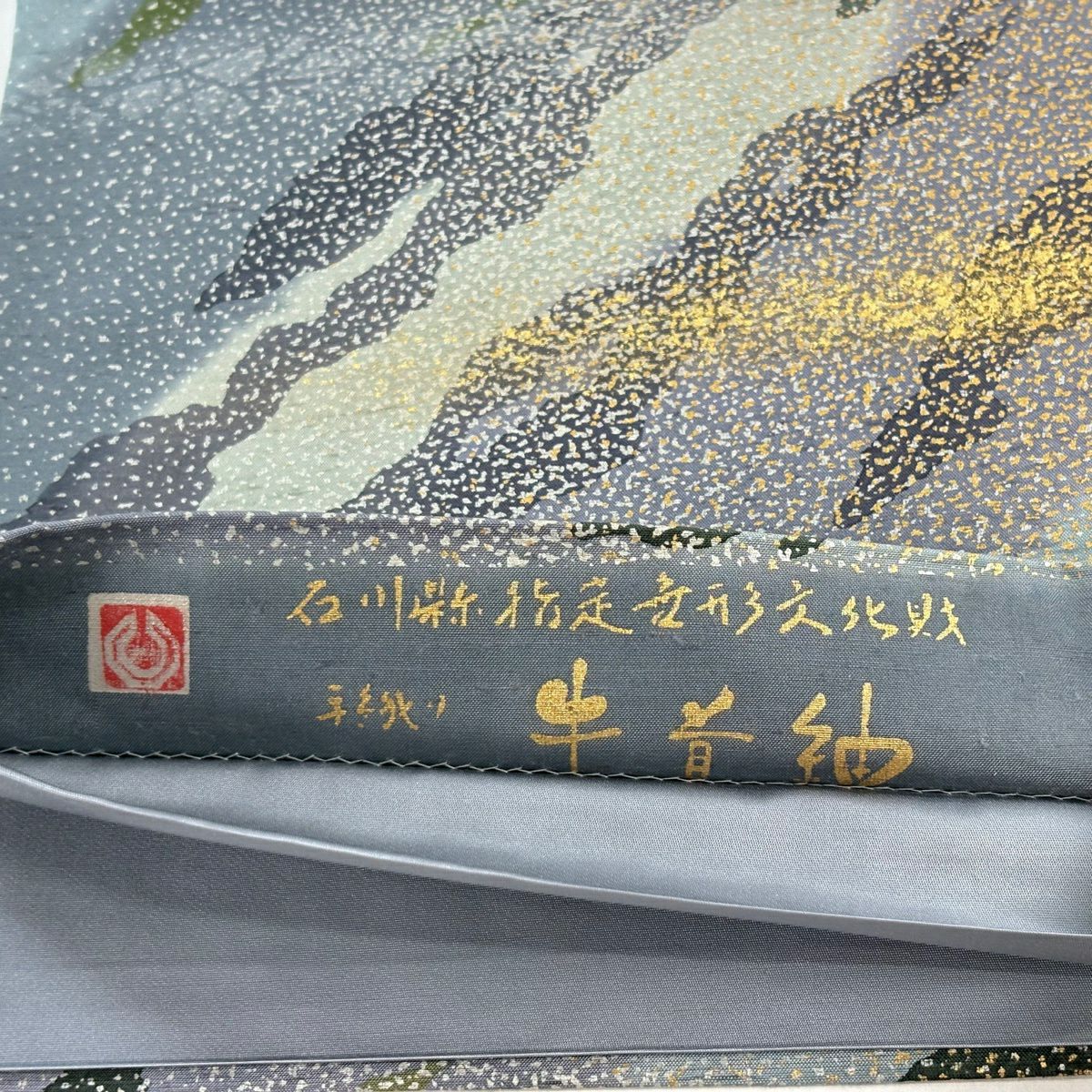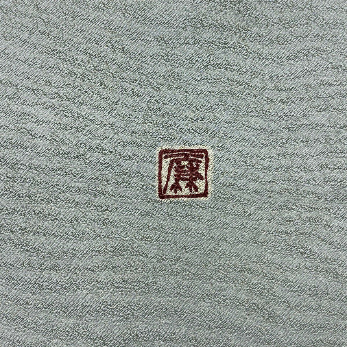 【美品】 袋帯 逸品 落款あり 証紙あり 牛首紬地 霞 金彩 青灰色 全通 正絹