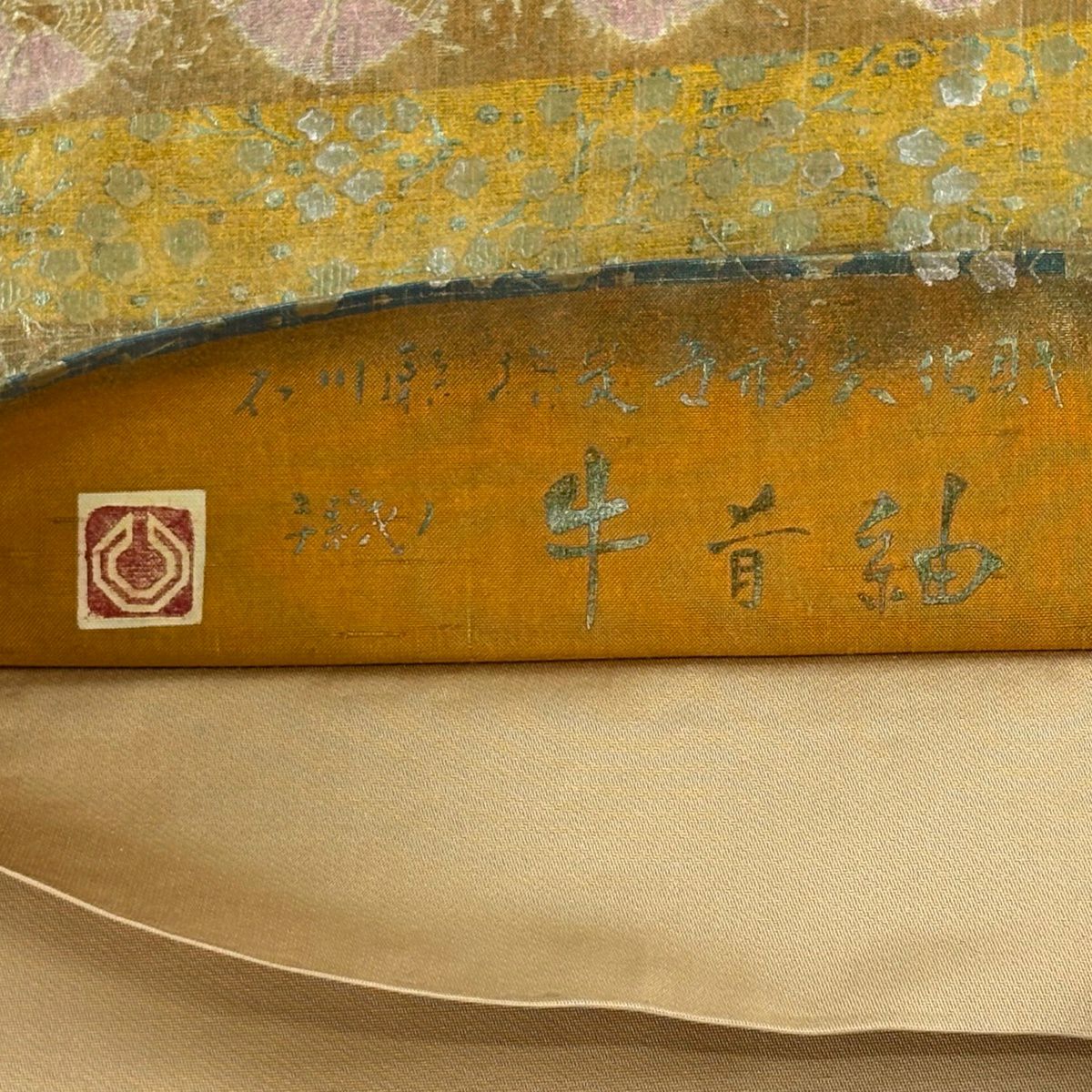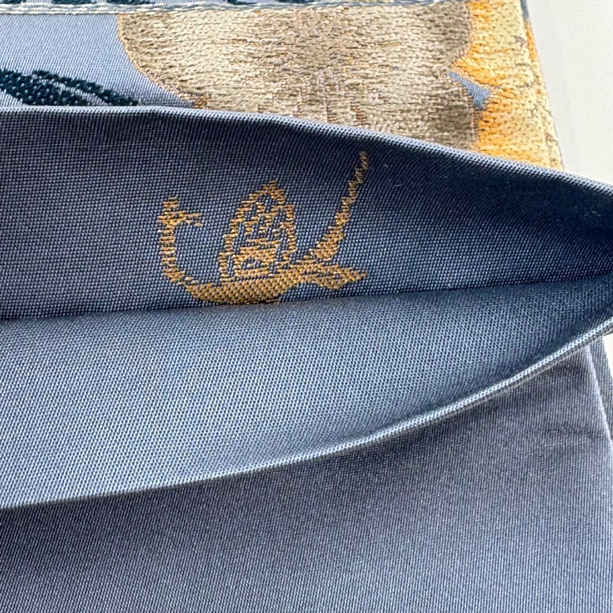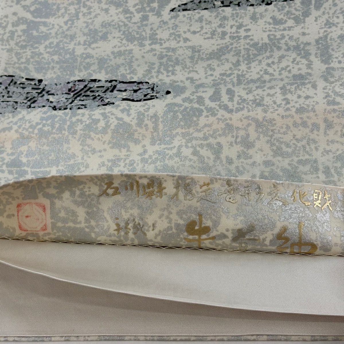【美品】 袋帯 逸品 落款あり 証紙あり 牛首紬地 霞 金彩 青灰色 全通 正絹