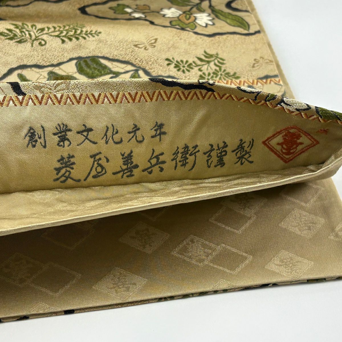 【美品】 袋帯 逸品 菱屋善兵衛 落款あり 草花 霞 金糸 薄茶色 六通 正絹
