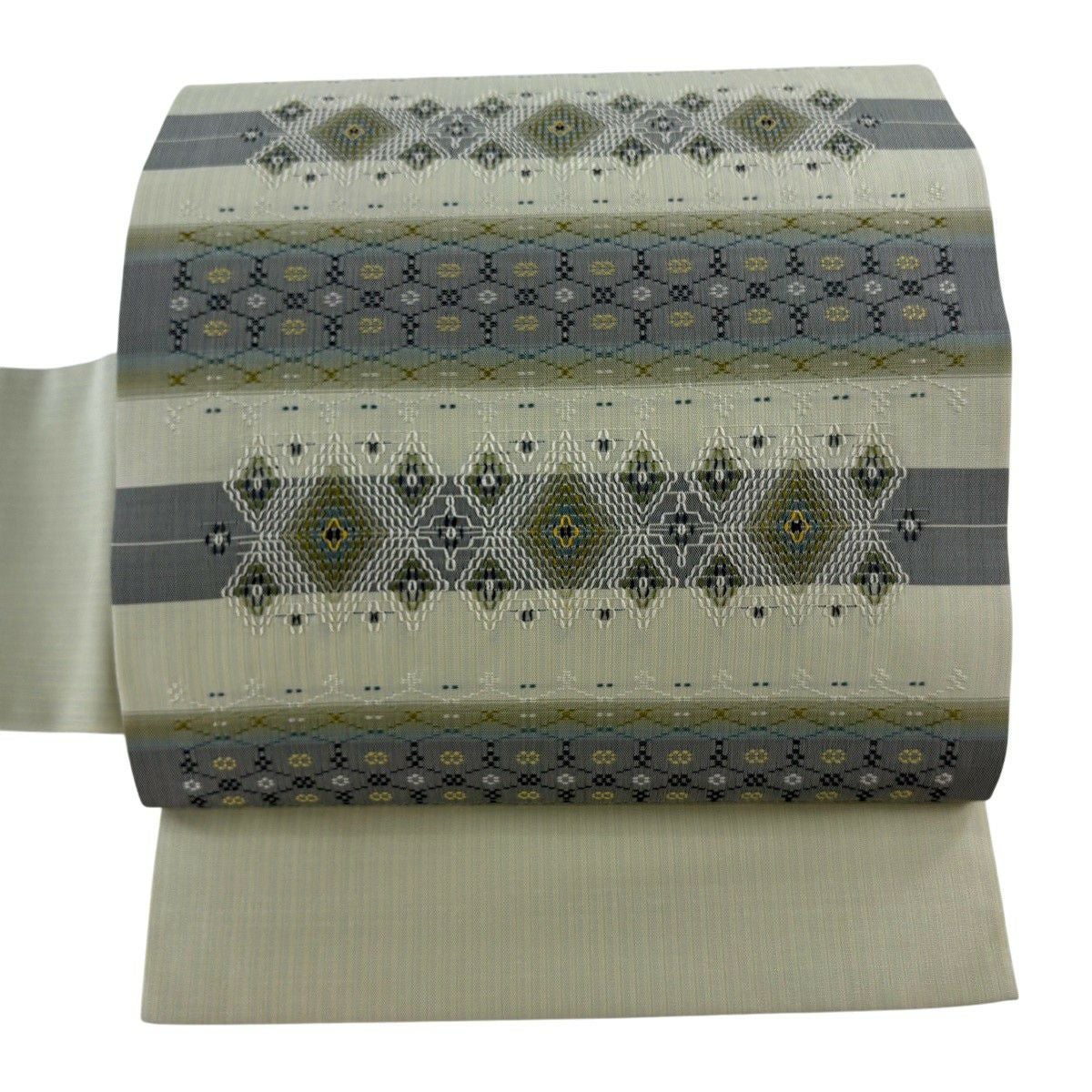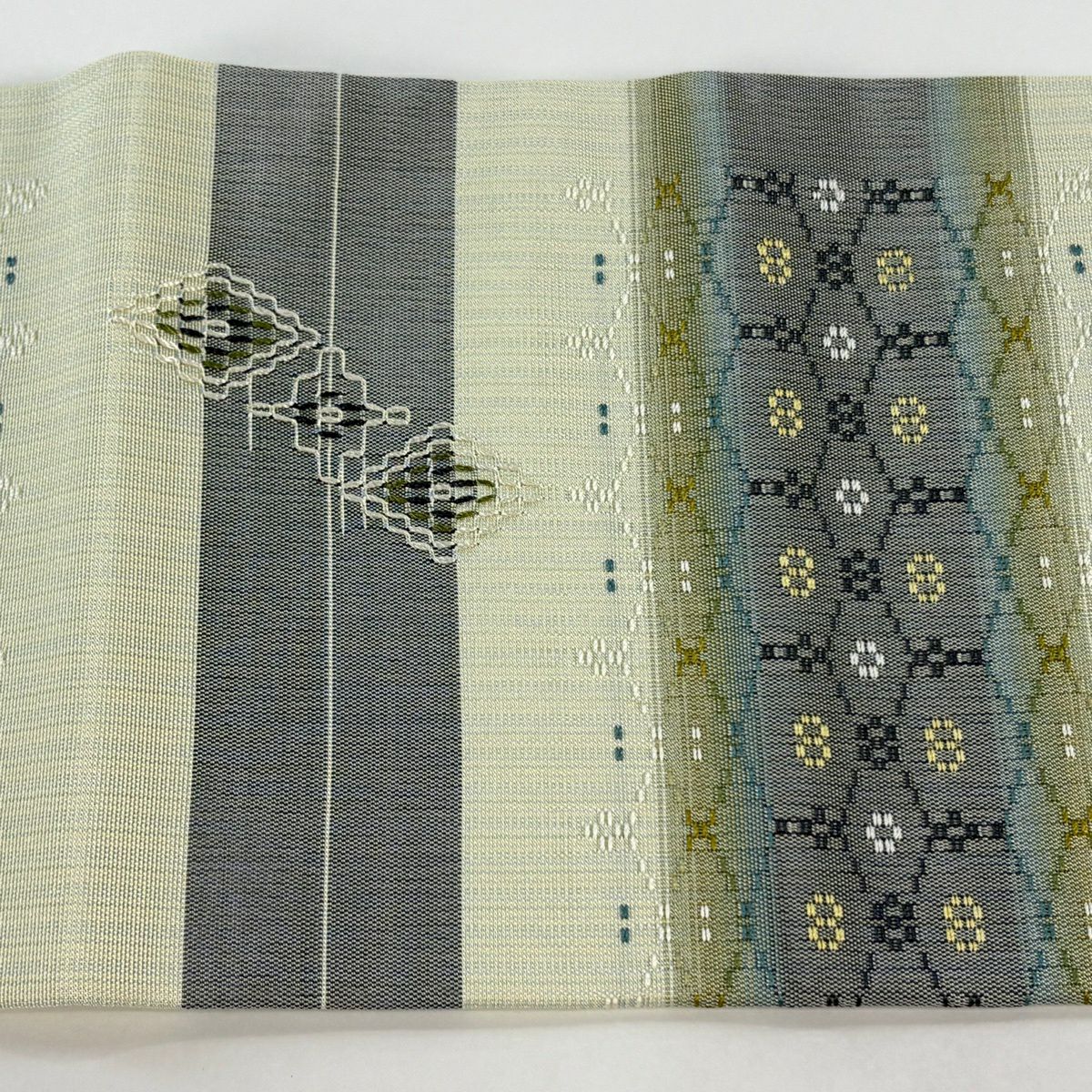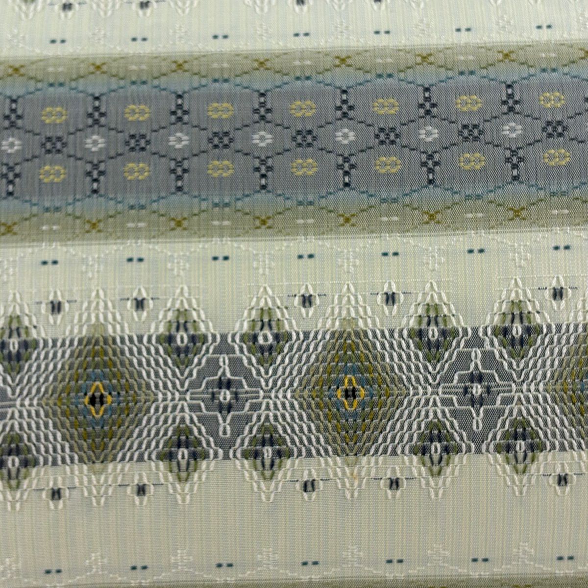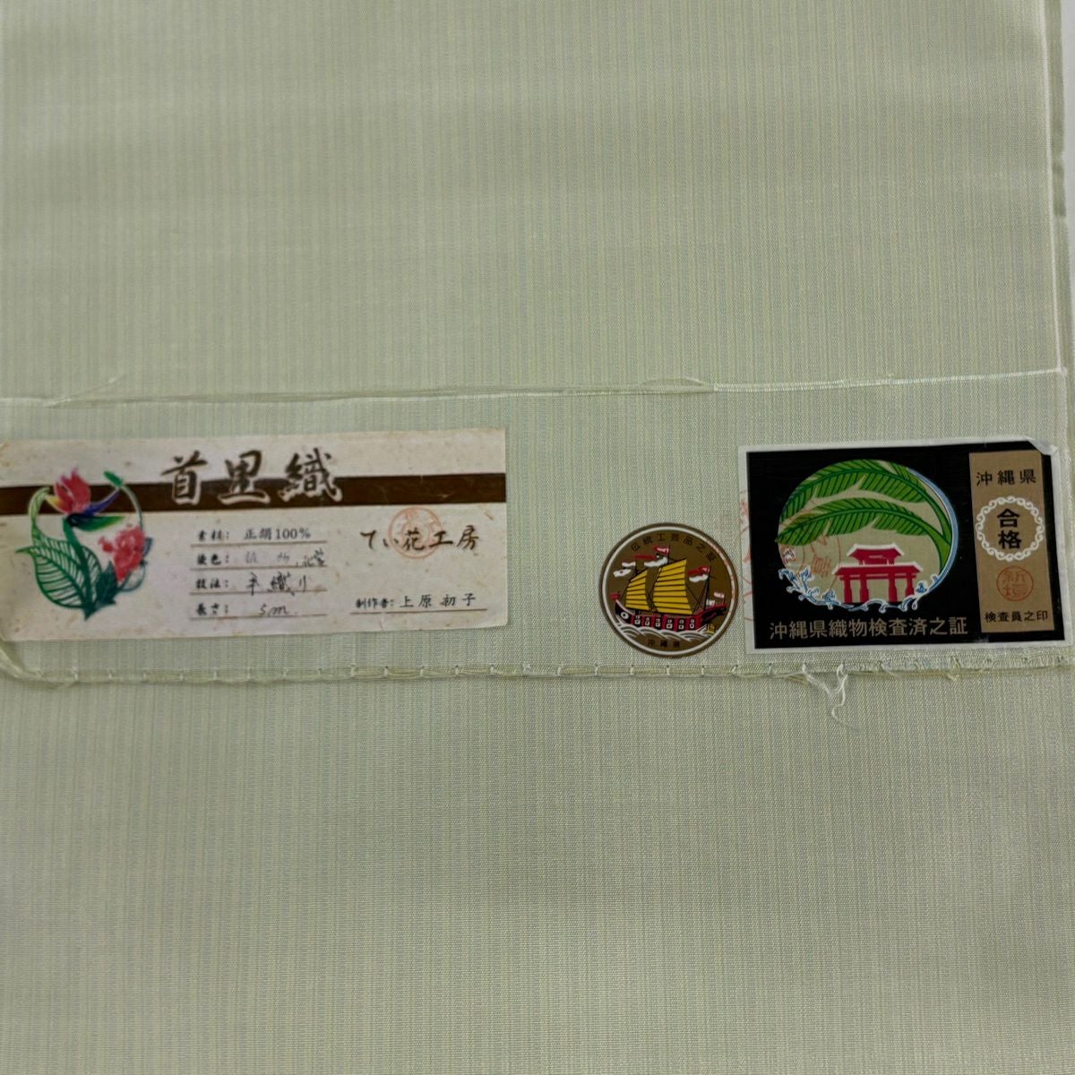 名古屋帯 逸品 証紙あり 首里織 上原初子 花織 菱 幾何学模様 黄緑色 正絹
