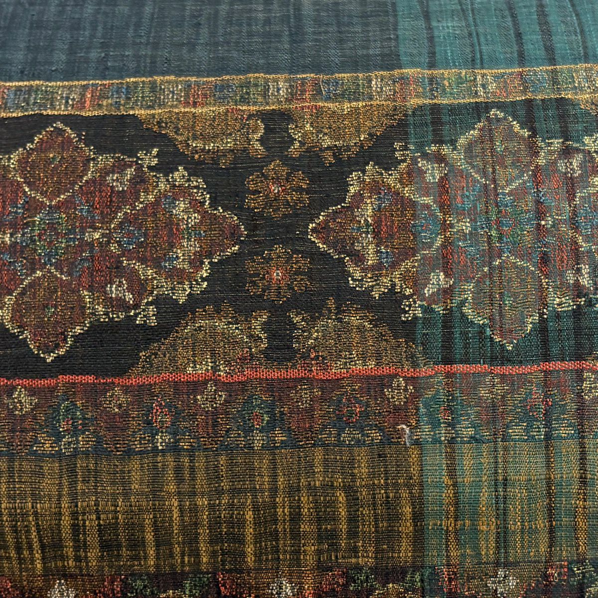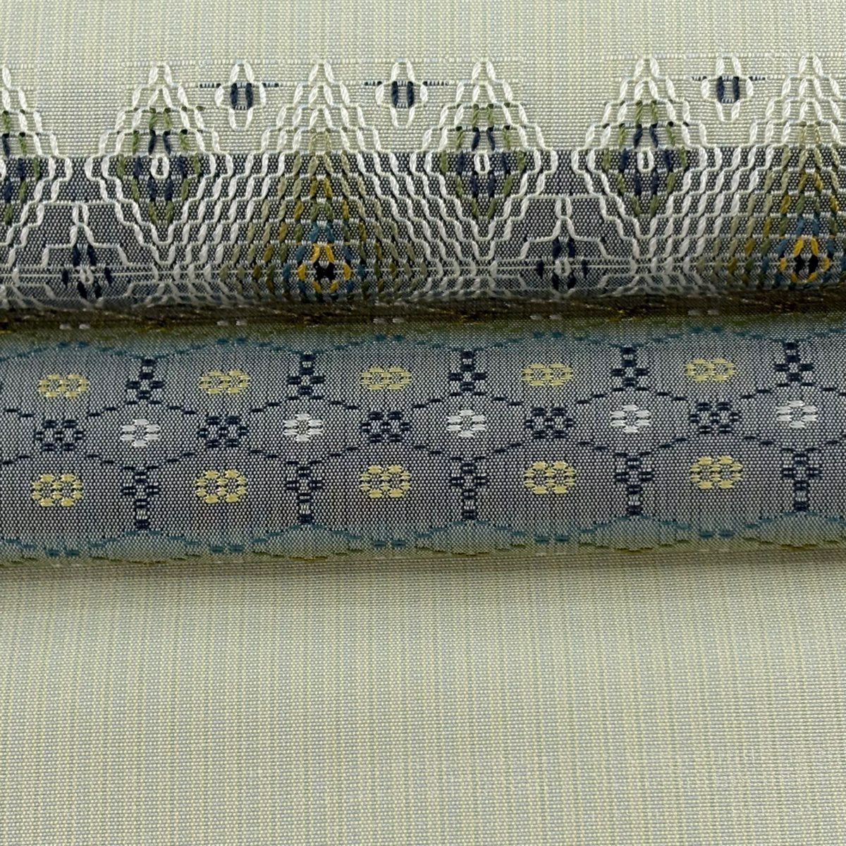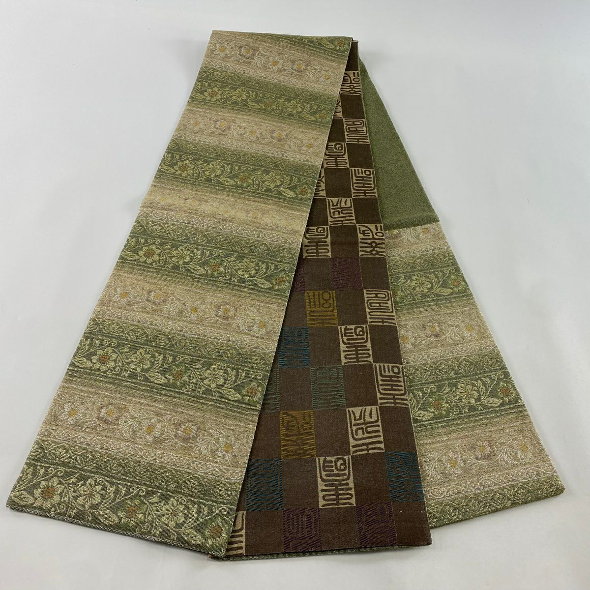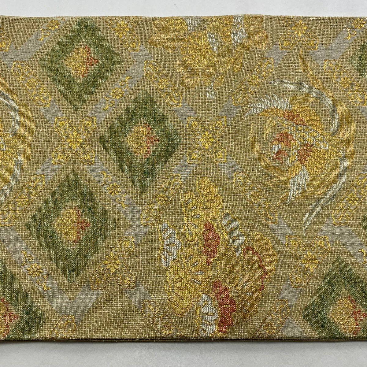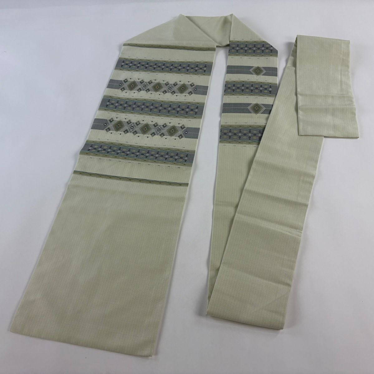 名古屋帯 逸品 証紙あり 首里織 上原初子 花織 菱 幾何学模様 黄緑色 正絹