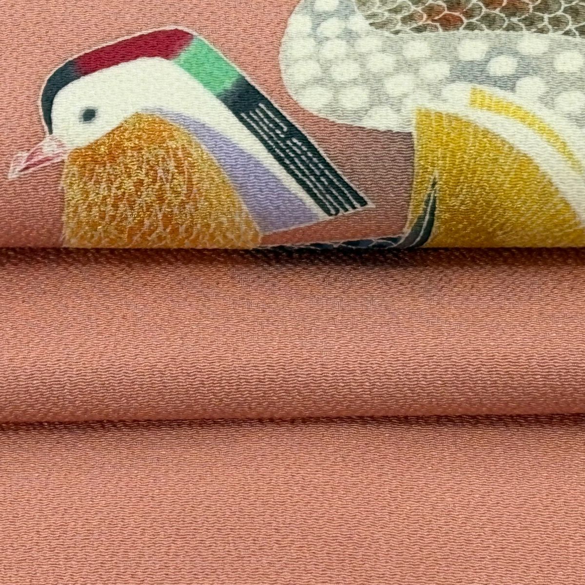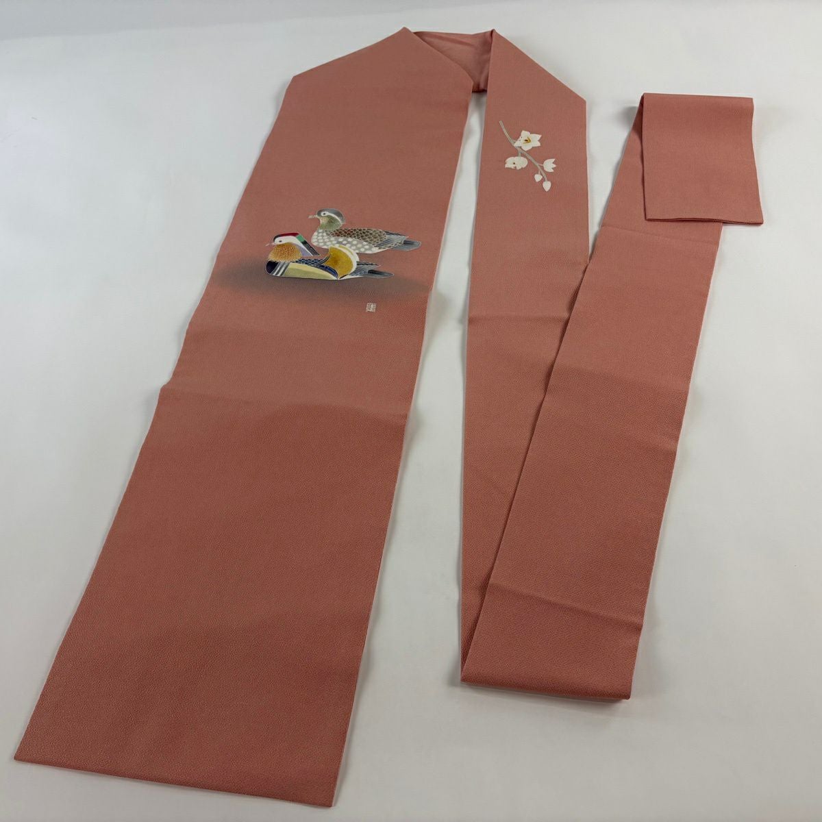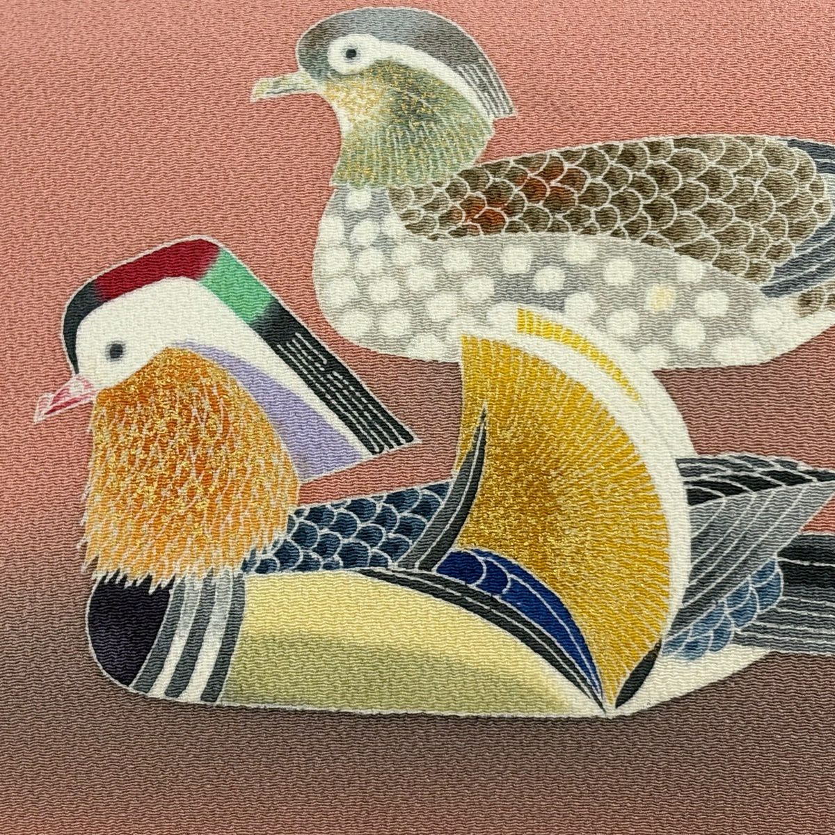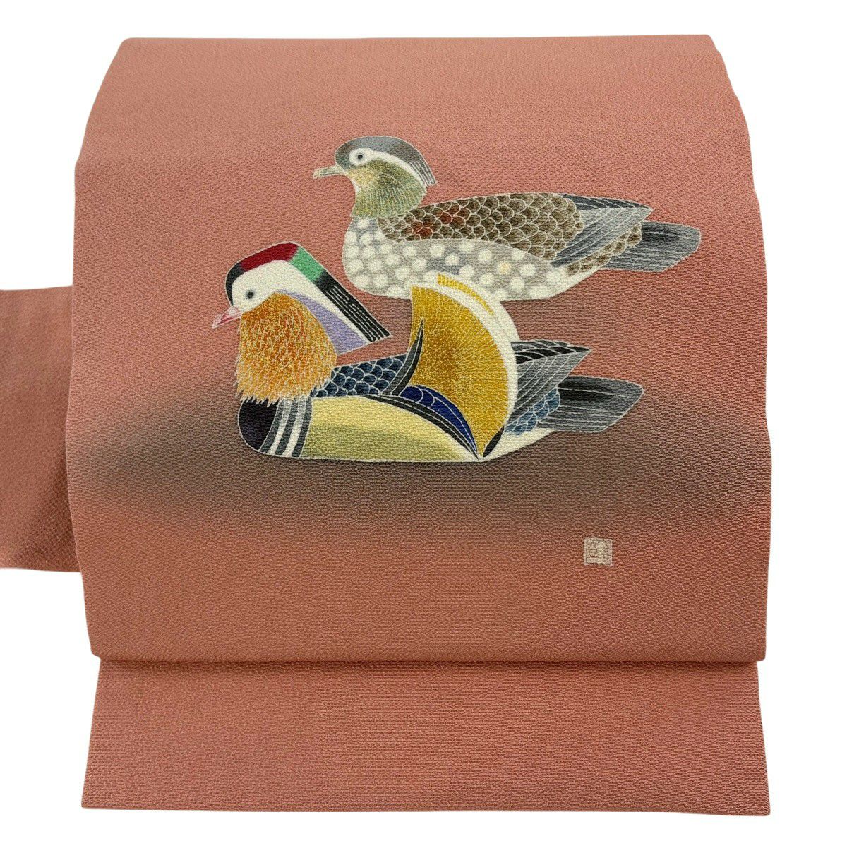 名古屋帯 逸品 羽田登喜 落款あり 鴛鴦 金彩 ぼかし サーモンピンク 正絹