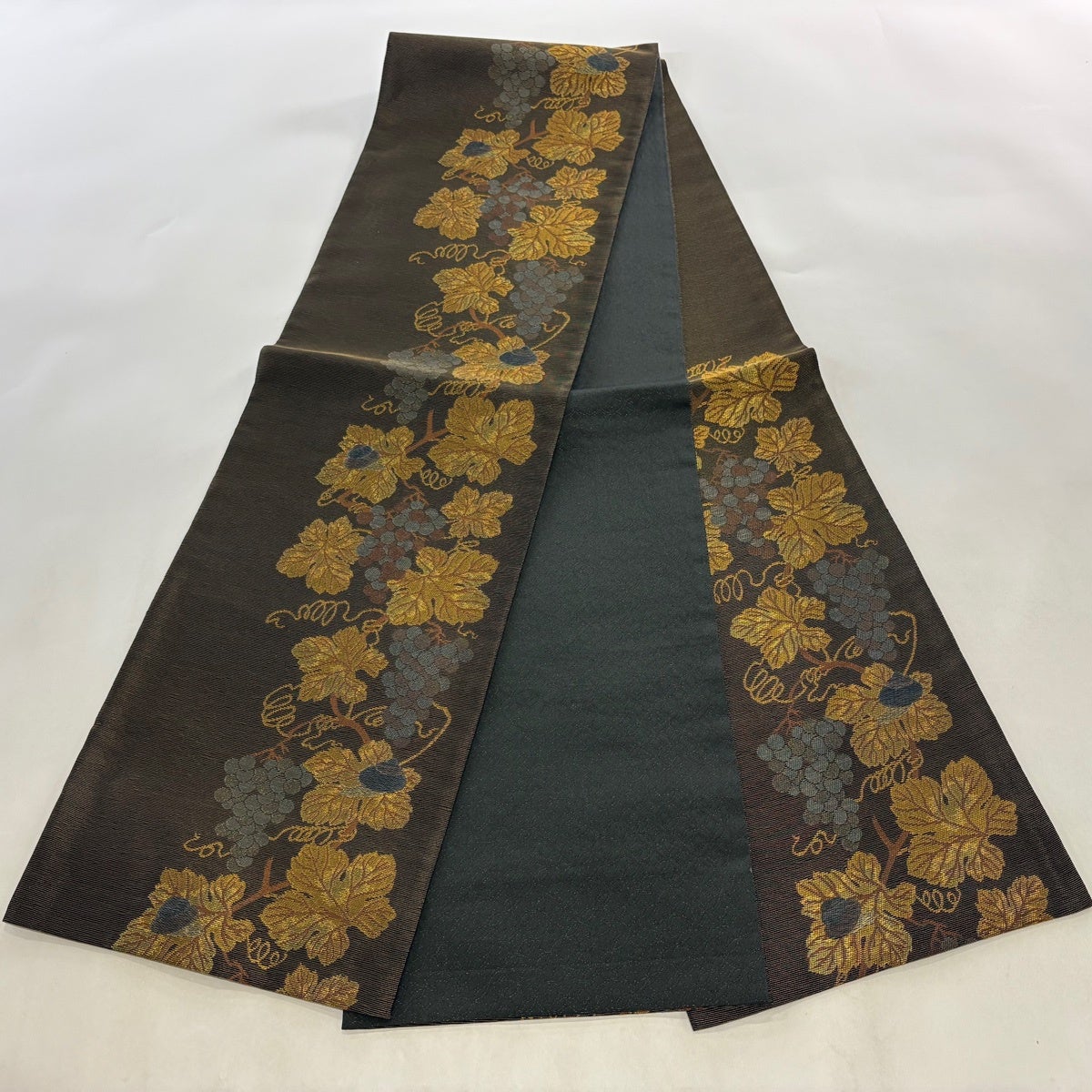 【美品】 袋帯 逸品 白綾苑大庭 落款あり 花唐草 金糸 黄土色 六通 正絹
