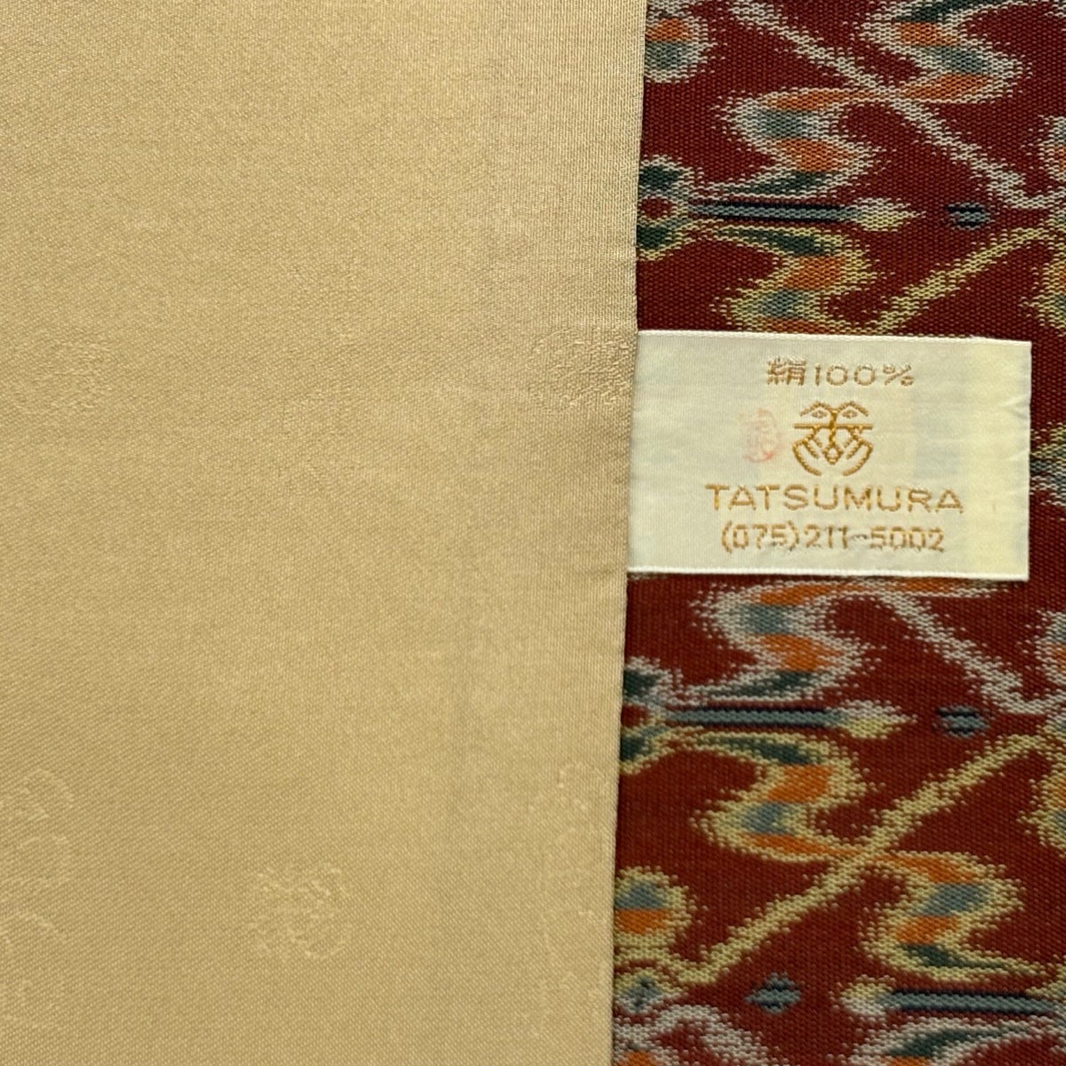 【美品】 袋帯 逸品 白綾苑大庭 落款あり 桐 七宝文 箔 茜色 六通 正絹