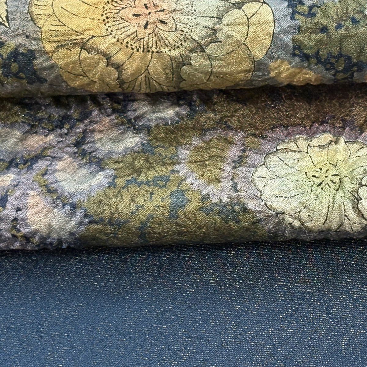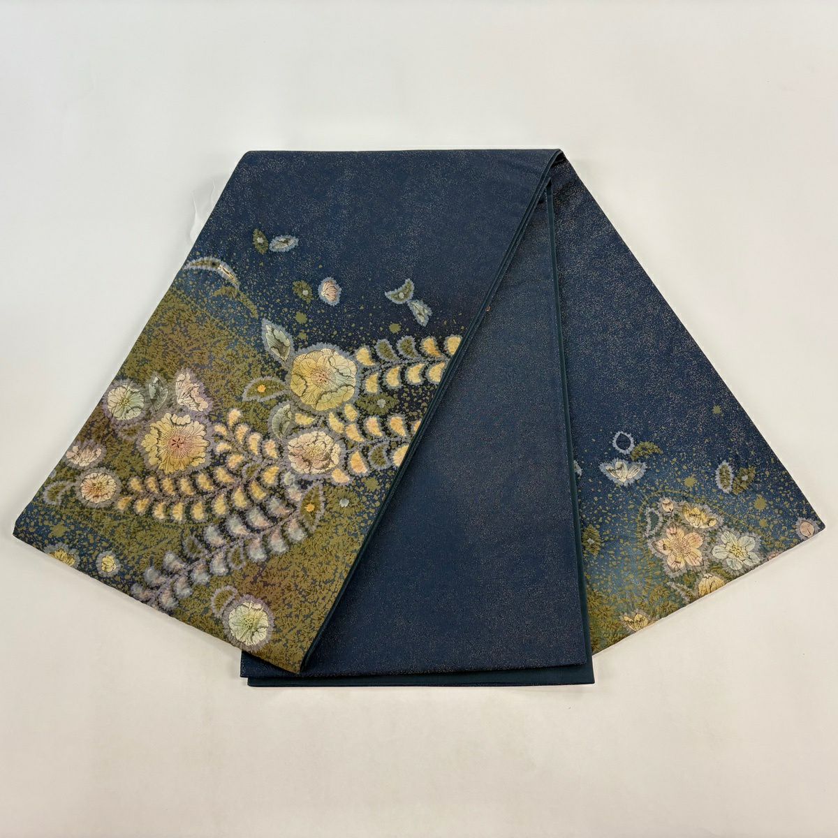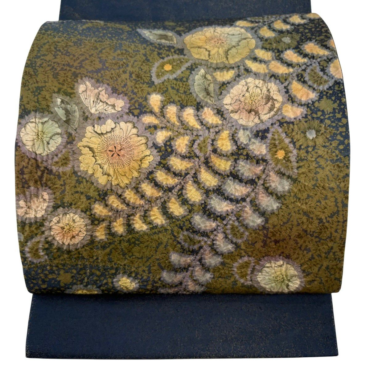 【美品】 袋帯 逸品 吉乃一廉 落款あり 辻が花 銀通し 紺色 お太鼓柄 正絹