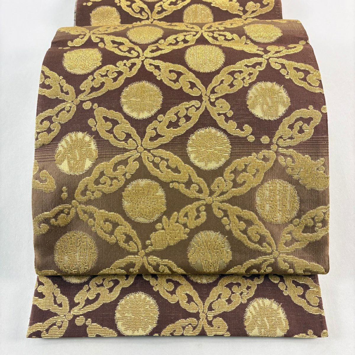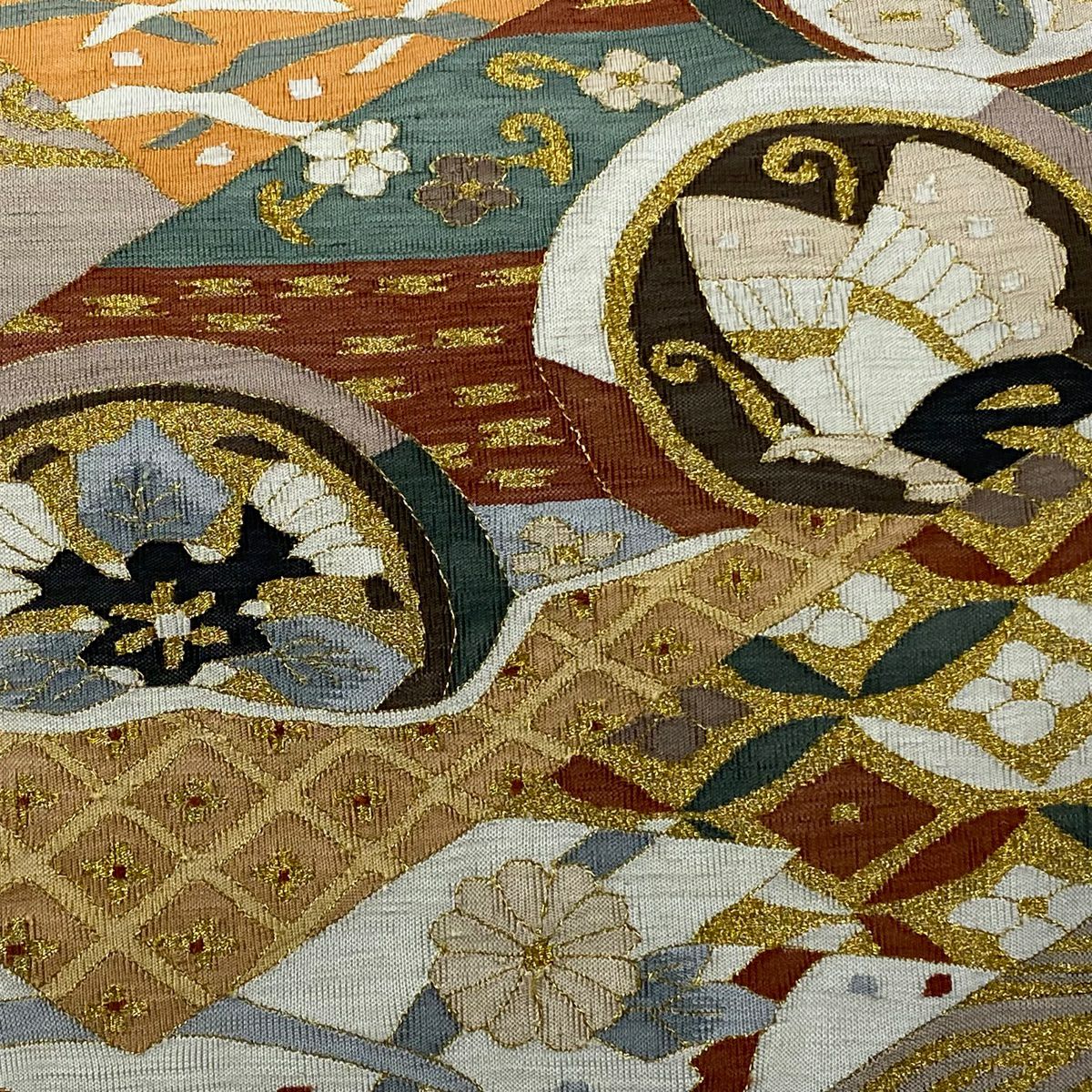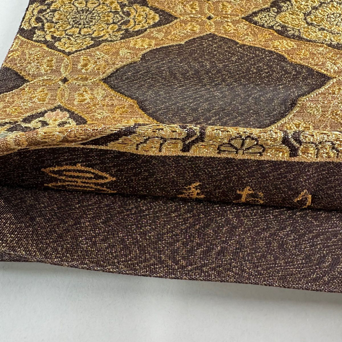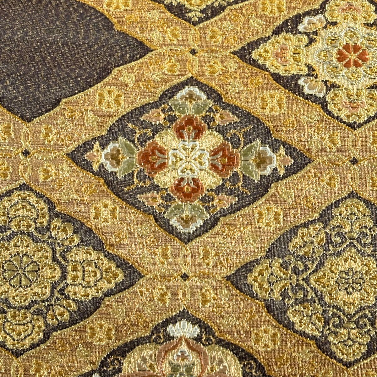 【美品】 袋帯 逸品 渡文 落款あり 花菱 横段 金糸 焦茶色 お太鼓柄 正絹