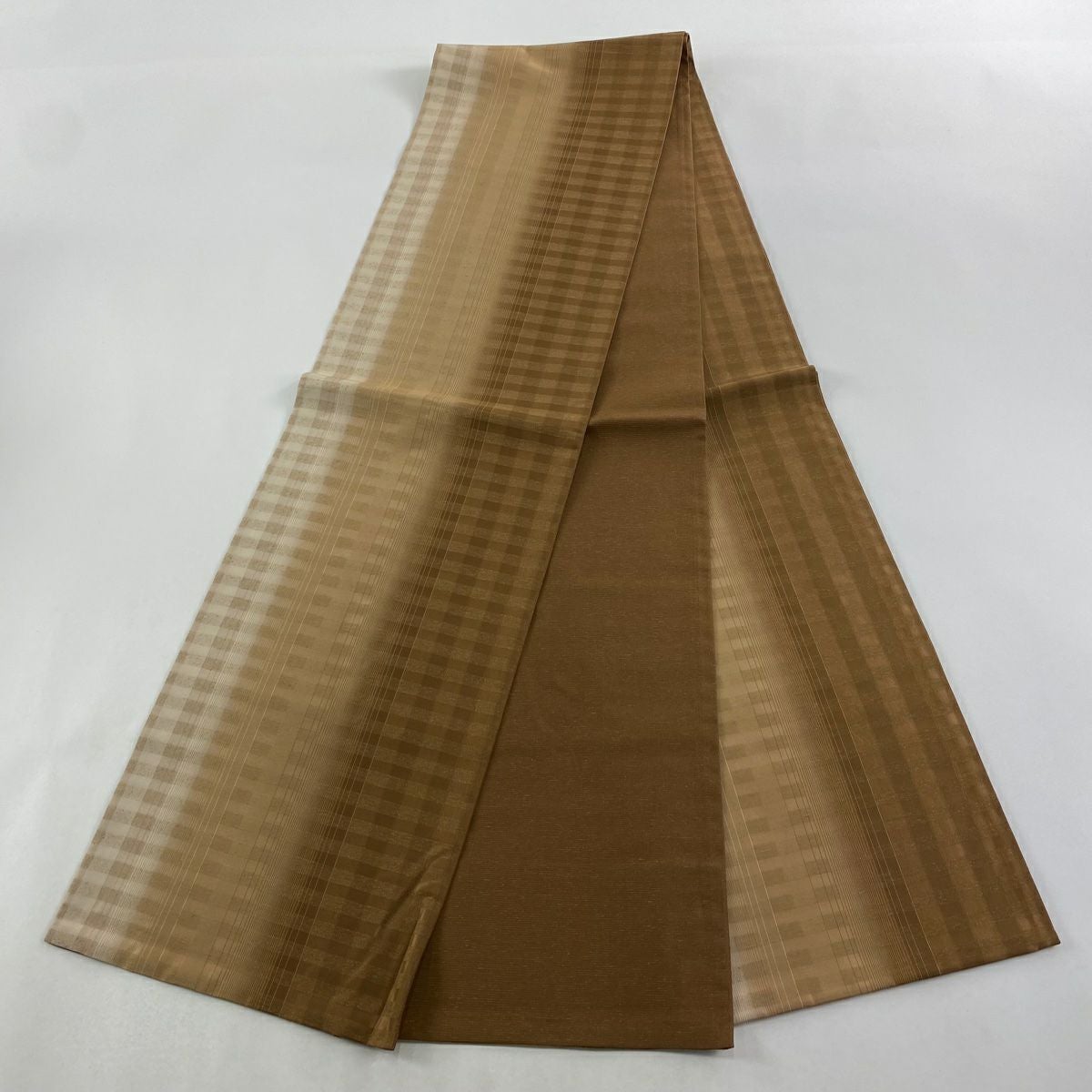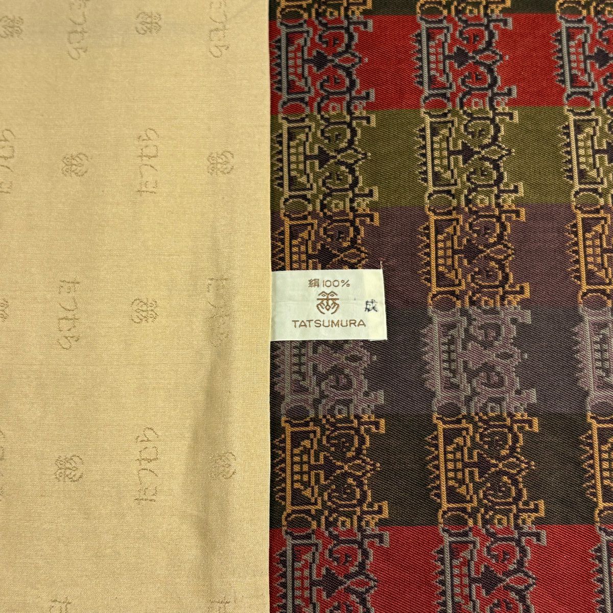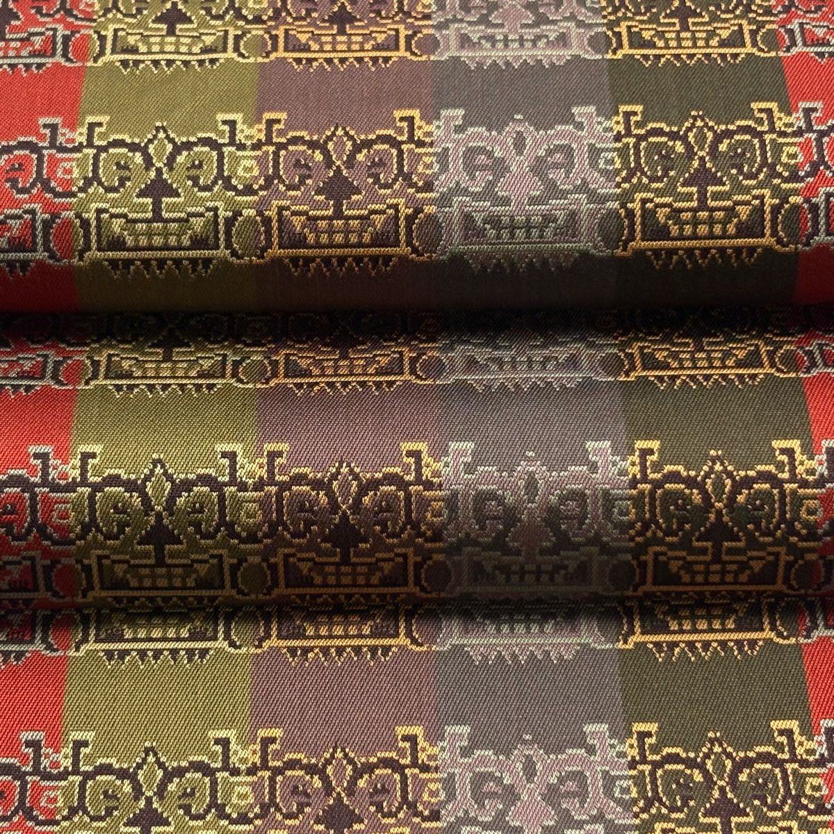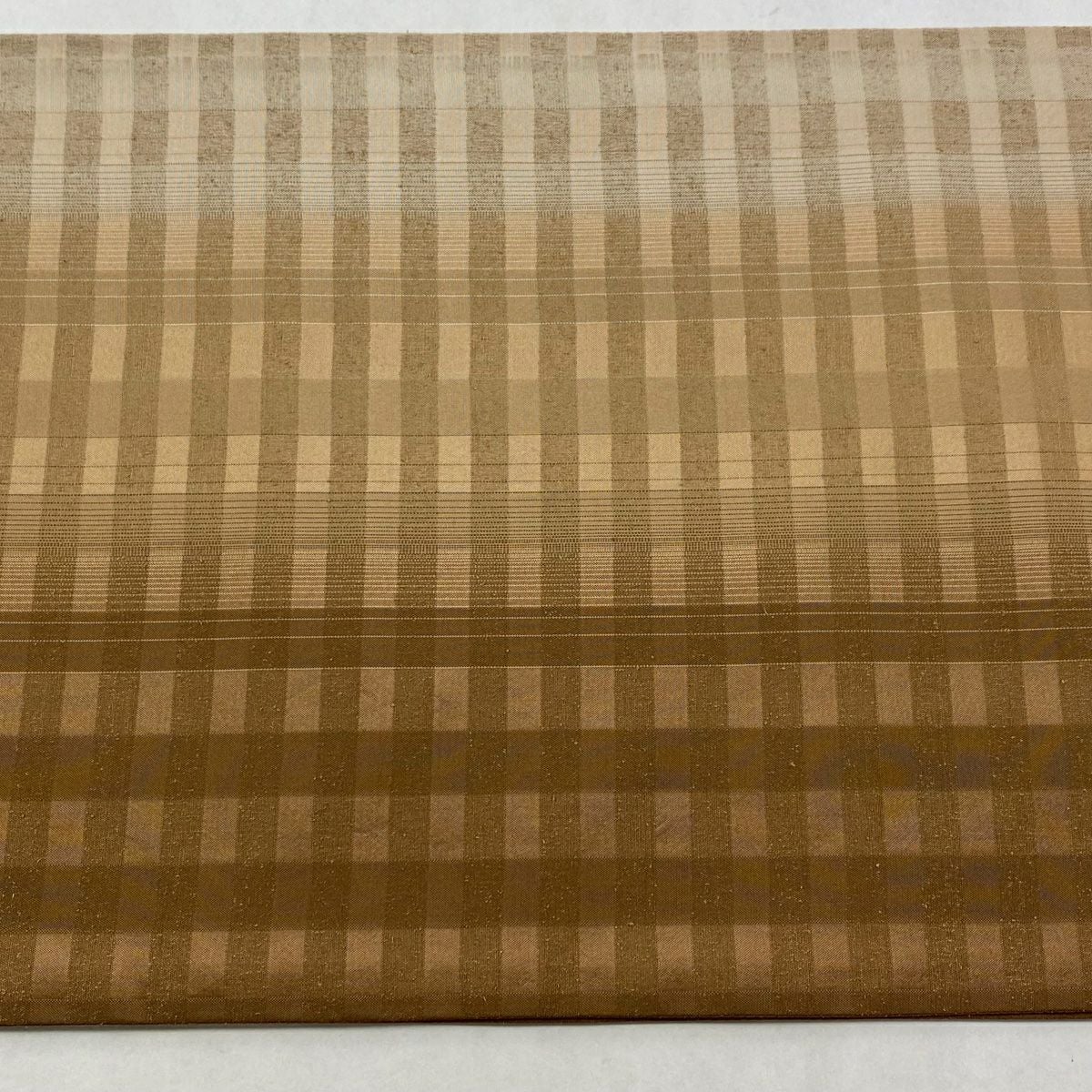 【在庫一掃】 袋帯 逸品 証紙あり 紬地 雪の中のきれ 格子 茶色 全通 正絹