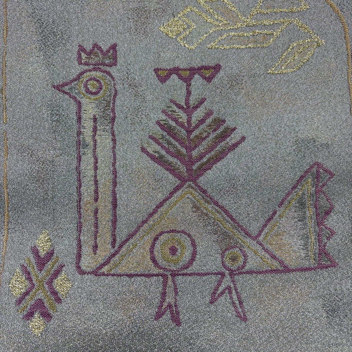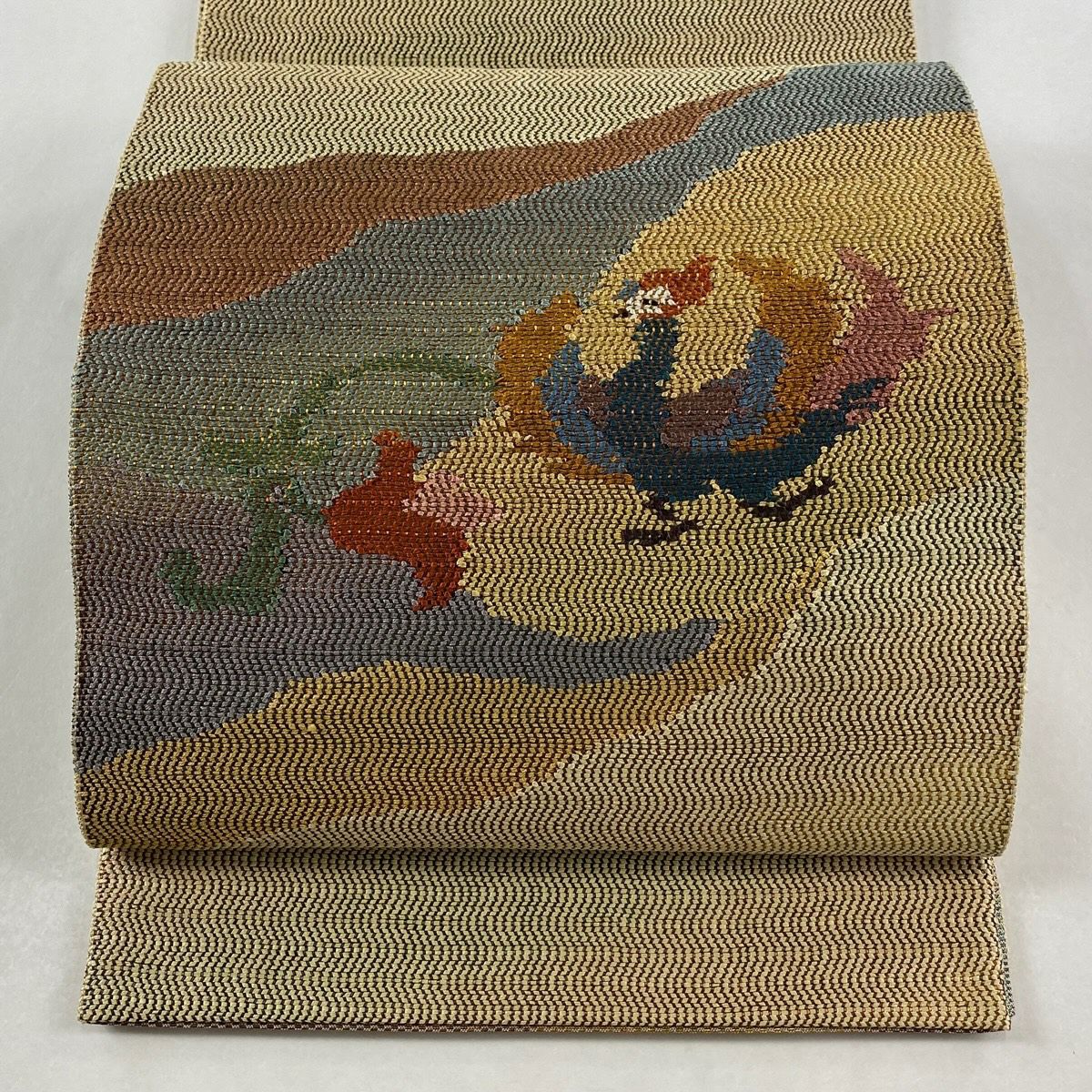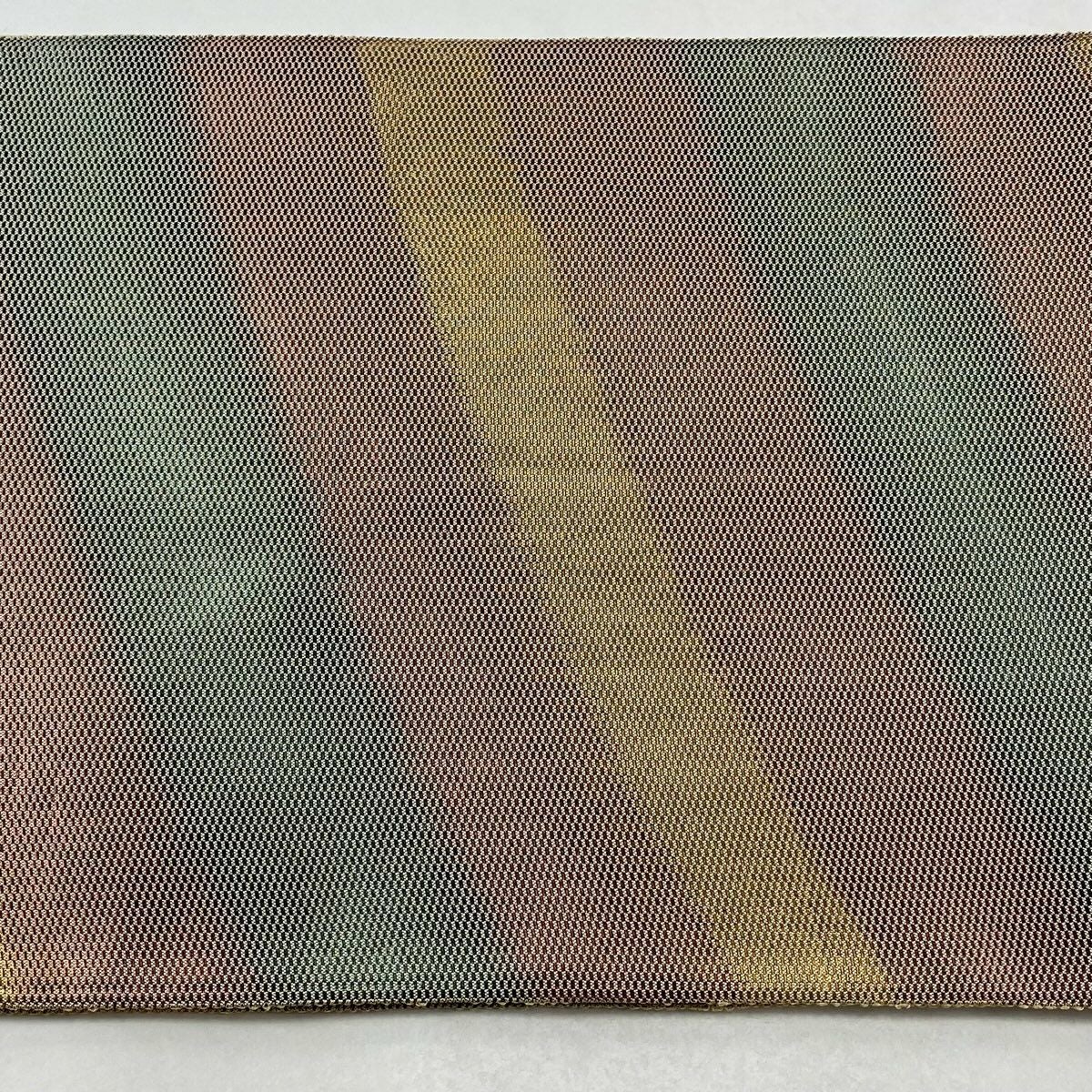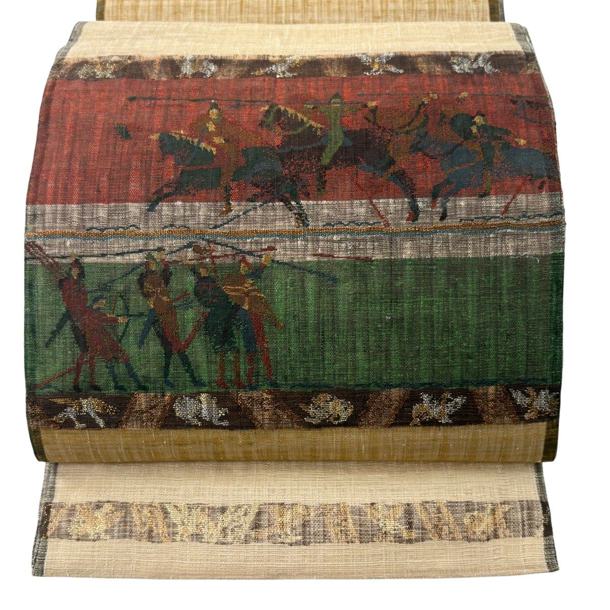 【美品】 袋帯 逸品 渡文 落款あり 騎馬 横段 金銀糸 薄茶色 お太鼓柄 正絹