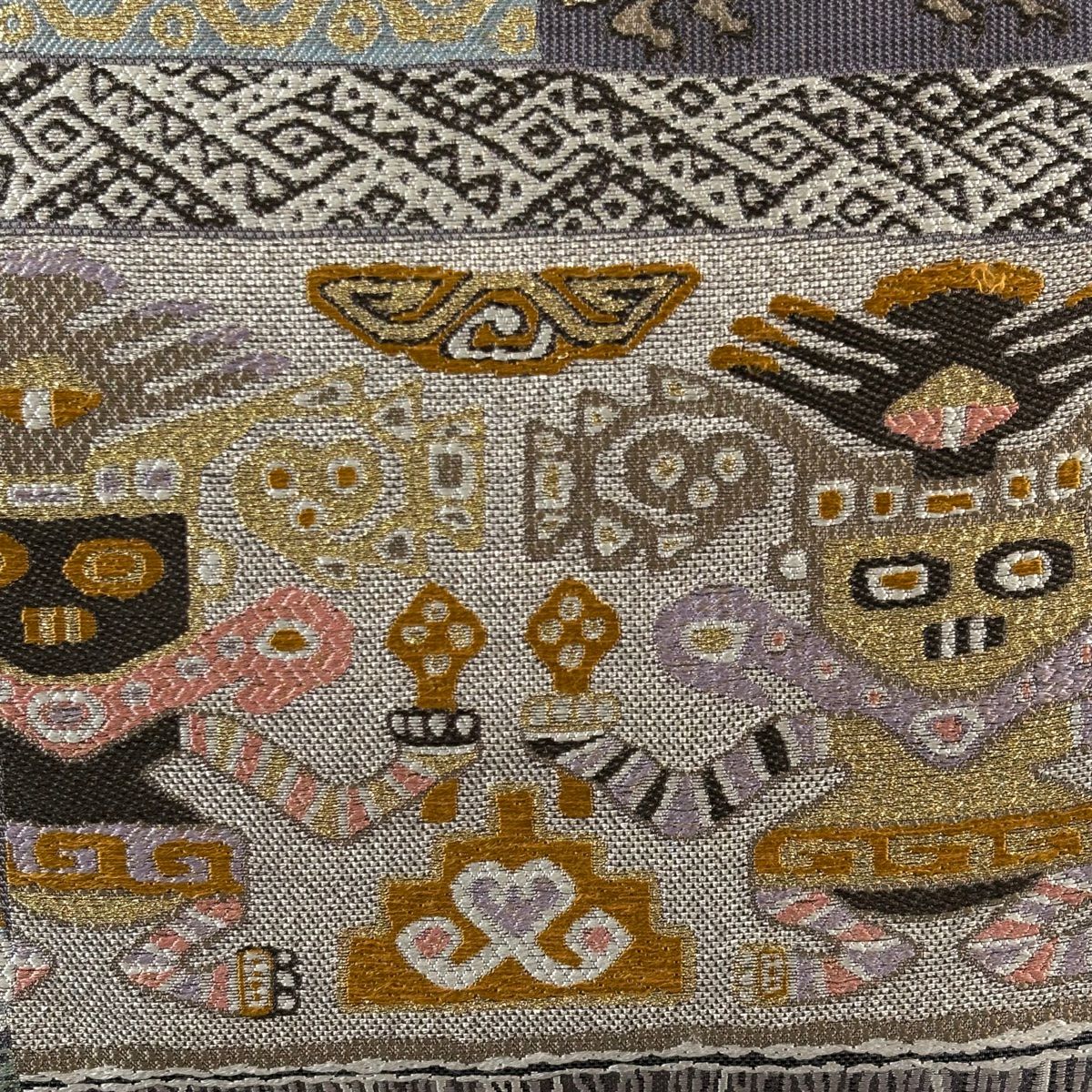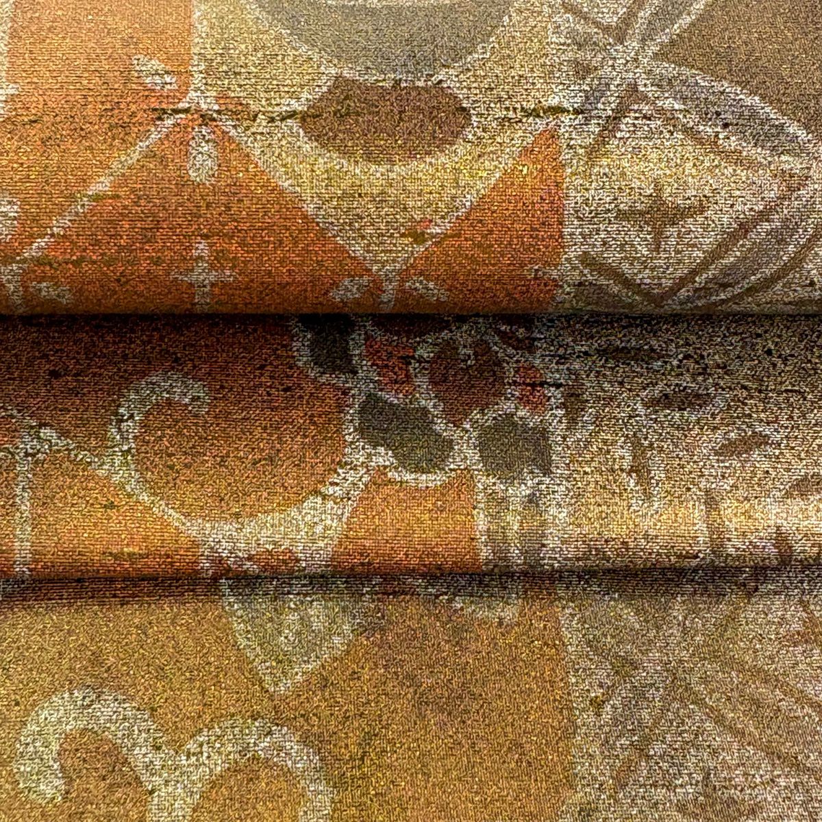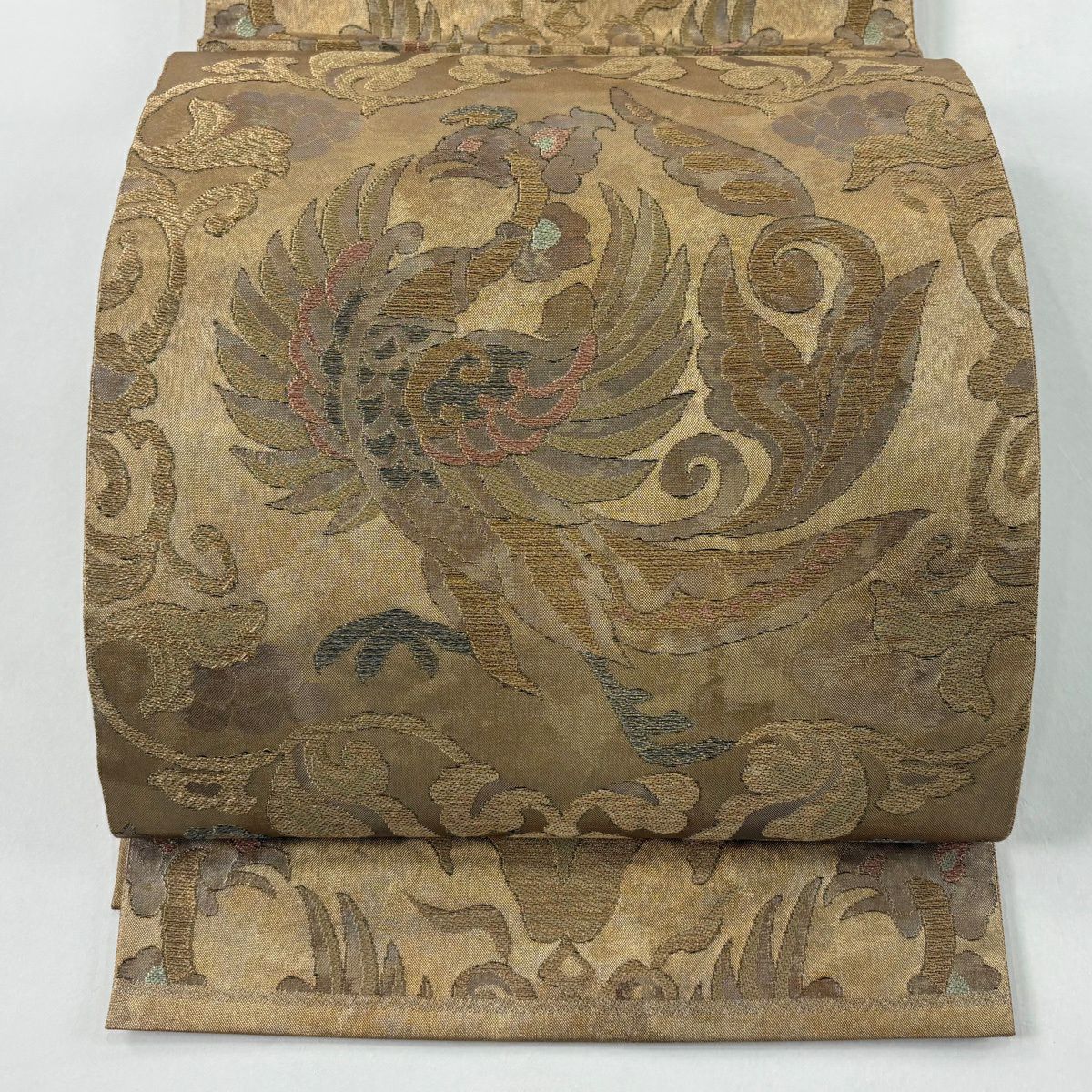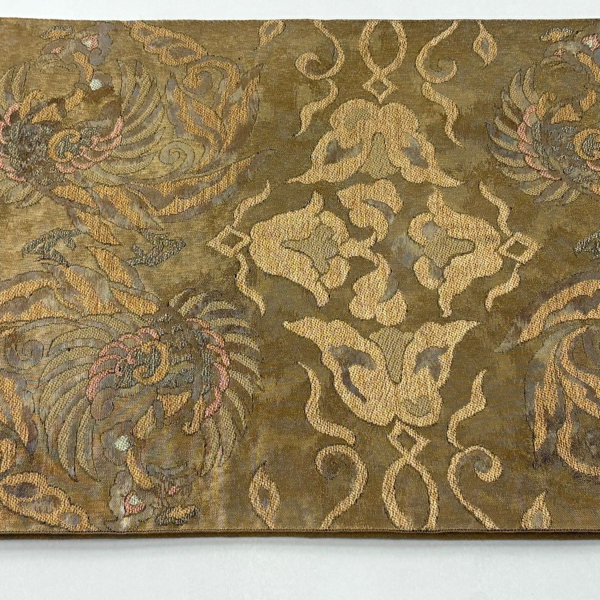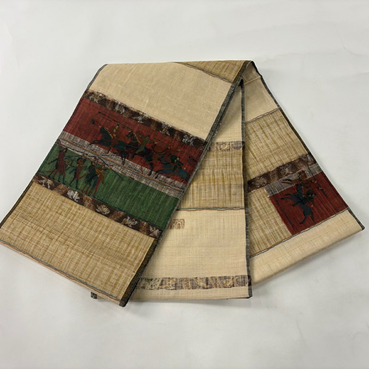 【美品】 袋帯 逸品 渡文 落款あり 騎馬 横段 金銀糸 薄茶色 お太鼓柄 正絹