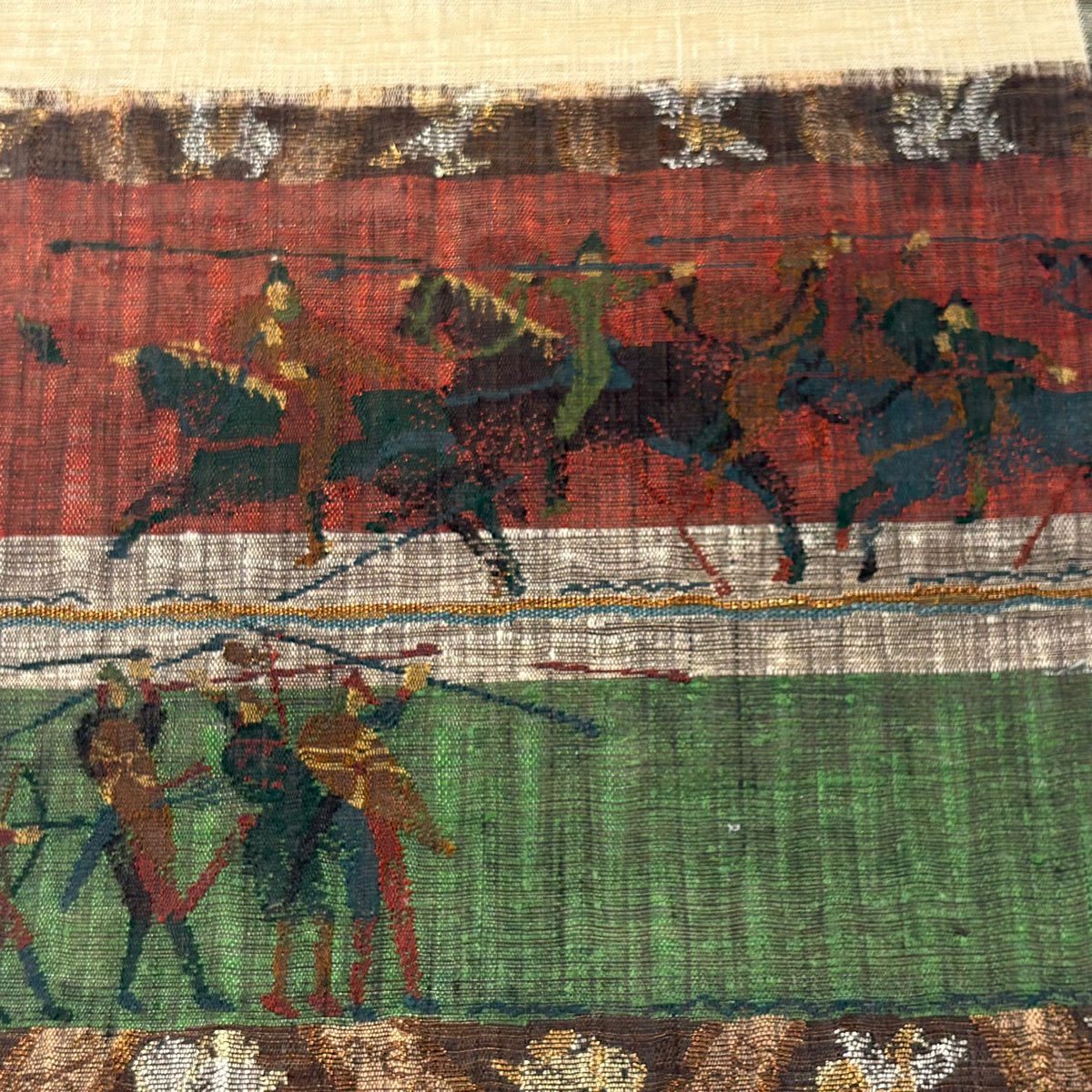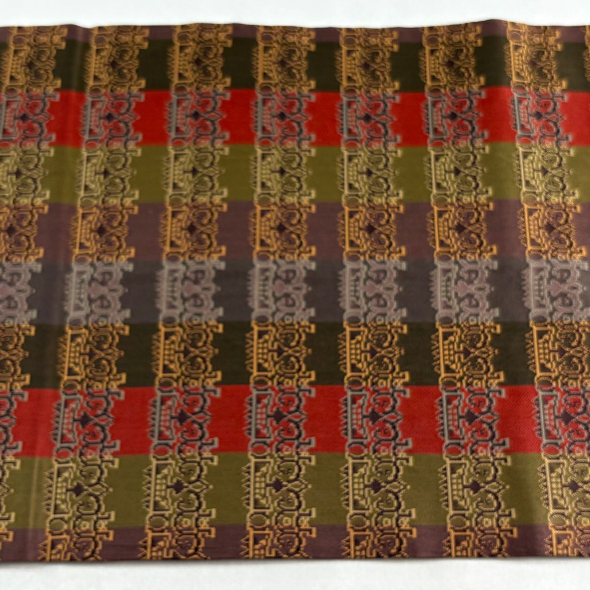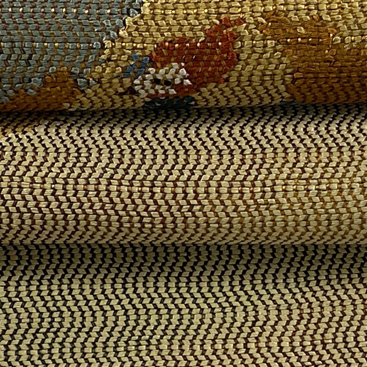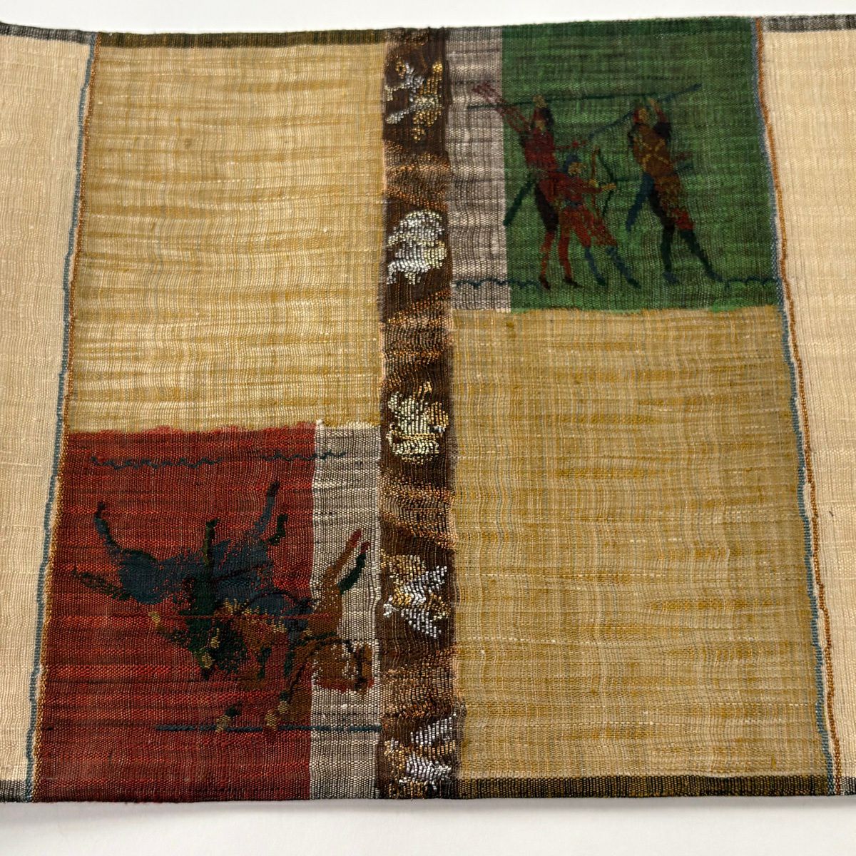 【美品】 袋帯 逸品 渡文 落款あり 騎馬 横段 金銀糸 薄茶色 お太鼓柄 正絹