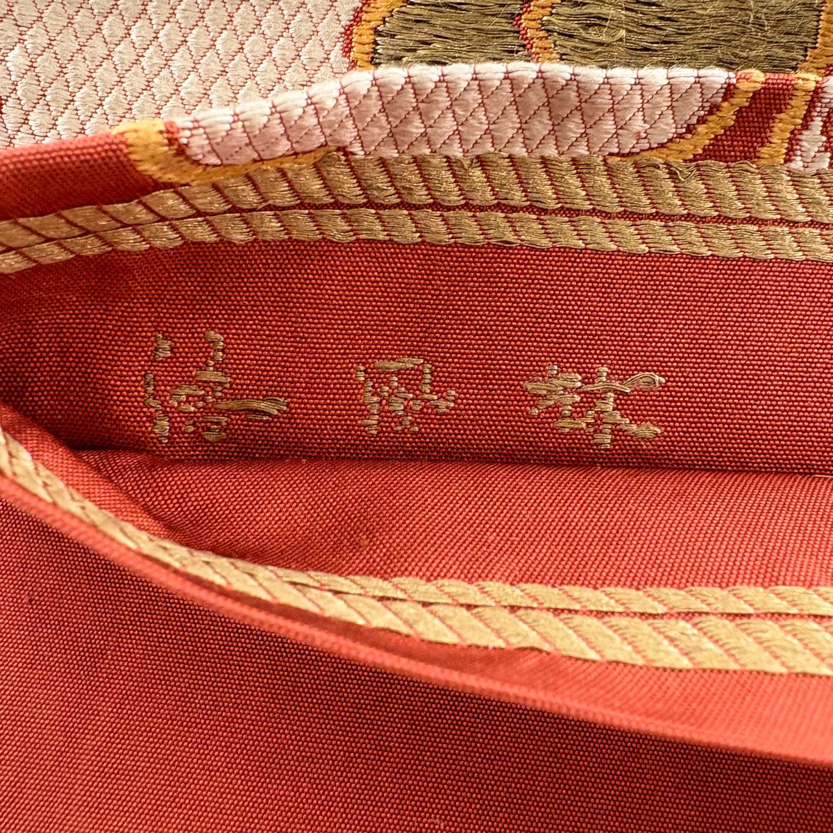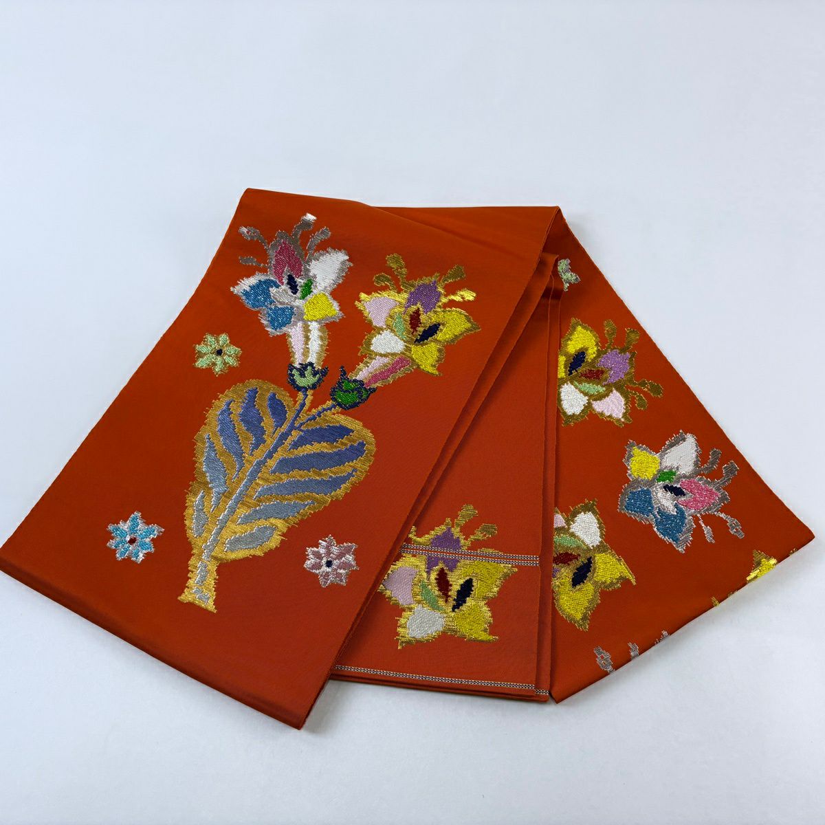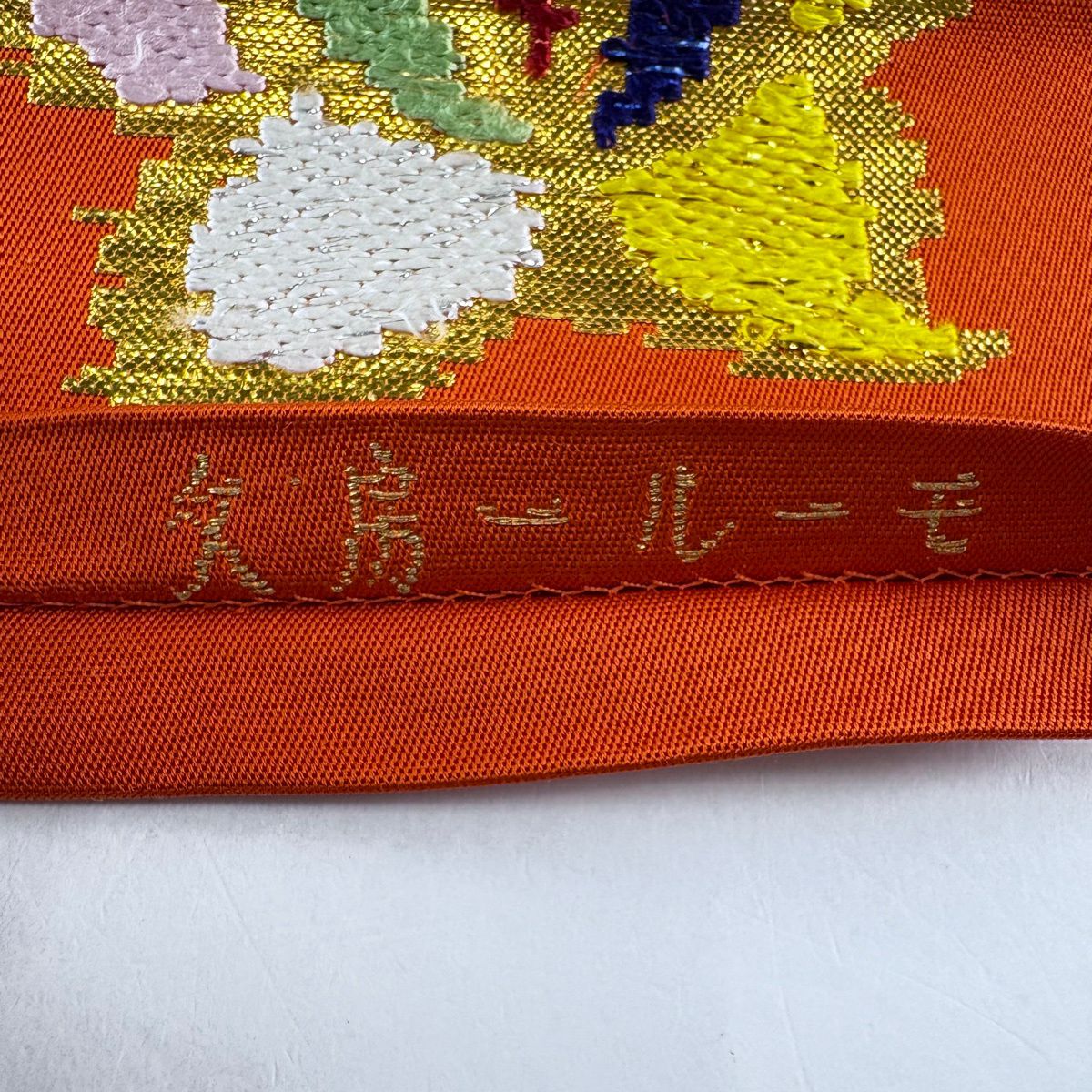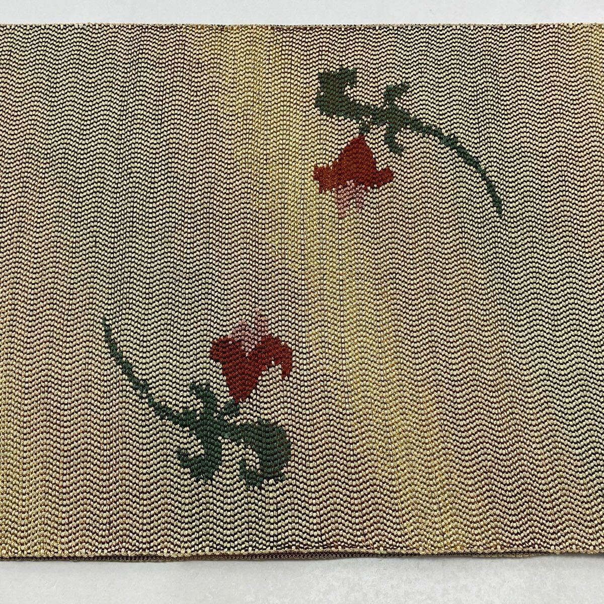 【在庫一掃】 袋帯 逸品 洛風林 落款あり 草花 金糸 刺繍 朱色 全通 正絹