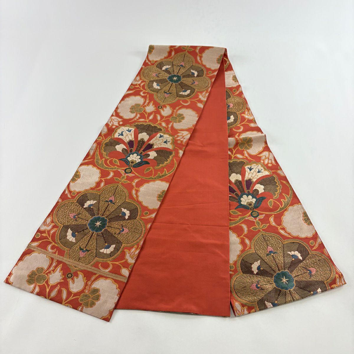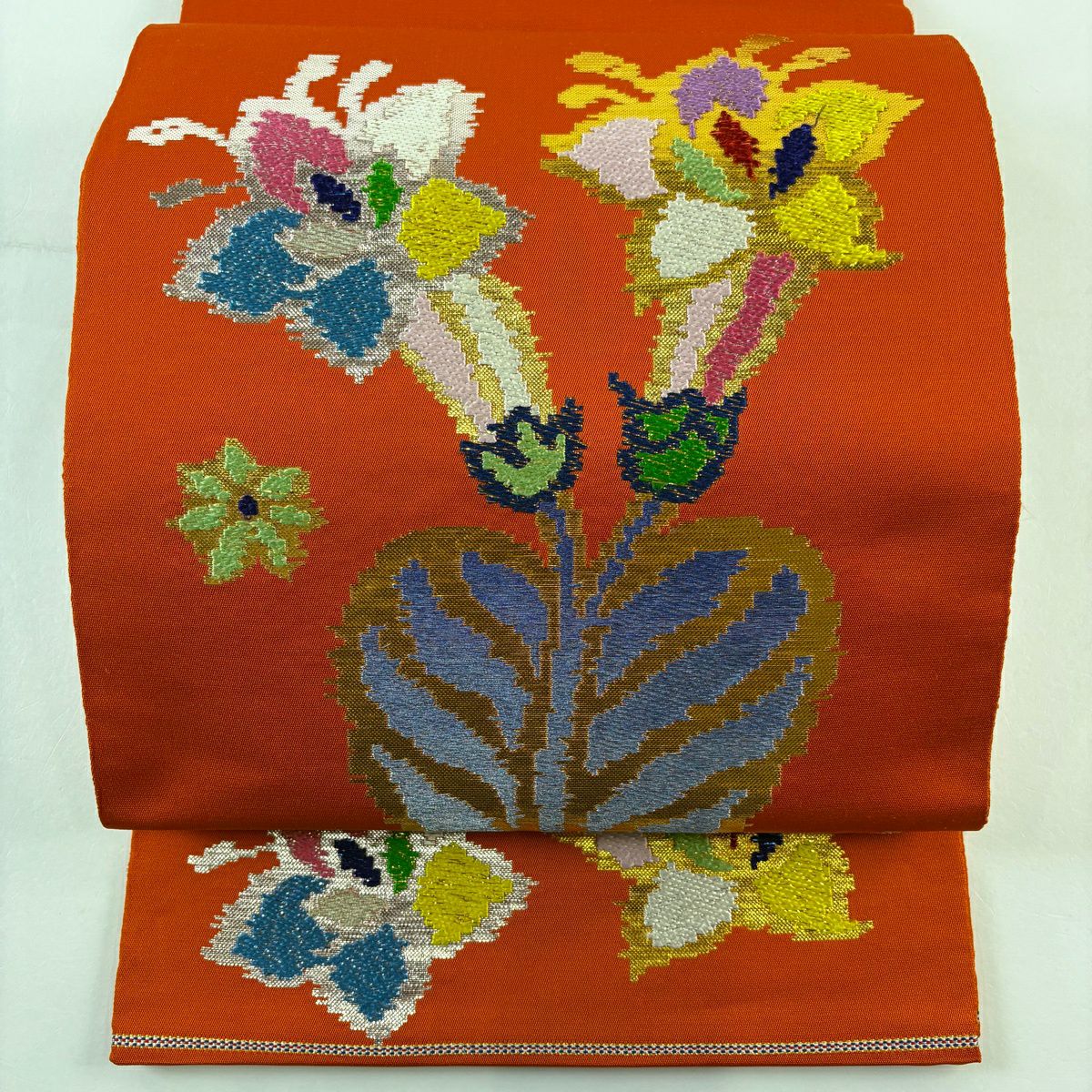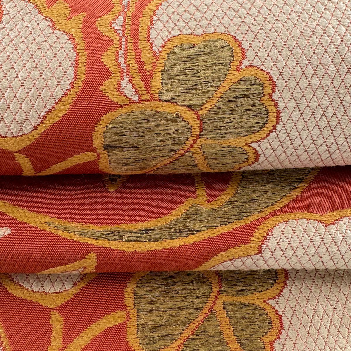 【在庫一掃】 袋帯 逸品 洛風林 落款あり 草花 金糸 刺繍 朱色 全通 正絹