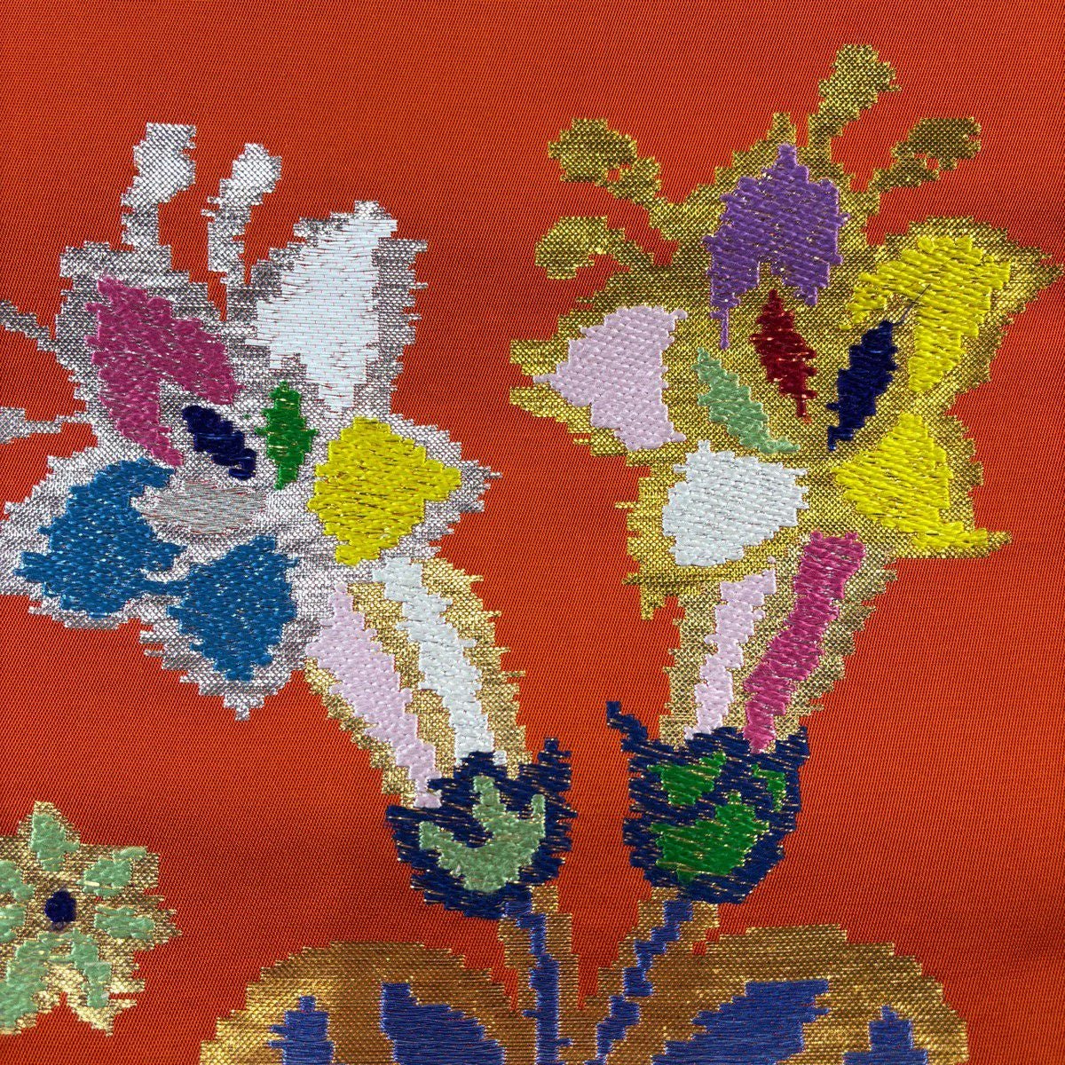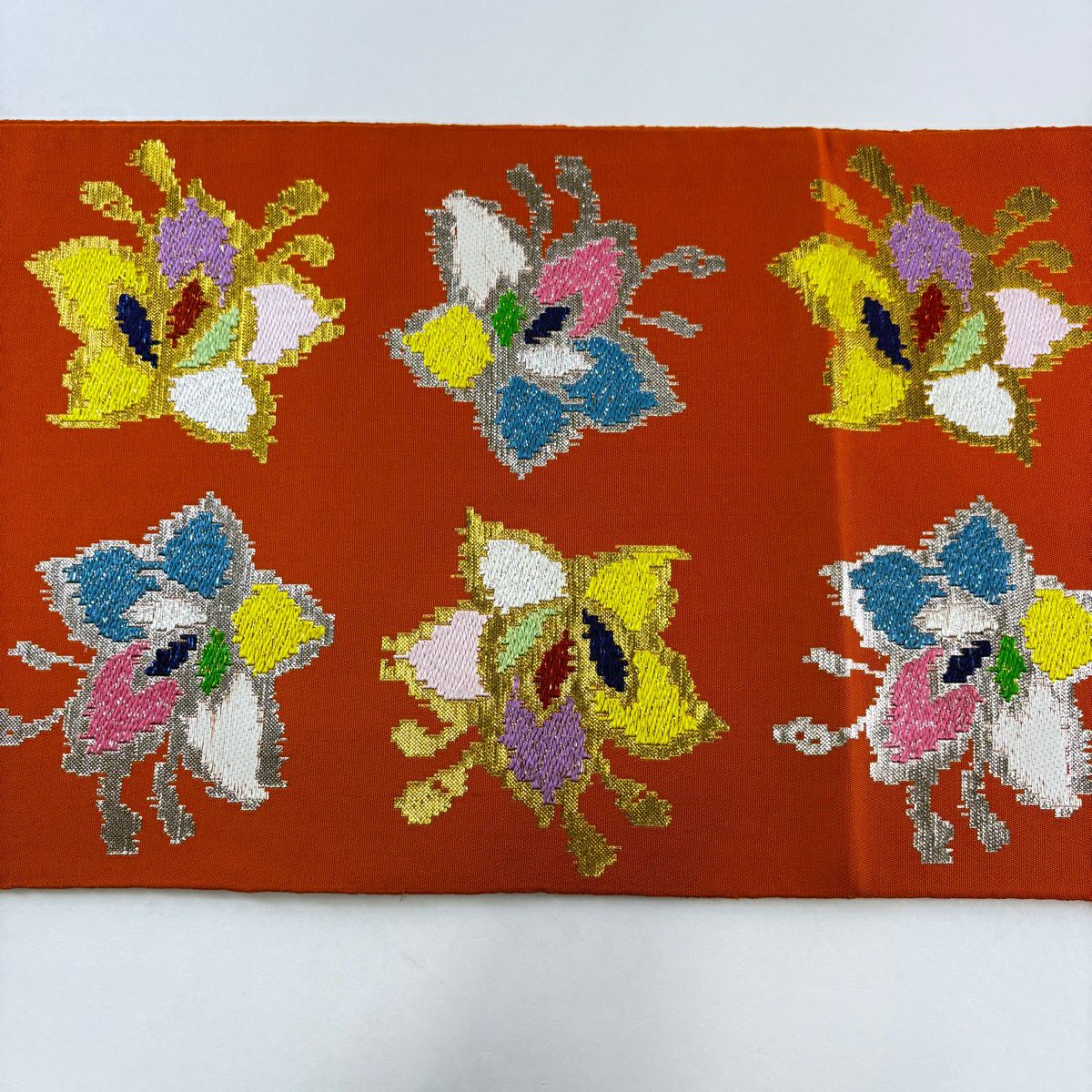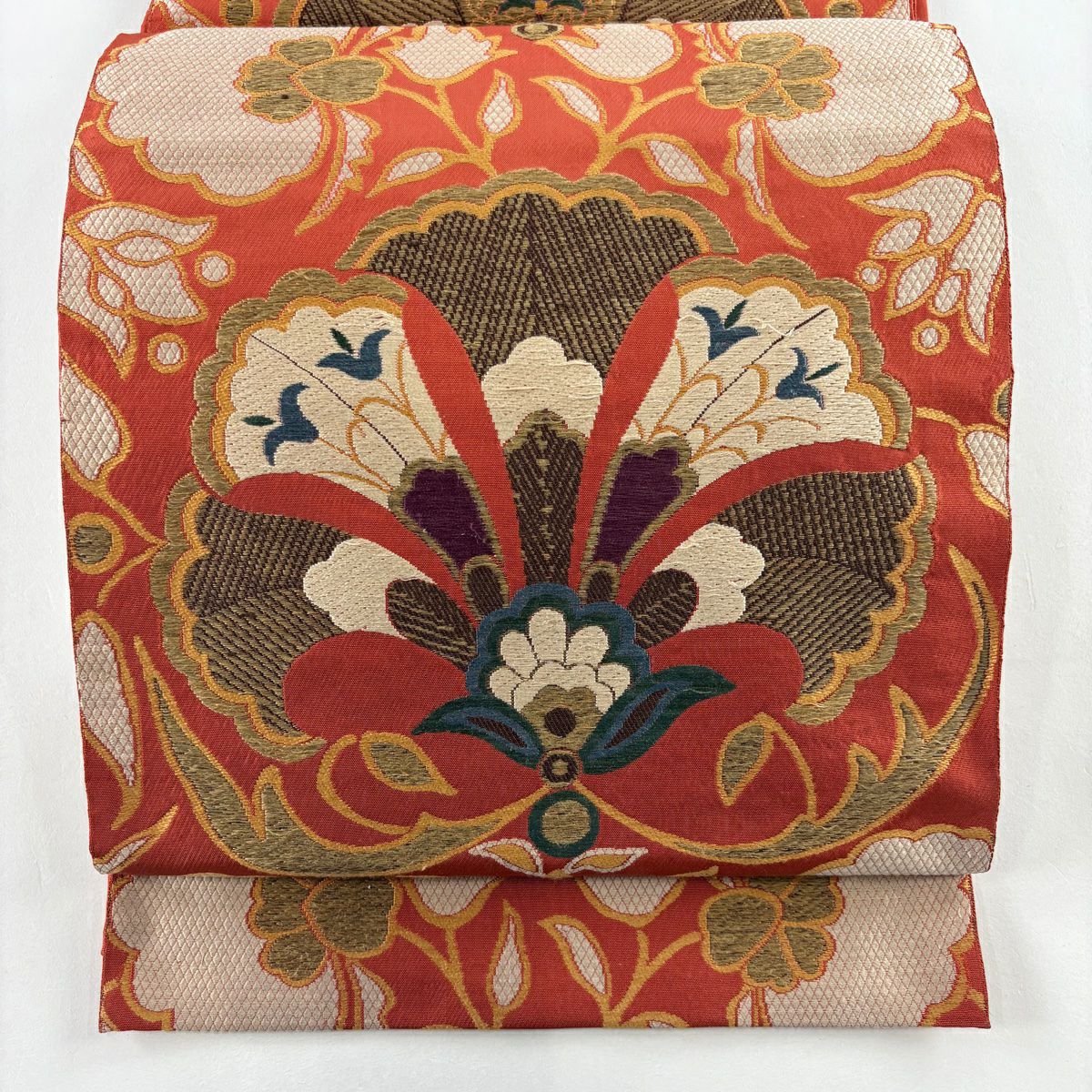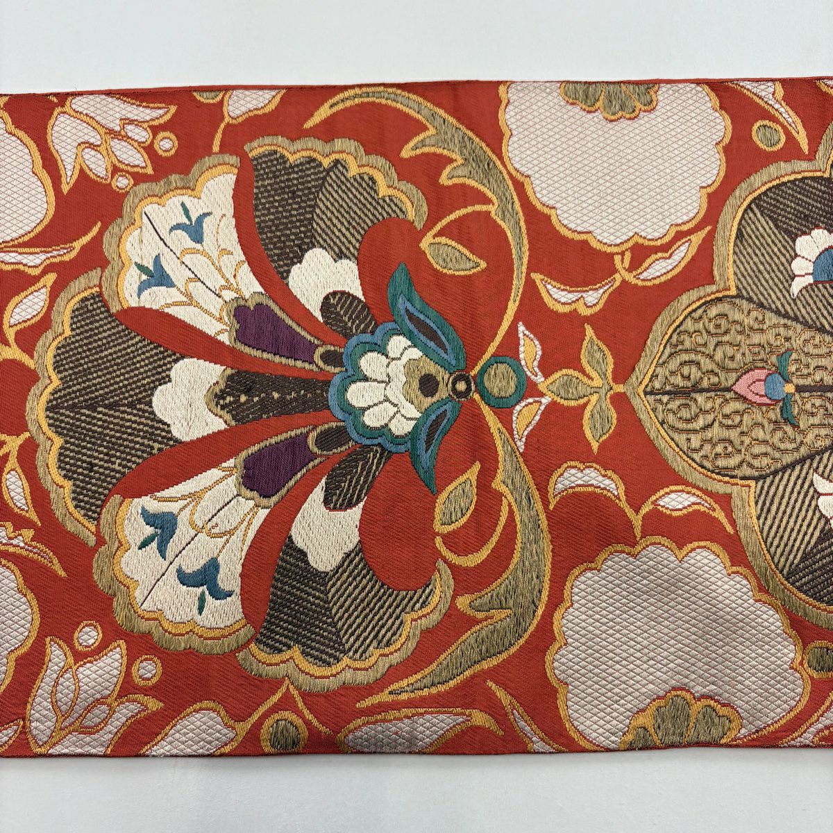 【在庫一掃】 袋帯 逸品 洛風林 落款あり 草花 金糸 刺繍 朱色 全通 正絹
