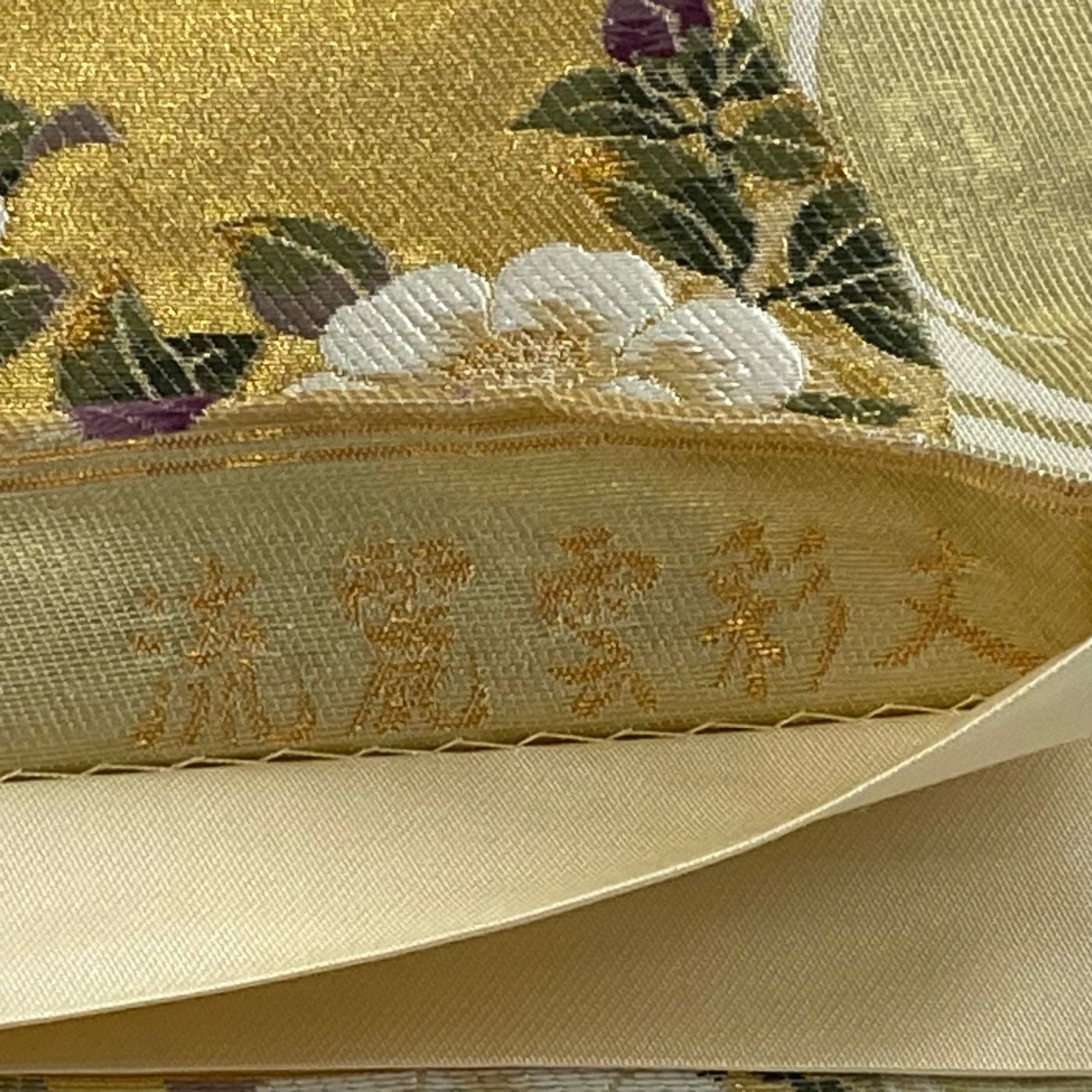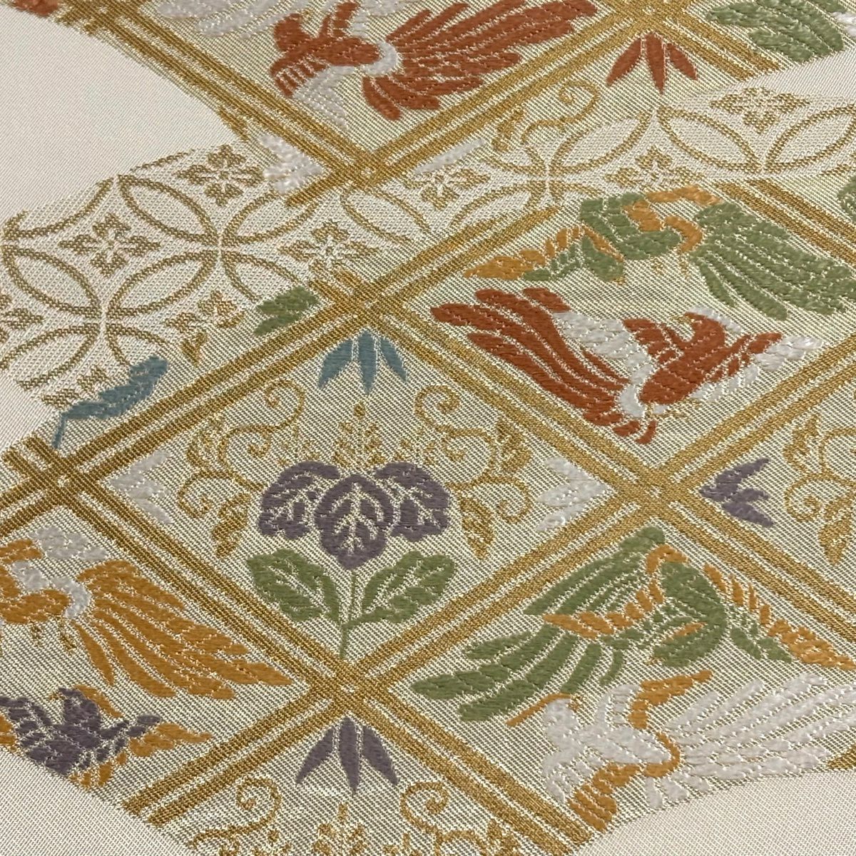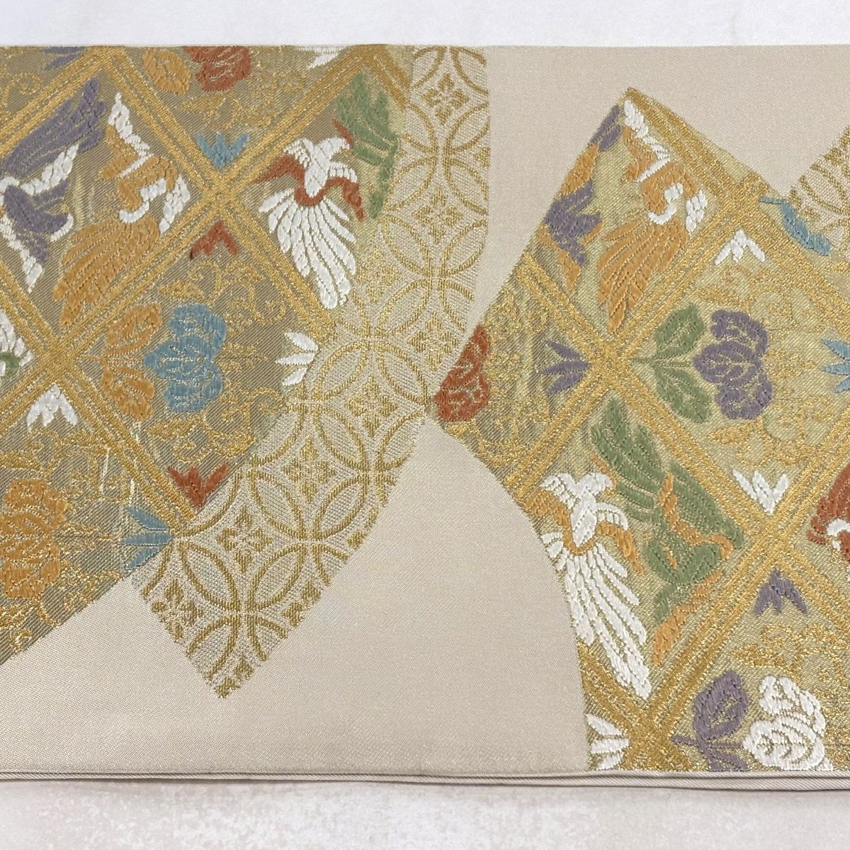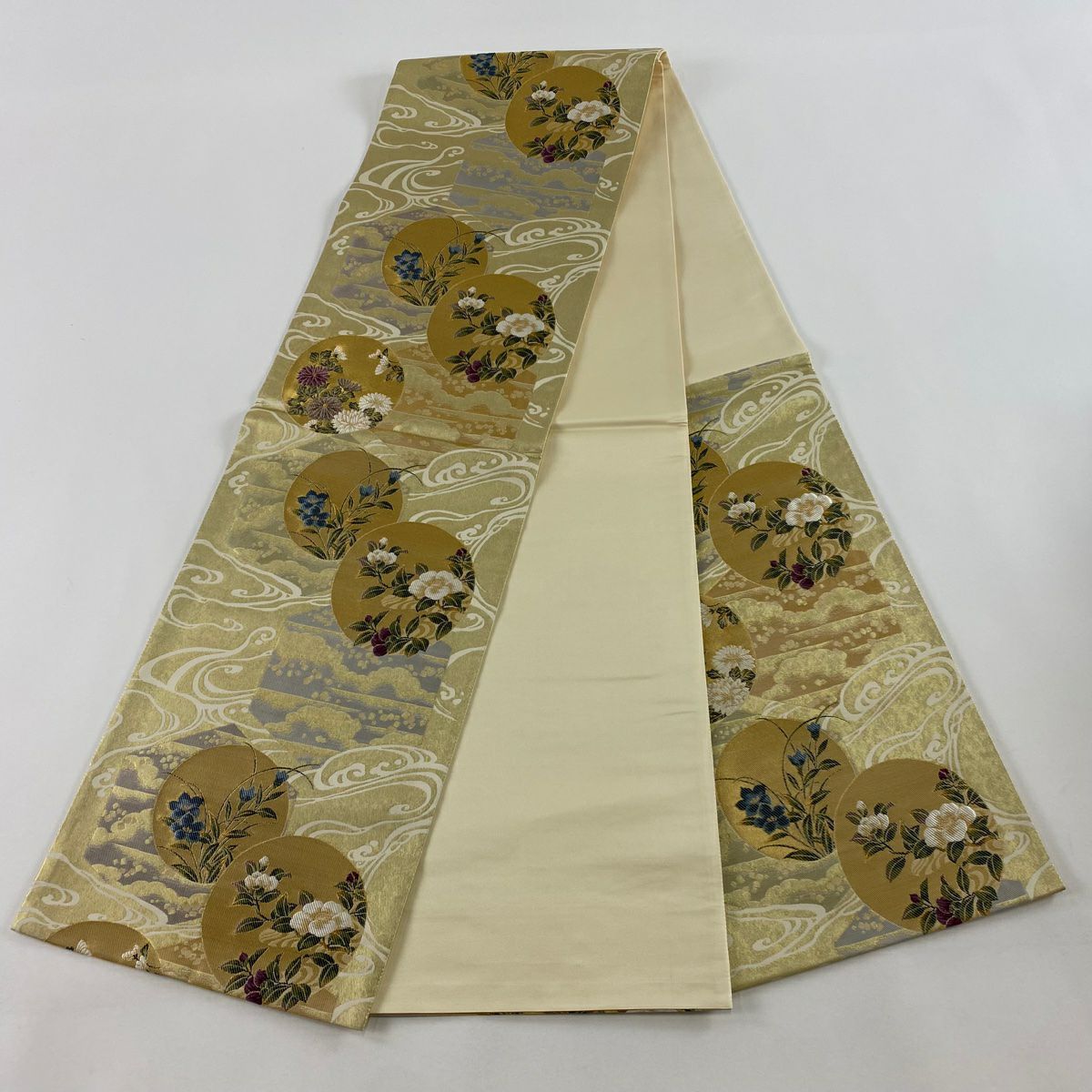 【美品】 袋帯 逸品 鈴乃屋 新小石丸 皇彩花丸文 金糸 クリーム 六通 正絹